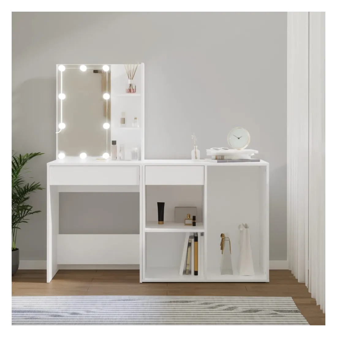 Coiffeuse à LED vraiment simple mais fonctionnelle avec armoire, s'adapte parfaitement à différents types d'intérieurs. Matériau durable : la coiffeuse à LED avec armoire est fabriquée en bois d'ingénierie. Le bois d'ingénierie est d'une qualité exceptionnelle avec une surface lisse et se caractérise également par sa solidité, stabilité et résistance à l'humidité. Lumière LED : la table cosmétique avec armoire dispose d'ampoules LED avec USB, qui sont faciles à changer de mode du blanc chaud au blanc froid. Les ampoules LED autour du miroir illuminent également votre beauté. Grand espace de rangement : la coiffeuse avec armoire de rangement offre un espace de rangement spacieux avec des compartiments, parfait pour organiser votre maquillage, vos accessoires, vos sacs et vos essentiels