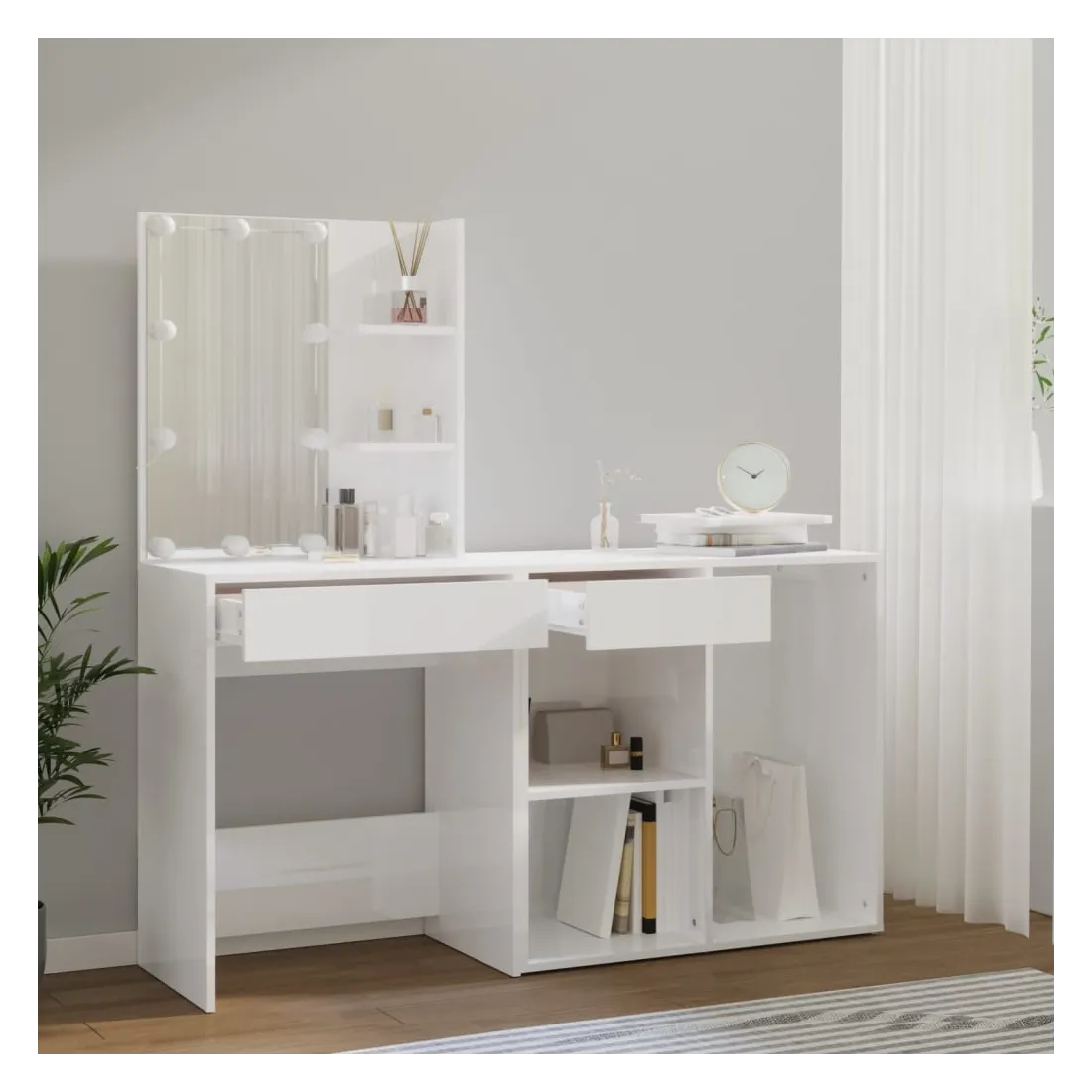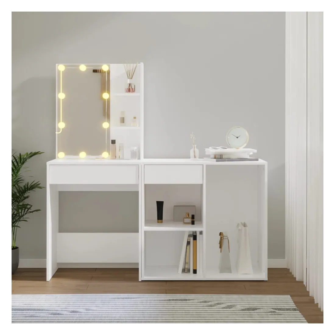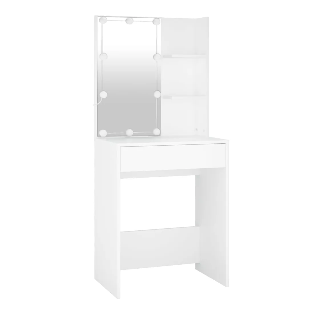 Coiffeuse à LED vraiment simple mais fonctionnelle avec armoire, s'adapte parfaitement à différents types d'intérieurs. Matériau durable : la coiffeuse à LED avec armoire est fabriquée en bois d'ingénierie. Le bois d'ingénierie est d'une qualité exceptionnelle avec une surface lisse et se caractérise également par sa solidité, stabilité et résistance à l'humidité.Lumière LED : la table cosmétique avec armoire dispose d'ampoules LED avec USB, qui sont faciles à changer de mode du blanc chaud au blanc froid. Les ampoules LED autour du miroir illuminent également votre beauté.Grand espace de rangement : la coiffeuse avec armoire de rangement offre un espace de rangement spacieux avec des compartiments, parfait pour organiser votre maquillage, vos accessoires, vos sacs et vos essentiels de beauté. Avertissement :Afin d'éviter qu'il ne bascule, ce produit doit être utilisé avec le dispositif de fixation murale fourni. Remarque :Chaque produit est livré avec un manuel de montage dans la boîte pour un montage facile.