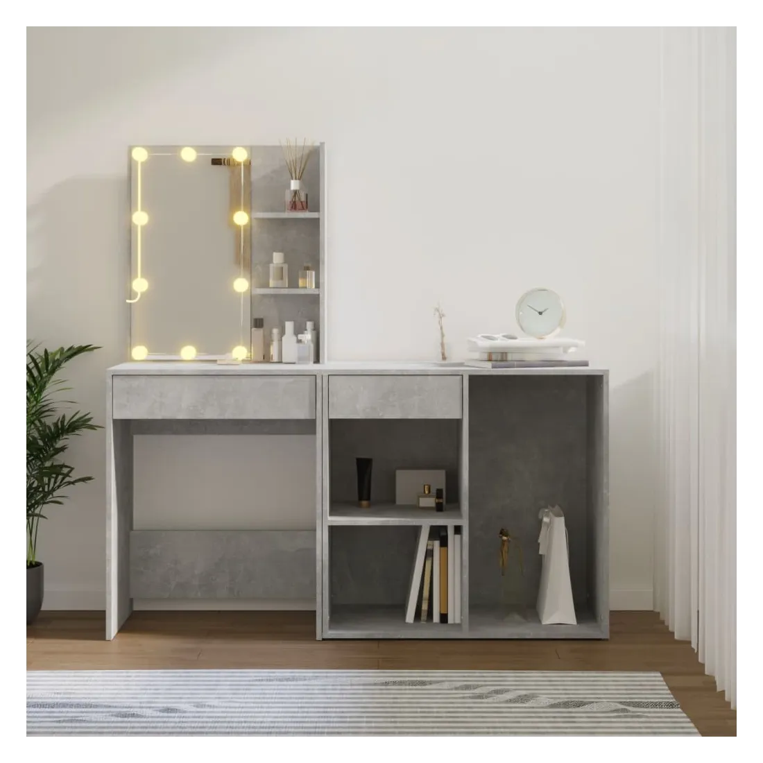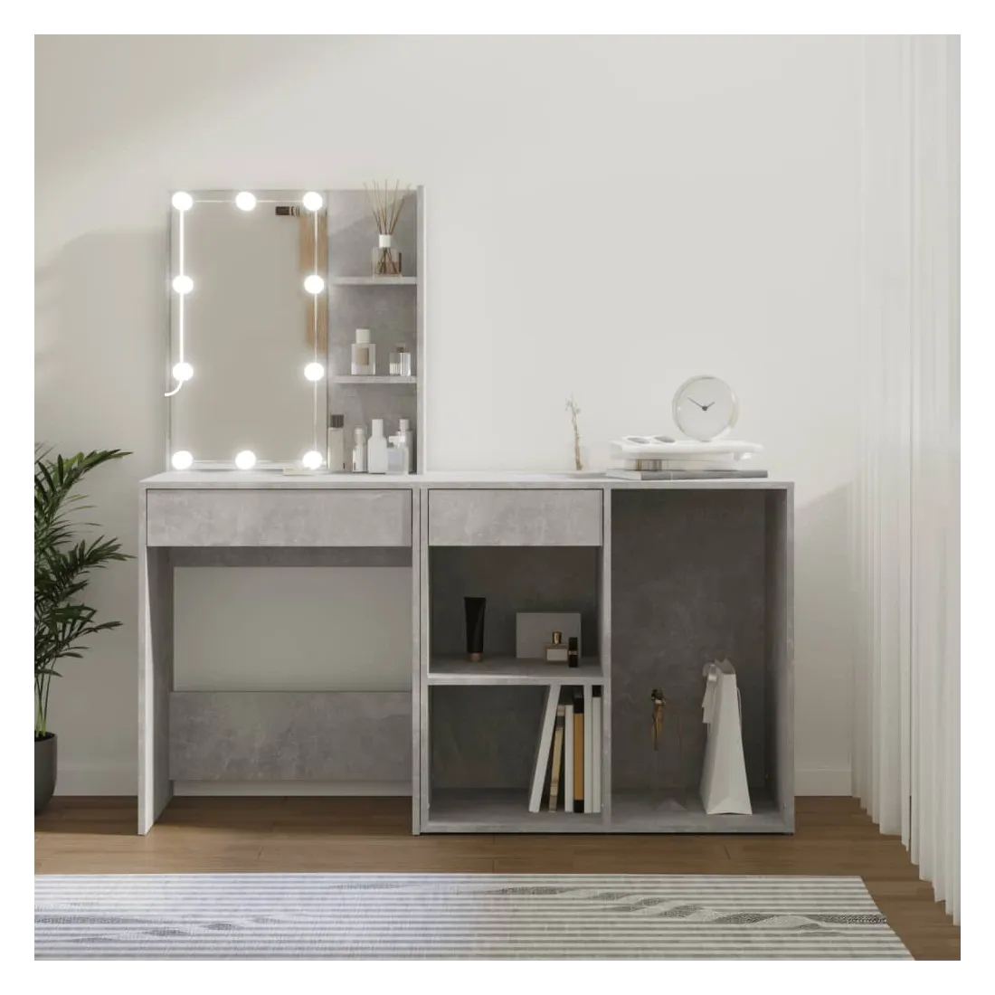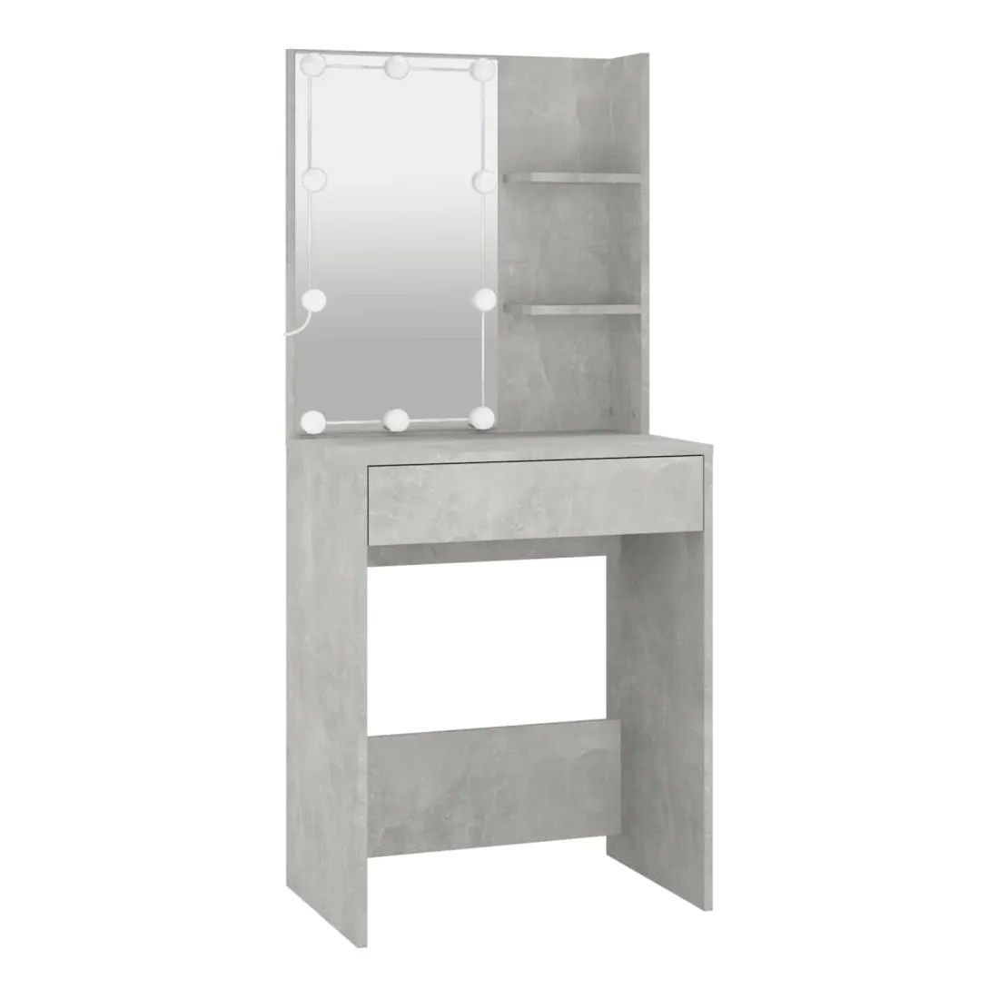 Coiffeuse à LED vraiment simple mais fonctionnelle avec armoire, s'adapte parfaitement à différents types d'intérieurs. Matériau durable : la coiffeuse à LED avec armoire est fabriquée en bois d'ingénierie. Le bois d'ingénierie est d'une qualité exceptionnelle avec une surface lisse et se caractérise également par sa solidité, stabilité et résistance à l'humidité.Lumière LED : la table cosmétique avec armoire dispose d'ampoules LED avec USB, qui sont faciles à changer de mode du blanc chaud au blanc froid. Les ampoules LED autour du miroir illuminent également votre beauté.Grand espace de rangement : la coiffeuse avec armoire de rangement offre un espace de rangement spacieux avec des compartiments, parfait pour organiser votre maquillage, vos accessoires, vos sacs et vos essentiels de beauté. Avertissement :Afin d'éviter qu'il ne bascule, ce produit doit être utilisé avec le dispositif de fixation murale fourni. Remarque :Chaque produit est livré avec un manuel de montage dans la boîte pour un montage facile.