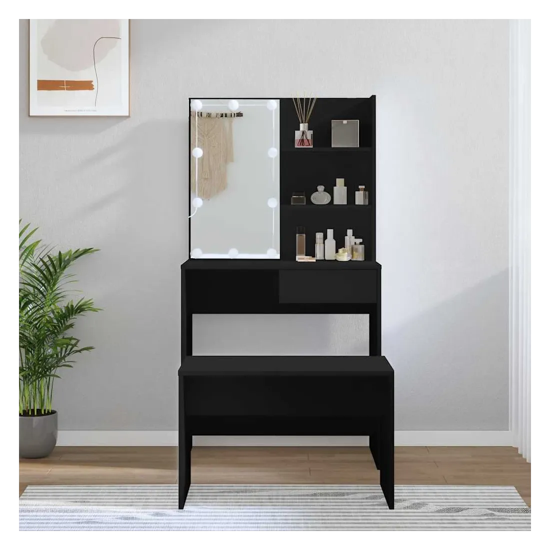 L'ensemble de coiffeuse tendance donne à votre chambre à coucher un look intemporel et raffiné. L'ensemble de coiffeuse avec LED est un supplément parfait au décor de votre chambre à coucher et garde vos cosmétiques à portée de main ! Matériau stable : le bois d'ingénierie est d'une qualité exceptionnelle avec une surface lisse et présente également résistance, stabilité et résistance à l'humidité.Miroir utilitaire : la coiffeuse avec miroir est parfaite pour votre routine beauté quotidienne. Le miroir vous permet de prendre soin de la peau de votre visage et de vous maquiller aussi !Grand espace de rangement : la coiffeuse avec tabouret offre suffisamment d'espace pour un accès facile à votre maquillage, vos bijoux et vos essentiels du quotidien.Lumière LED : la coiffeuse dispose également d'ampoules LED avec USB, qui sont faciles à changer de mode du blanc chaud au blanc froid. Les ampoules LED autour du miroir illuminent également votre beauté.Applications larges : cet ensemble de table de coiffeuse convient à divers endroits, telles que votre chambre à coucher, vestiaire et toute autre pièce dans laquelle vous souhaitez le placer. Attention :Pour éviter qu'il ne soit renversé, ce produit doit être utilisé avec le dispositif de fixation au mur fourni.