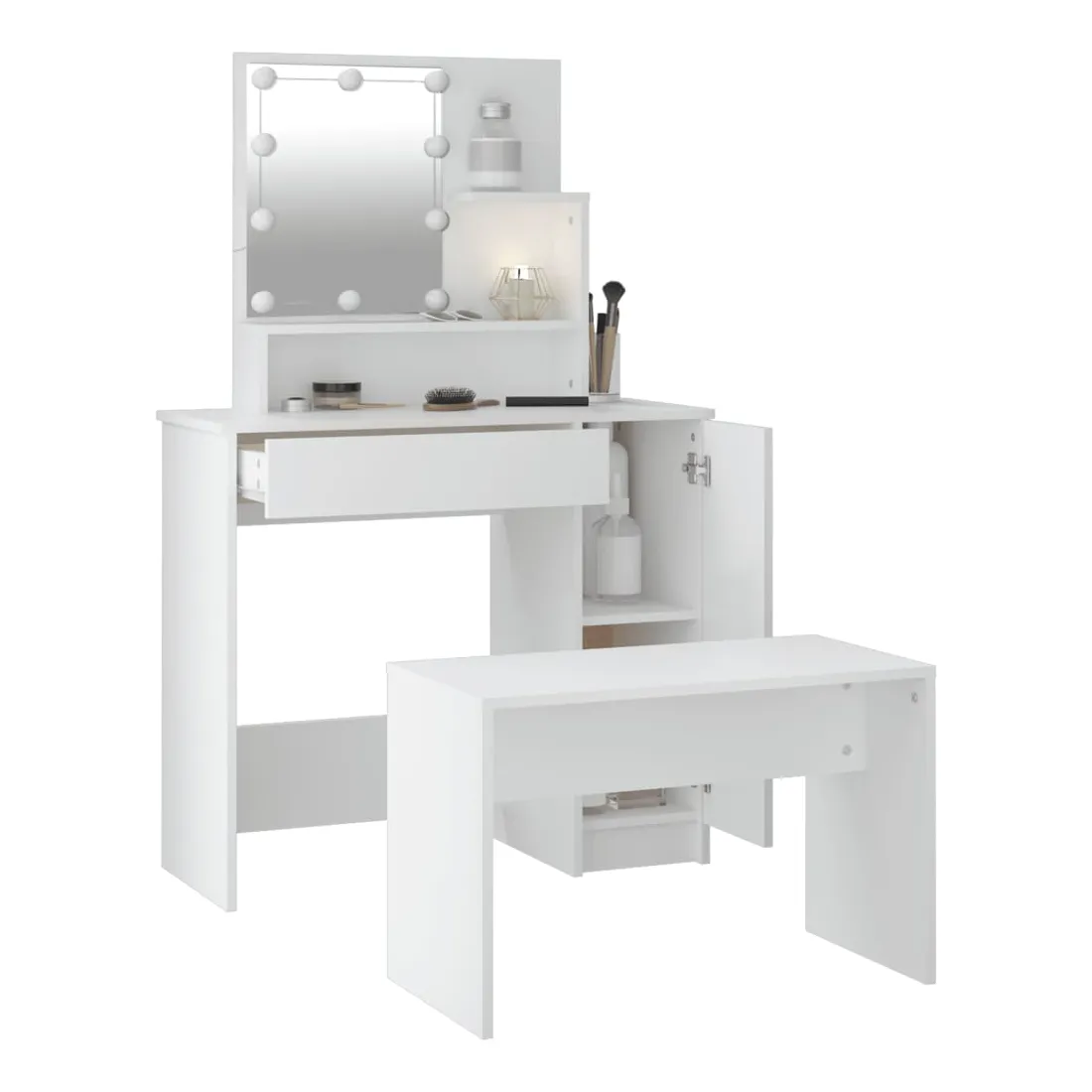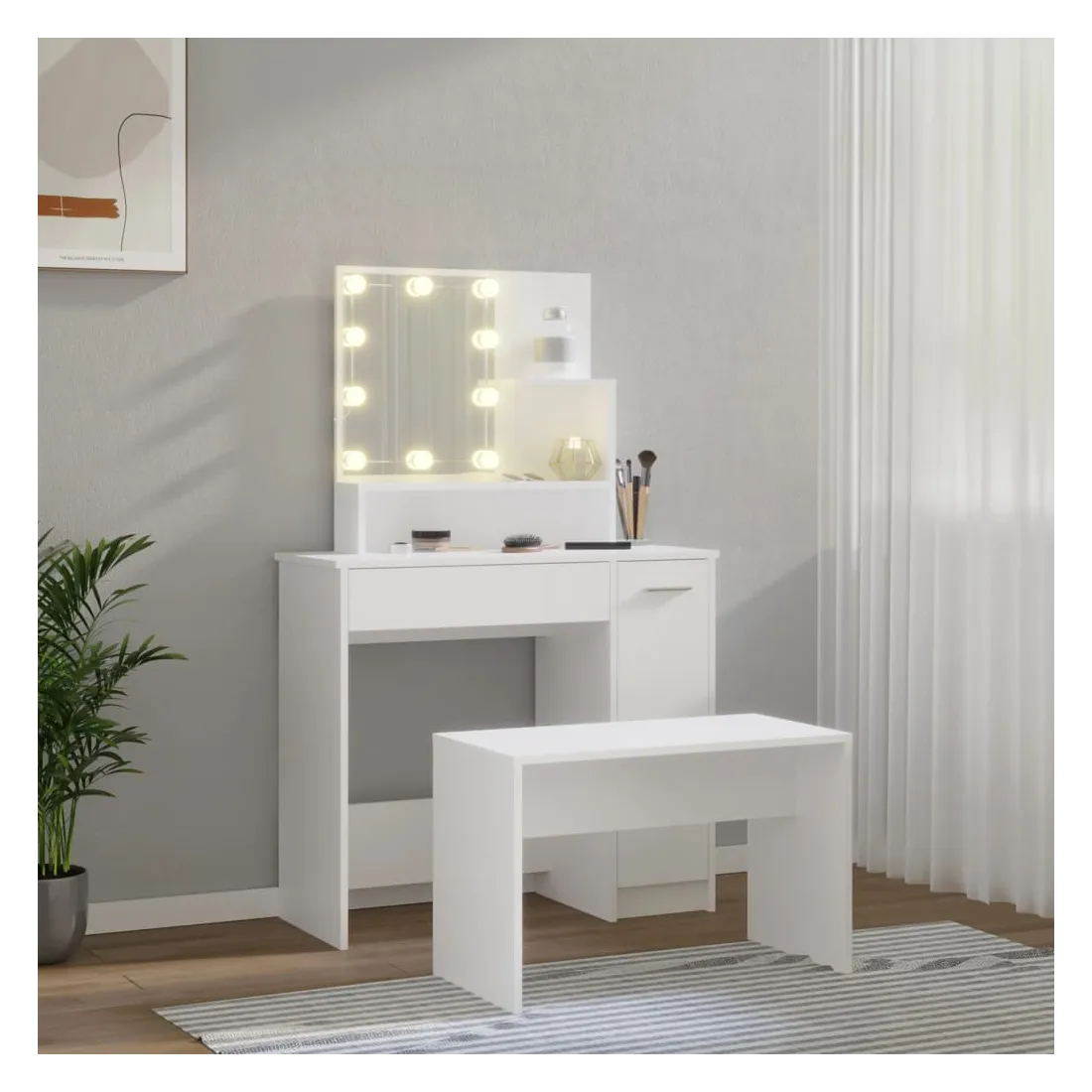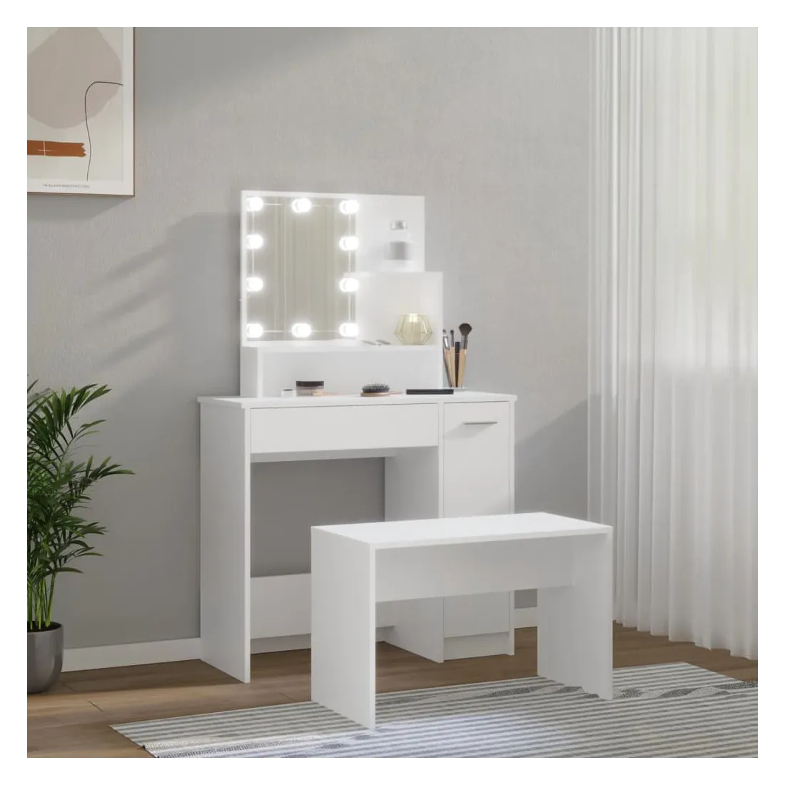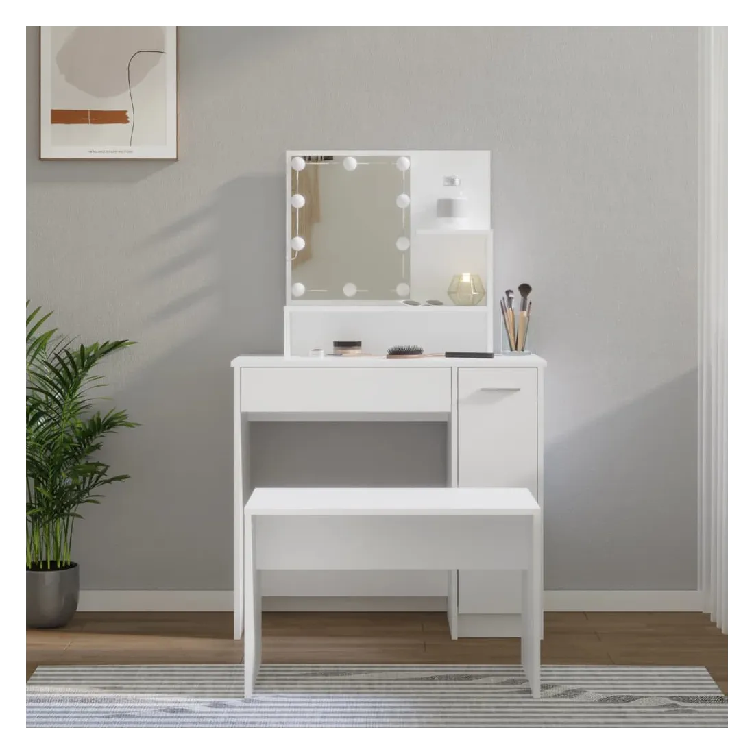 L'ensemble de coiffeuse tendance donne à votre chambre à coucher un look intemporel et raffiné. L'ensemble de coiffeuse avec LED est un supplément parfait au décor de votre chambre à coucher et garde vos cosmétiques à portée de main ! Matériau stable : le bois d'ingénierie est d'une qualité exceptionnelle avec une surface lisse et présente également résistance, stabilité et résistance à l'humidité.Miroir utilitaire : la coiffeuse avec miroir est parfaite pour votre routine beauté quotidienne. Le miroir vous permet de prendre soin de la peau de votre visage et de vous maquiller aussi !Grand espace de rangement : la coiffeuse avec tabouret offre suffisamment d'espace pour un accès facile à votre maquillage, vos bijoux et vos essentiels du quotidien.Lumière LED : la coiffeuse dispose également d'ampoules LED avec USB, qui sont faciles à changer de mode du blanc chaud au blanc froid. Les ampoules LED autour du miroir illuminent également votre beauté.Applications larges : cet ensemble de table de coiffeuse convient à divers endroits, telles que votre chambre à coucher, vestiaire et toute autre pièce dans laquelle vous souhaitez le placer. Avertissement :Afin d'éviter qu'il ne bascule, ce produit doit être utilisé avec le dispositif de fixation murale fourni. Remarque :Chaque produit est livré avec un manuel de montage dans la boîte pour un montage facile.