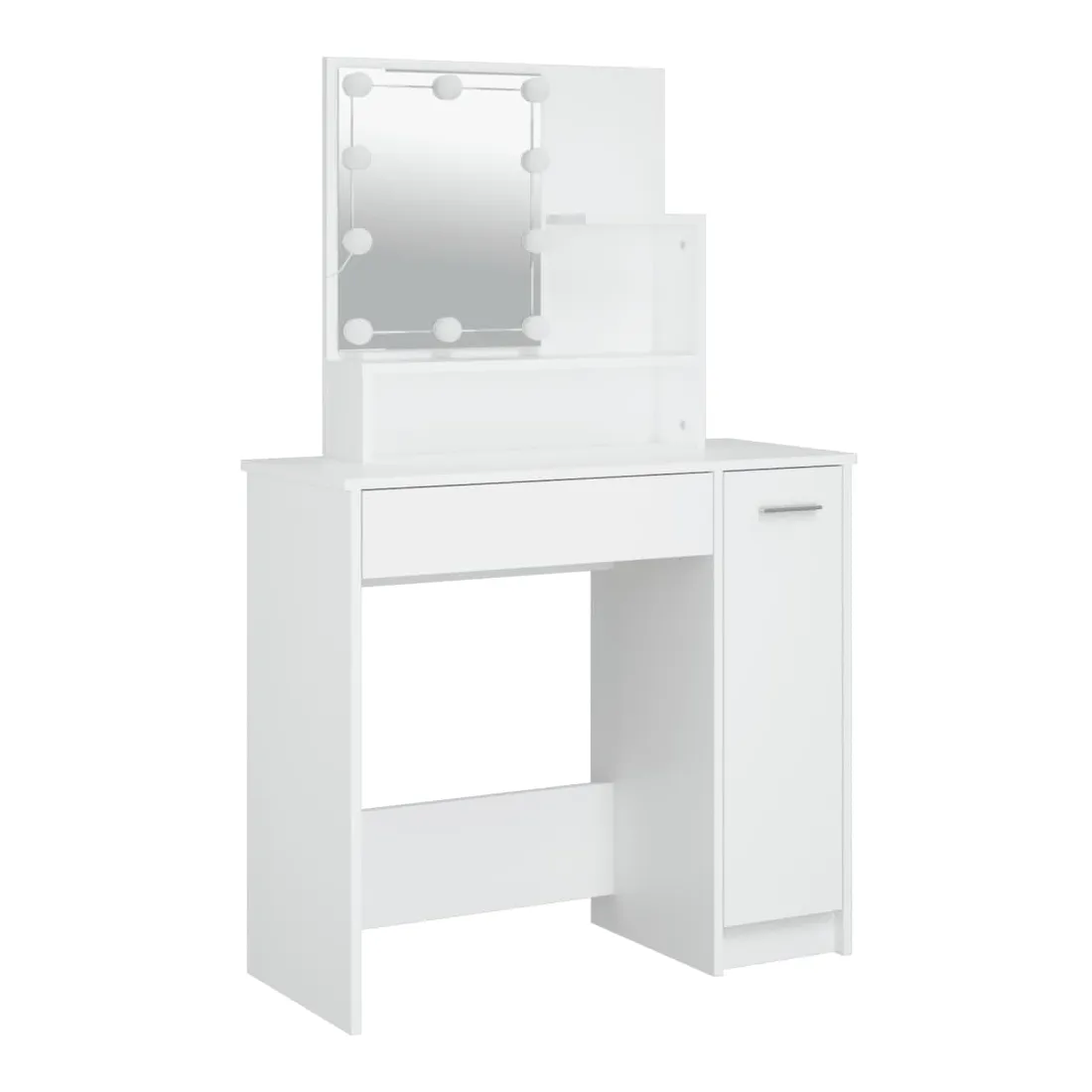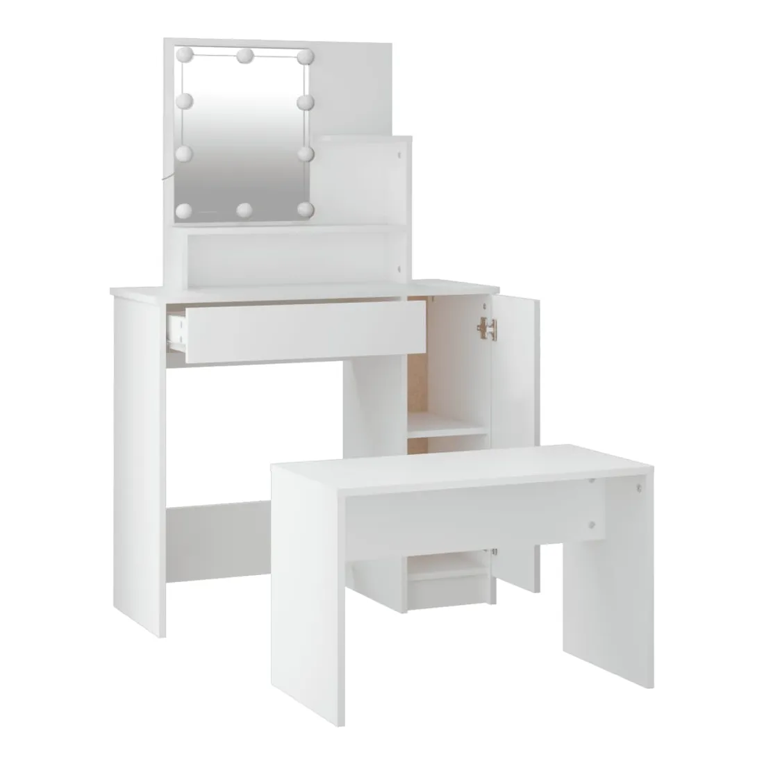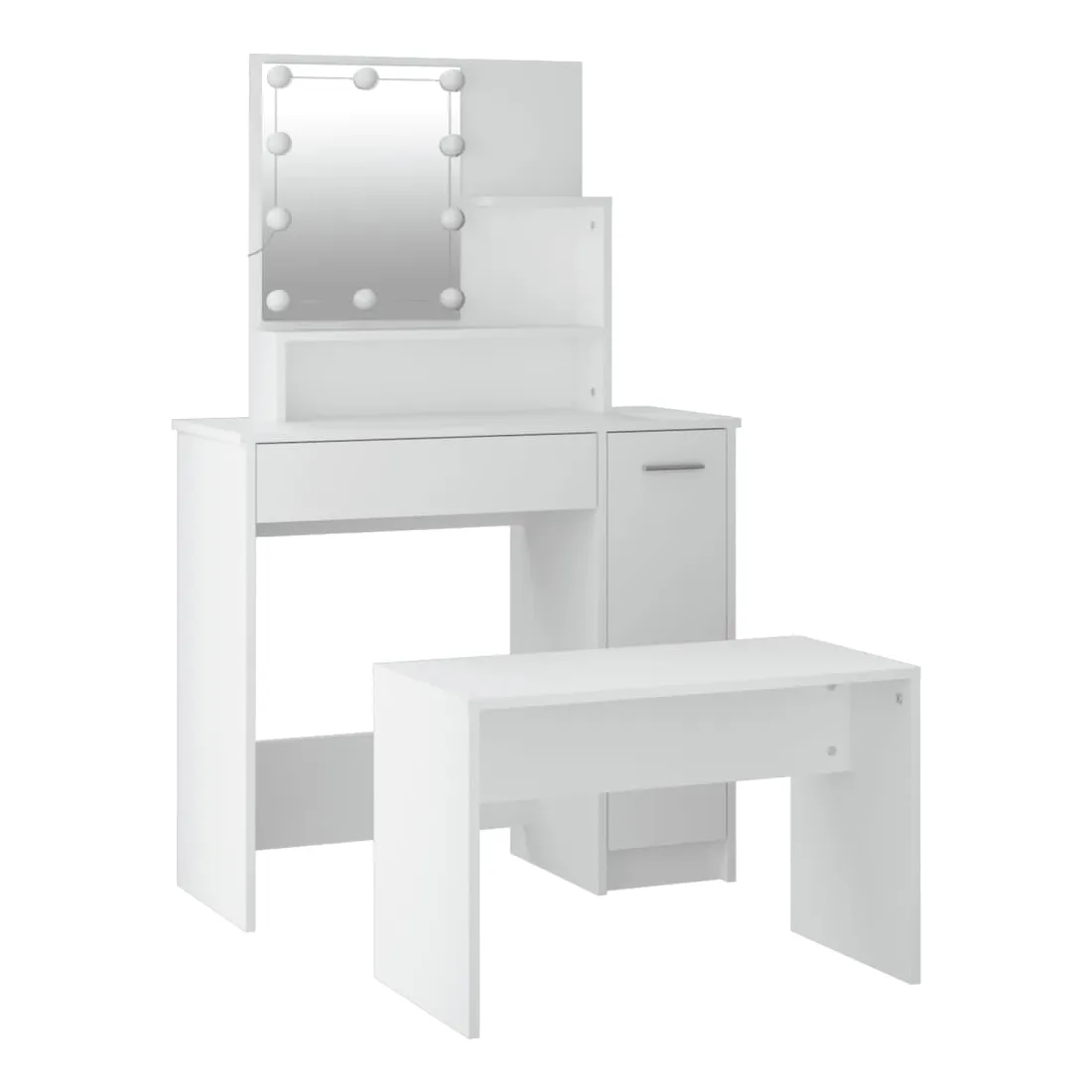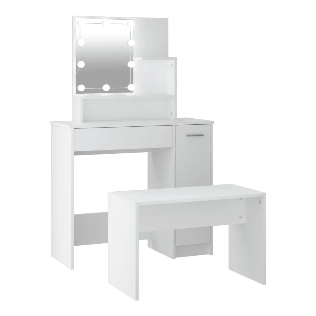 L'ensemble de coiffeuse tendance donne à votre chambre à coucher un look intemporel et raffiné. L'ensemble de coiffeuse avec LED est un supplément parfait au décor de votre chambre à coucher et garde vos cosmétiques à portée de main ! Matériau stable : le bois d'ingénierie est d'une qualité exceptionnelle avec une surface lisse et présente également résistance, stabilité et résistance à l'humidité.Miroir utilitaire : la coiffeuse avec miroir est parfaite pour votre routine beauté quotidienne. Le miroir vous permet de prendre soin de la peau de votre visage et de vous maquiller aussi !Grand espace de rangement : la coiffeuse avec tabouret offre suffisamment d'espace pour un accès facile à votre maquillage, vos bijoux et vos essentiels du quotidien.Lumière LED : la coiffeuse dispose également d'ampoules LED avec USB, qui sont faciles à changer de mode du blanc chaud au blanc froid. Les ampoules LED autour du miroir illuminent également votre beauté.Applications larges : cet ensemble de table de coiffeuse convient à divers endroits, telles que votre chambre à coucher, vestiaire et toute autre pièce dans laquelle vous souhaitez le placer. Avertissement :Afin d'éviter qu'il ne bascule, ce produit doit être utilisé avec le dispositif de fixation murale fourni. Remarque :Chaque produit est livré avec un manuel de montage dans la boîte pour un montage facile.