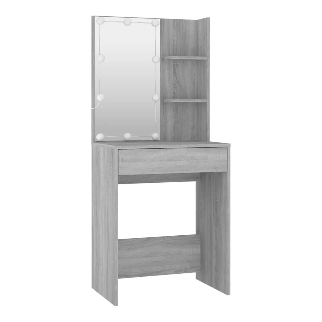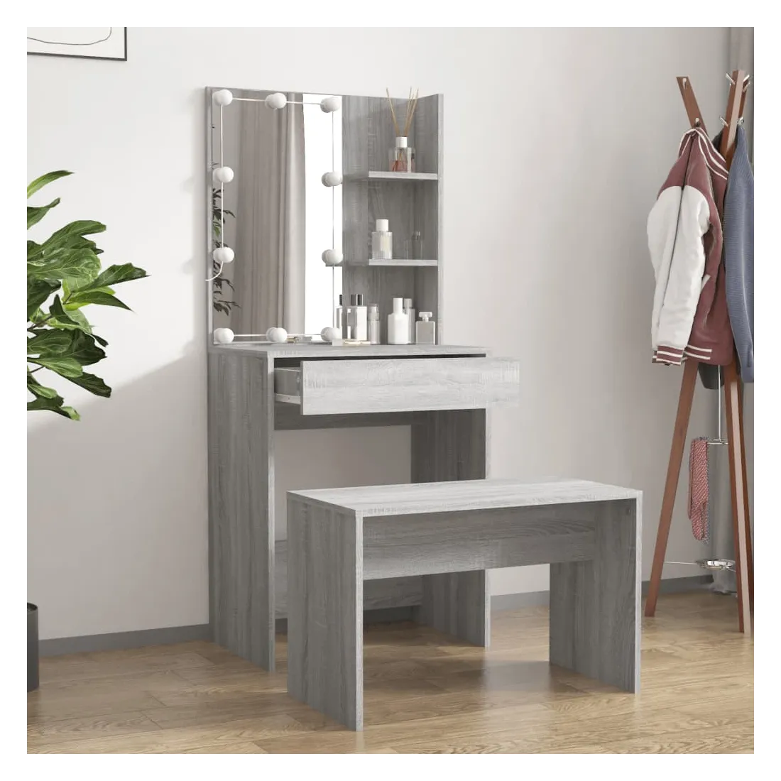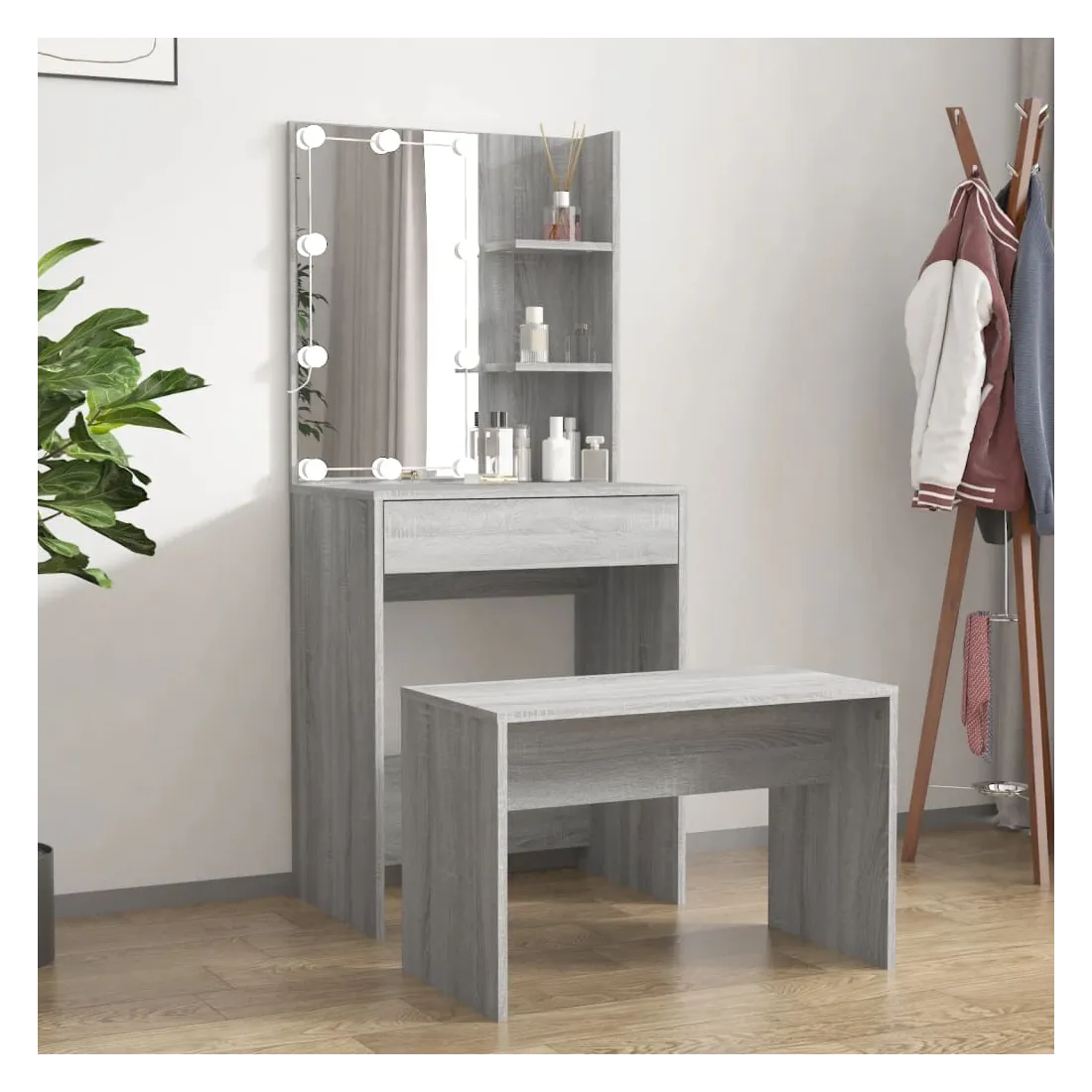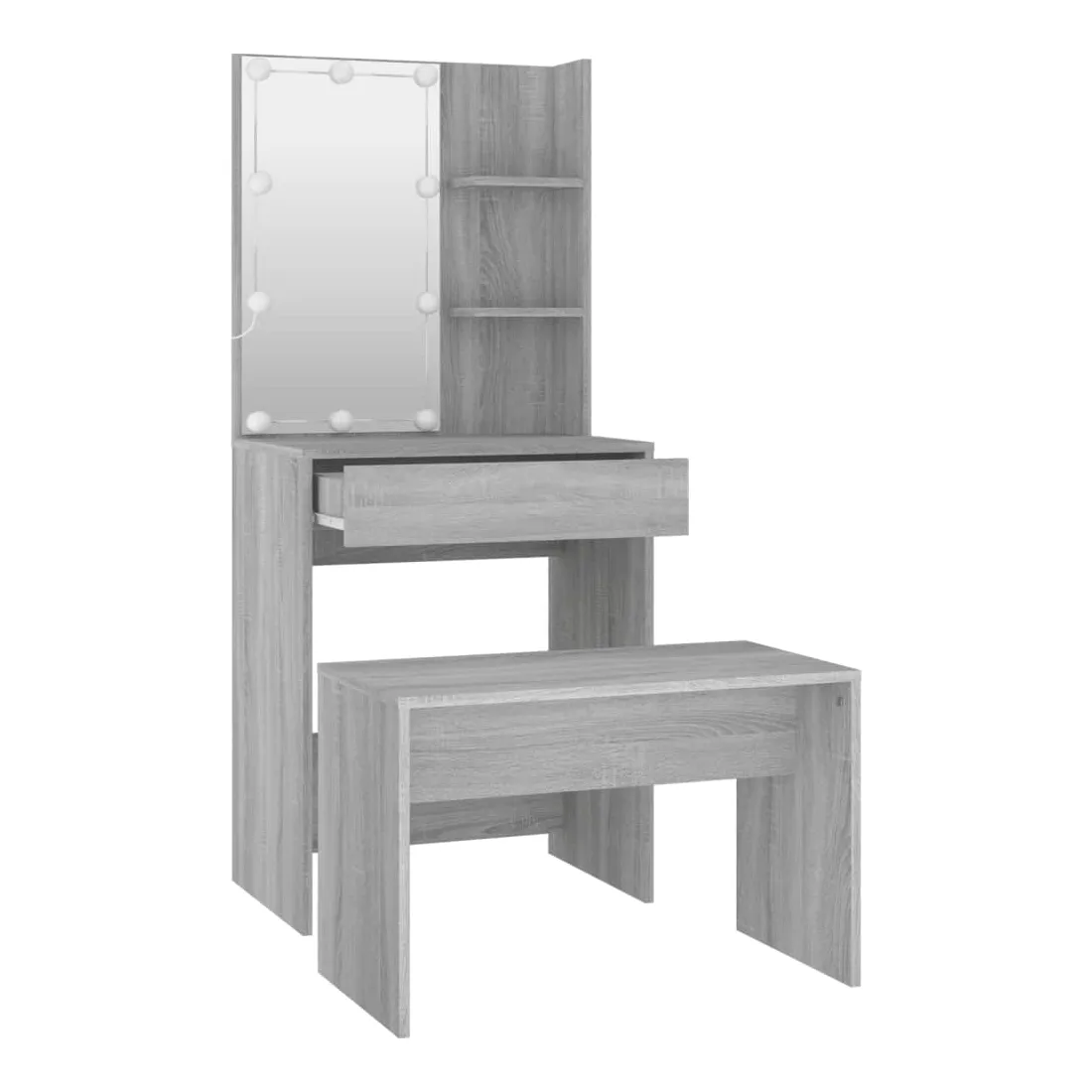 L'ensemble de coiffeuse tendance donne à votre chambre à coucher un look intemporel et raffiné. L'ensemble de coiffeuse avec LED est un supplément parfait au décor de votre chambre à coucher et garde vos cosmétiques à portée de main ! Matériau stable : le bois d'ingénierie est d'une qualité exceptionnelle avec une surface lisse et présente également résistance, stabilité et résistance à l'humidité.Miroir utilitaire : la coiffeuse avec miroir est parfaite pour votre routine beauté quotidienne. Le miroir vous permet de prendre soin de la peau de votre visage et de vous maquiller aussi !Grand espace de rangement : la coiffeuse avec tabouret offre suffisamment d'espace pour un accès facile à votre maquillage, vos bijoux et vos essentiels du quotidien.Lumière LED : la coiffeuse dispose également d'ampoules LED avec USB, qui sont faciles à changer de mode du blanc chaud au blanc froid. Les ampoules LED autour du miroir illuminent également votre beauté.Applications larges : cet ensemble de table de coiffeuse convient à divers endroits, telles que votre chambre à coucher, vestiaire et toute autre pièce dans laquelle vous souhaitez le placer. Avertissement :Afin d'éviter qu'il ne bascule, ce produit doit être utilisé avec le dispositif de fixation murale fourni. Remarque :Chaque produit est livré avec un manuel de montage dans la boîte pour un montage facile.