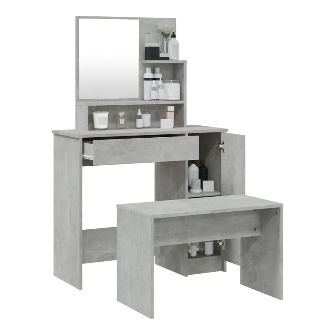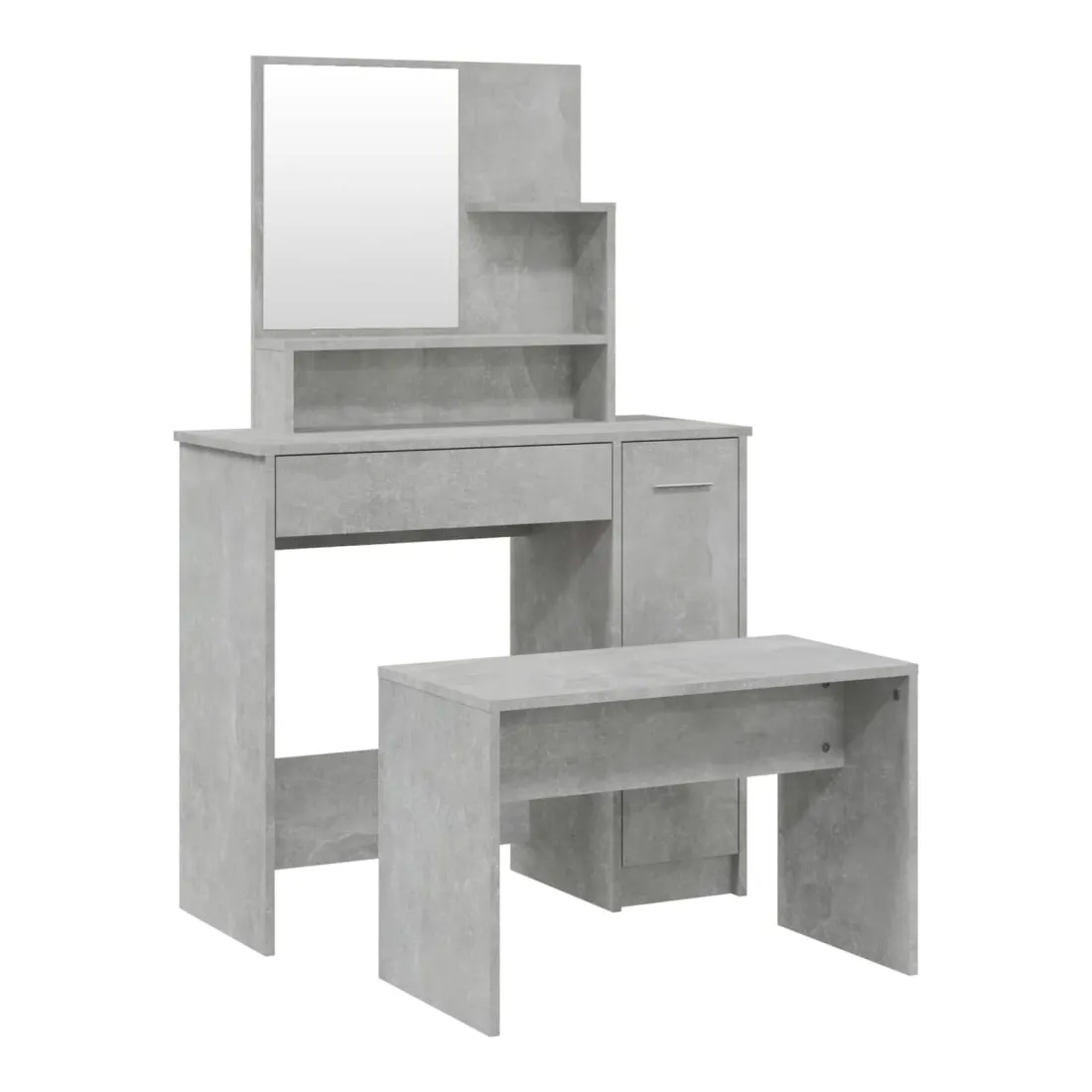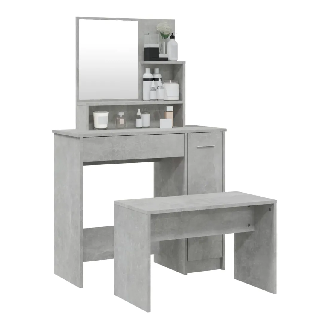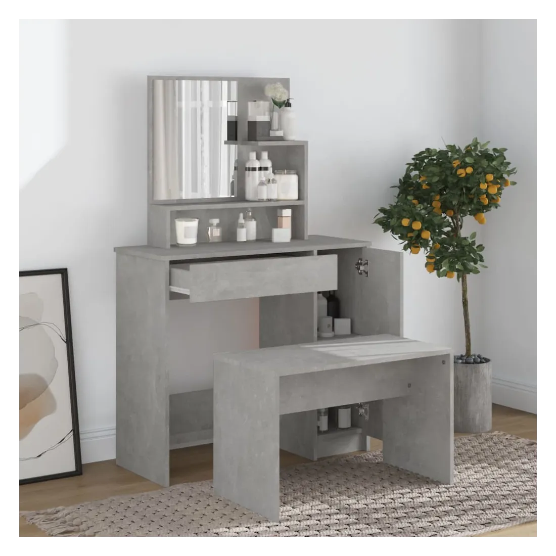 L'ensemble de coiffeuse tendance donne à votre chambre à coucher un look intemporel et raffiné. La coiffeuse avec tabouret est un supplément parfait au décor de votre chambre à coucher et garde vos cosmétiques à portée de main ! Matériau stable : le bois d'ingénierie est d'une qualité exceptionnelle avec une surface lisse et présente également résistance, stabilité et résistance à l'humidité.Grand espace de rangement : la table de maquillage offre suffisamment d'espace pour accéder facilement à vos produits de maquillage, bijoux et articles essentiels du quotidien.Miroir utilitaire : la coiffeuse avec le miroir est parfaite pour votre routine beauté quotidienne. Le miroir vous permet de prendre soin de votre peau faciale et de faire également votre maquillage !Applications larges : cet ensemble de table de coiffeuse convient à divers endroits, telles que votre chambre à coucher, vestiaire et toute autre pièce dans laquelle vous souhaitez le placer.Design moderne : le design moderne présente des lignes épurées et des looks minimalistes dans le cadre du style de design d'intérieur. Avertissement :Afin d'éviter qu'il ne bascule, ce produit doit être utilisé avec le dispositif de fixation murale fourni. Remarque :Chaque produit est livré avec un manuel de montage dans la boîte pour un montage facile.