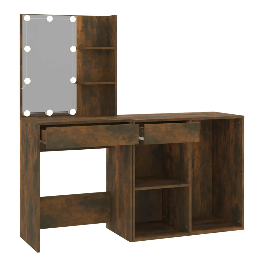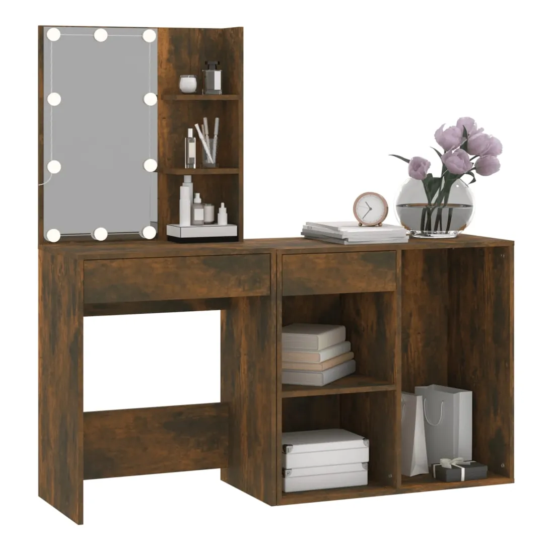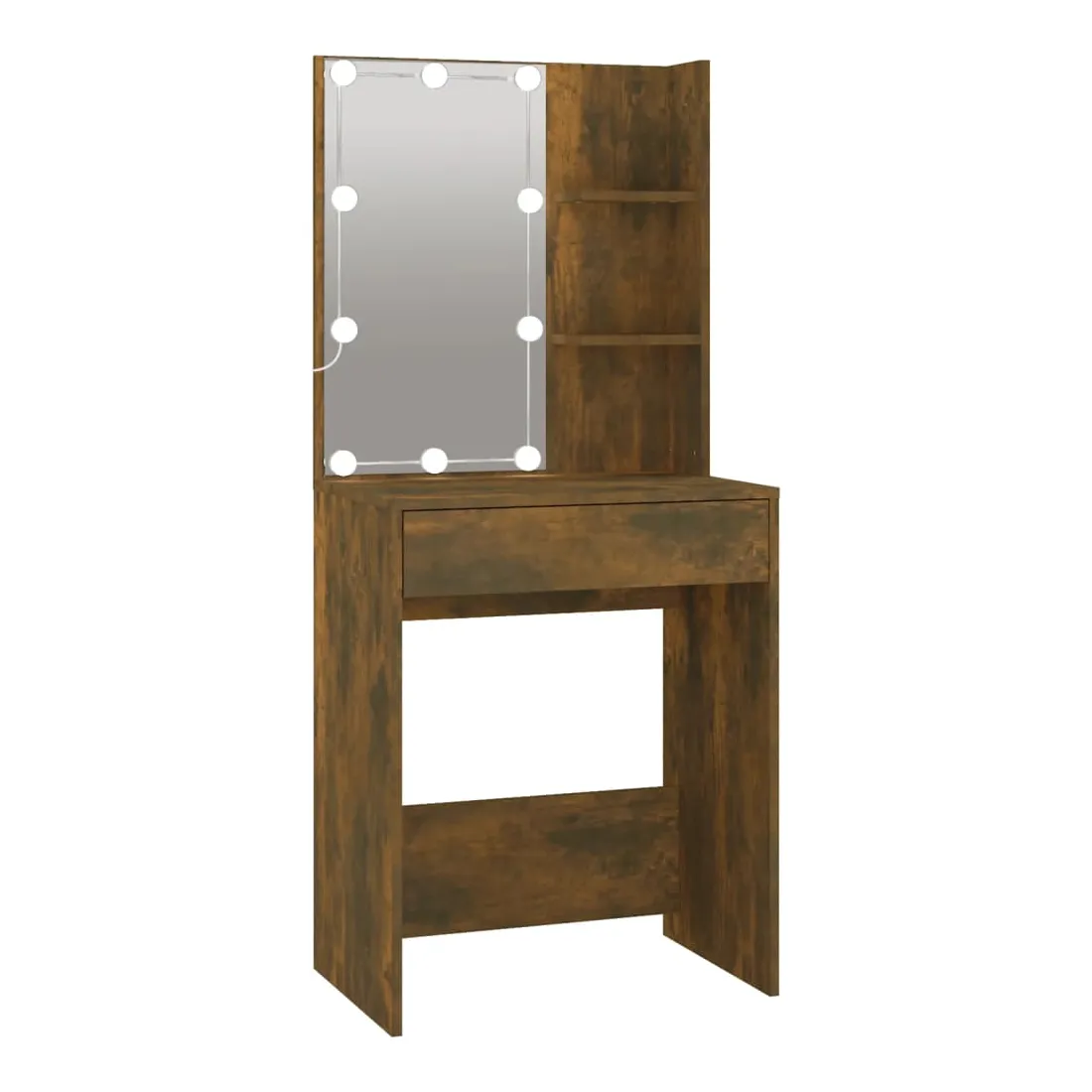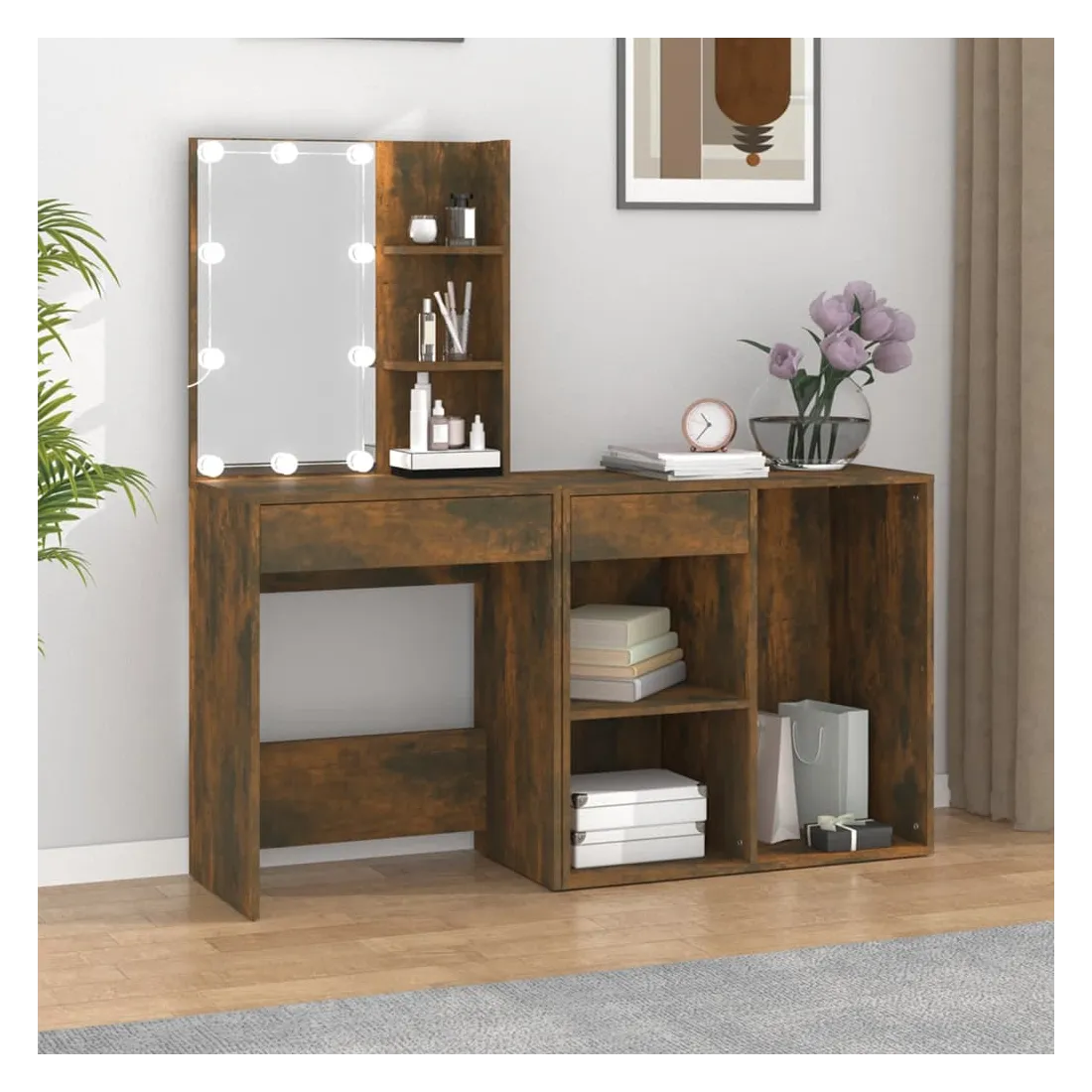 La coiffeuse à LED tendance avec armoire donne à votre chambre un look intemporel et raffiné. C’est un supplément parfait à la décoration de votre chambre à coucher et garde également vos cosmétiques à portée de main! Matériau stable : le bois d'ingénierie est d'une qualité exceptionnelle avec une surface lisse et présente également résistance, stabilité et résistance à l'humidité.Miroir utilitaire : la coiffeuse avec miroir est parfaite pour votre routine beauté quotidienne. Le miroir vous permet de prendre soin de la peau de votre visage et de vous maquiller aussi !Lumière LED : la coiffeuse avec rangement dispose également d'ampoules LED avec USB, qui sont faciles à changer de mode du blanc chaud au blanc froid. Les ampoules LED autour du miroir illuminent également votre beauté.Grand espace de rangement : la coiffeuse avec tabouret offre suffisamment d'espace pour un accès facile à votre maquillage, vos bijoux et vos essentiels du quotidien.Applications larges : cet ensemble de table de coiffeuse convient à divers endroits, telles que votre chambre à coucher, vestiaire et toute autre pièce dans laquelle vous souhaitez le placer. ATTENTION :Afin d'éviter qu'il ne bascule, ce produit doit être utilisé avec le dispositif de fixation murale fourni. Remarque :Chaque produit est livré avec un manuel de montage dans la boîte pour un montage facile.