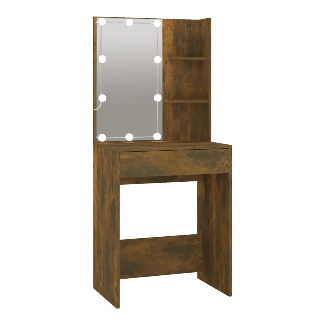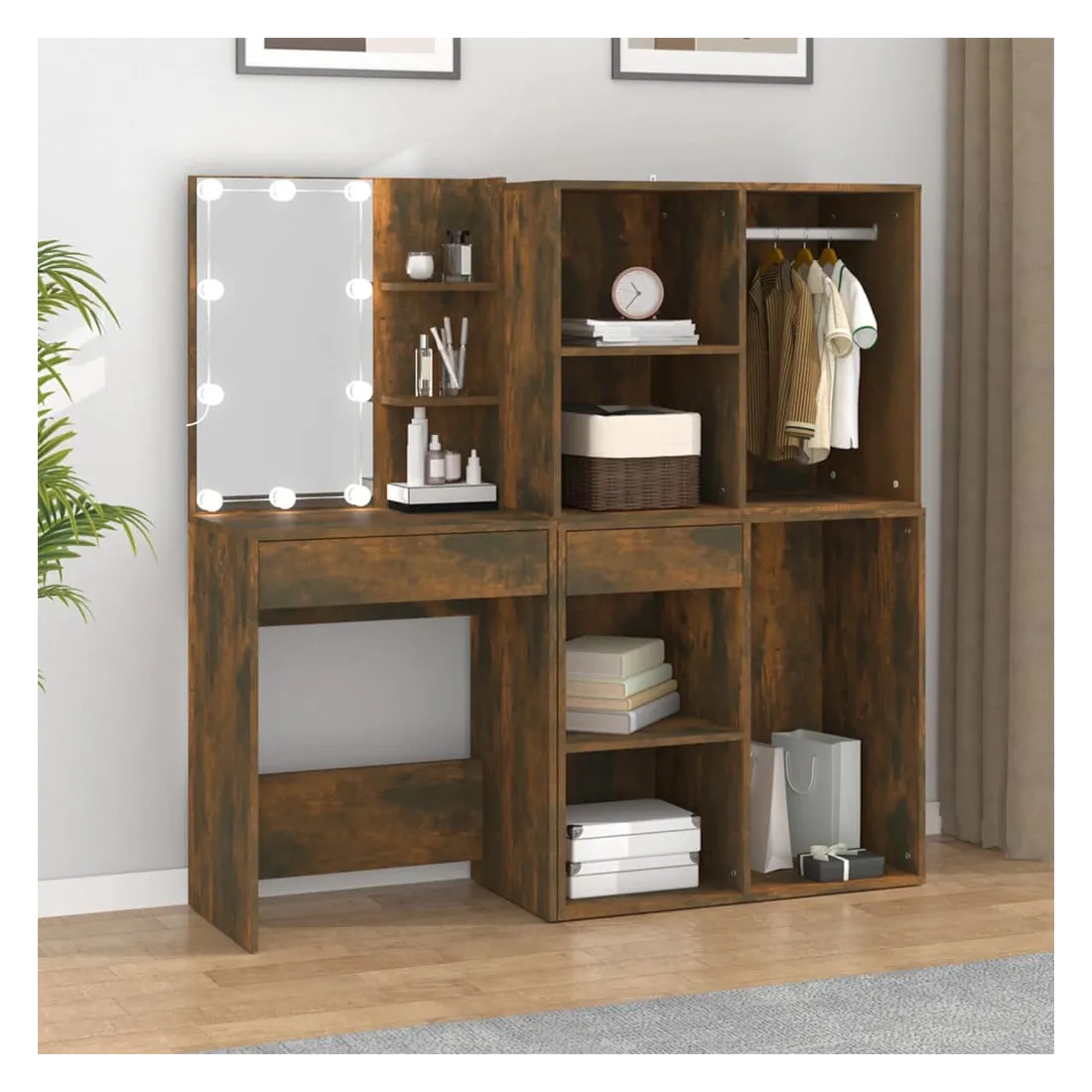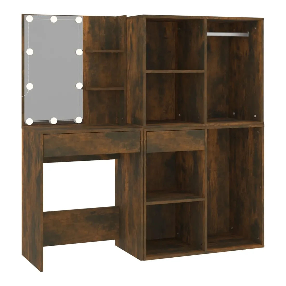 La coiffeuse à LED tendance avec armoires donne à votre chambre un look intemporel et raffiné. C’est un supplément parfait à la décoration de votre chambre à coucher et garde également vos cosmétiques à portée de main! Matériau stable : le bois d'ingénierie est d'une qualité exceptionnelle avec une surface lisse et présente également résistance, stabilité et résistance à l'humidité.Miroir utilitaire : la coiffeuse avec miroir est parfaite pour votre routine beauté quotidienne. Le miroir vous permet de prendre soin de la peau de votre visage et de vous maquiller aussi !Lumière LED : la coiffeuse avec rangement dispose également d'ampoules LED avec USB, qui sont faciles à changer de mode du blanc chaud au blanc froid. Les ampoules LED autour du miroir illuminent également votre beauté.Grand espace de rangement : la coiffeuse avec tabouret offre suffisamment d'espace pour un accès facile à votre maquillage, vos bijoux et vos essentiels du quotidien.Applications larges : cet ensemble de table de coiffeuse convient à divers endroits, telles que votre chambre à coucher, vestiaire et toute autre pièce dans laquelle vous souhaitez le placer. ATTENTION :Afin d'éviter qu'il ne bascule, ce produit doit être utilisé avec le dispositif de fixation murale fourni. Remarque :Chaque produit est livré avec un manuel de montage dans la boîte pour un montage facile.