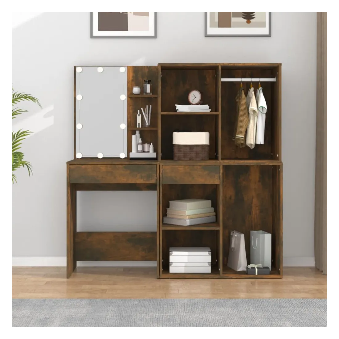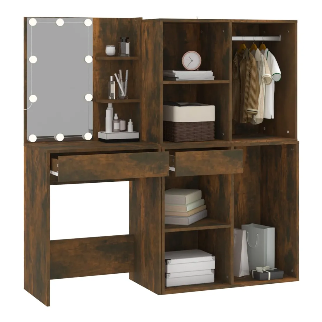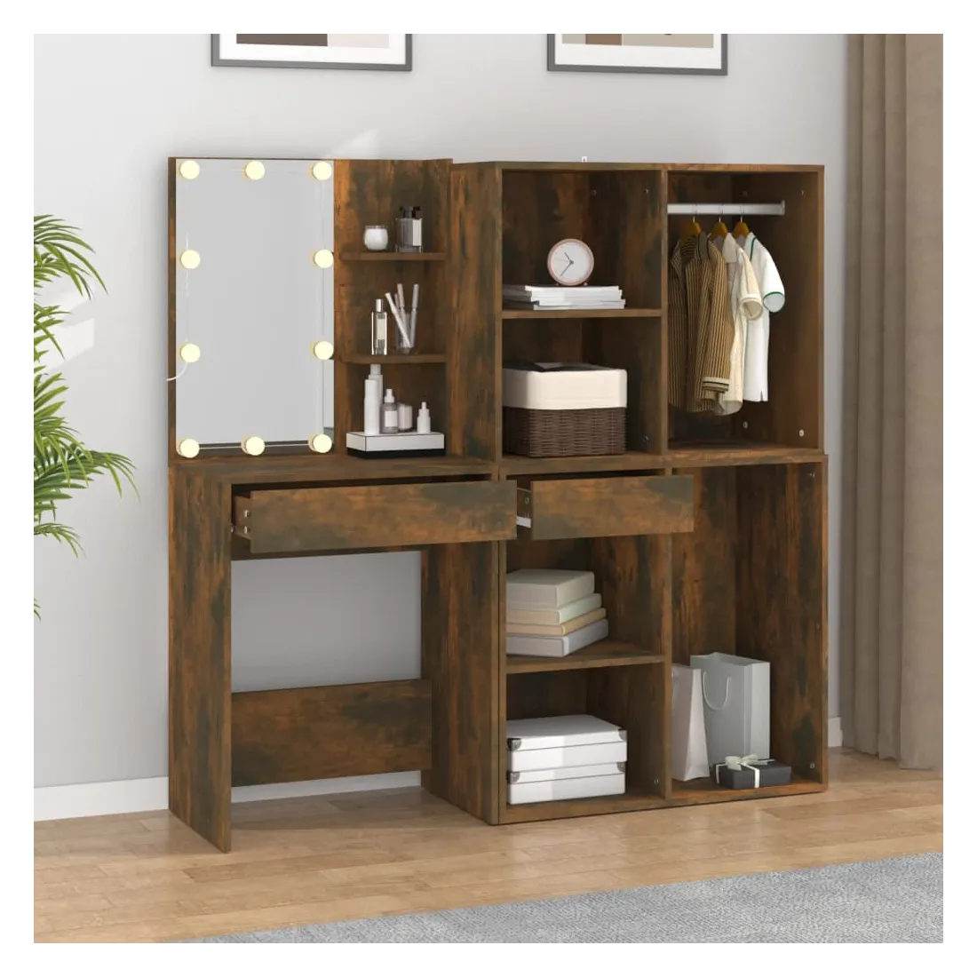 La coiffeuse à LED tendance avec armoires donne à votre chambre un look intemporel et raffiné. C’est un supplément parfait à la décoration de votre chambre à coucher et garde également vos cosmétiques à portée de main! Matériau stable : le bois d'ingénierie est d'une qualité exceptionnelle avec une surface lisse et présente également résistance, stabilité et résistance à l'humidité.Miroir utilitaire : la coiffeuse avec miroir est parfaite pour votre routine beauté quotidienne. Le miroir vous permet de prendre soin de la peau de votre visage et de vous maquiller aussi !Lumière LED : la coiffeuse avec rangement dispose également d'ampoules LED avec USB, qui sont faciles à changer de mode du blanc chaud au blanc froid. Les ampoules LED autour du miroir illuminent également votre beauté.Grand espace de rangement : la coiffeuse avec tabouret offre suffisamment d'espace pour un accès facile à votre maquillage, vos bijoux et vos essentiels du quotidien.Applications larges : cet ensemble de table de coiffeuse convient à divers endroits, telles que votre chambre à coucher, vestiaire et toute autre pièce dans laquelle vous souhaitez le placer. ATTENTION :Afin d'éviter qu'il ne bascule, ce produit doit être utilisé avec le dispositif de fixation murale fourni. Remarque :Chaque produit est livré avec un manuel de montage dans la boîte pour un montage facile.