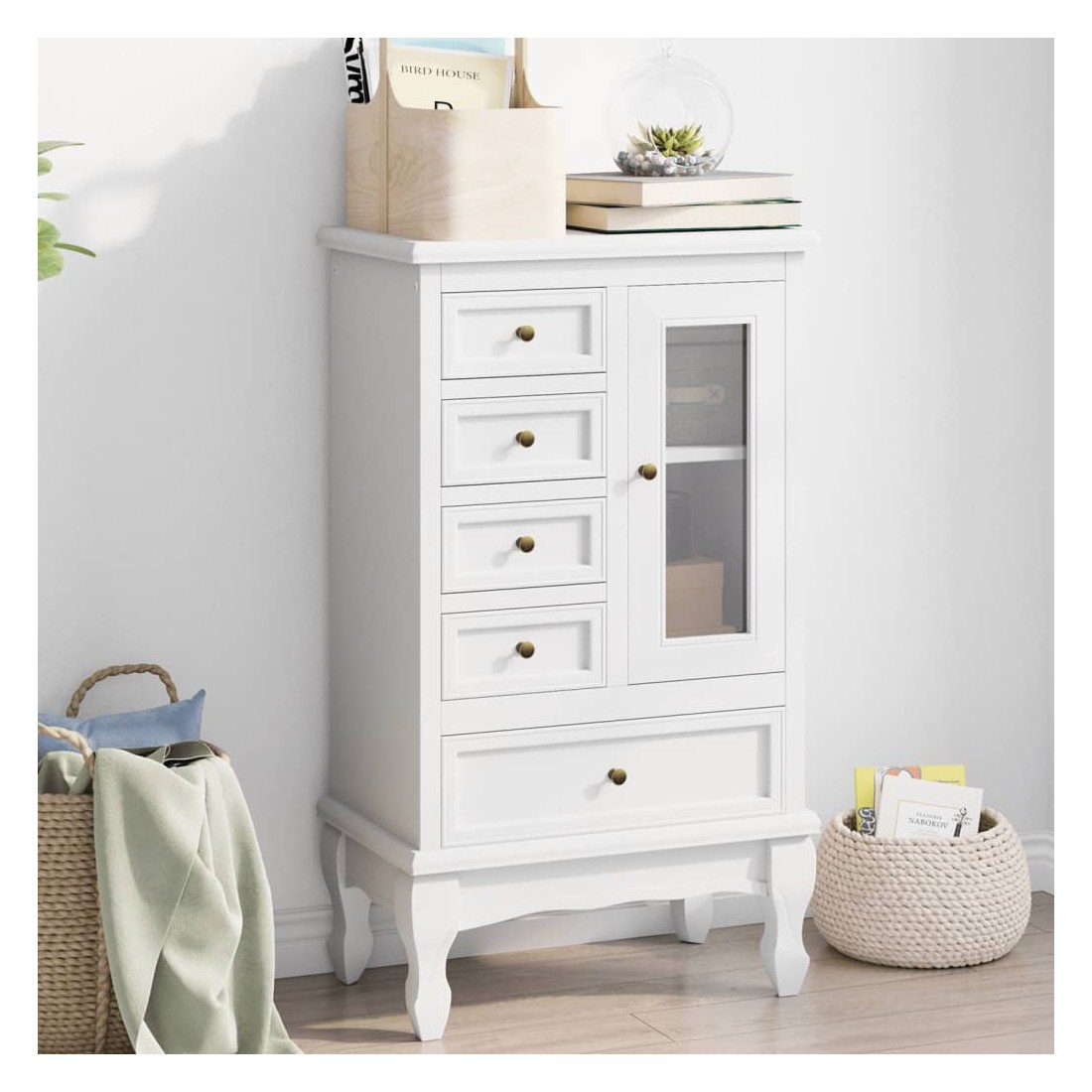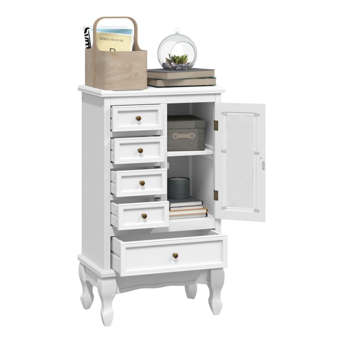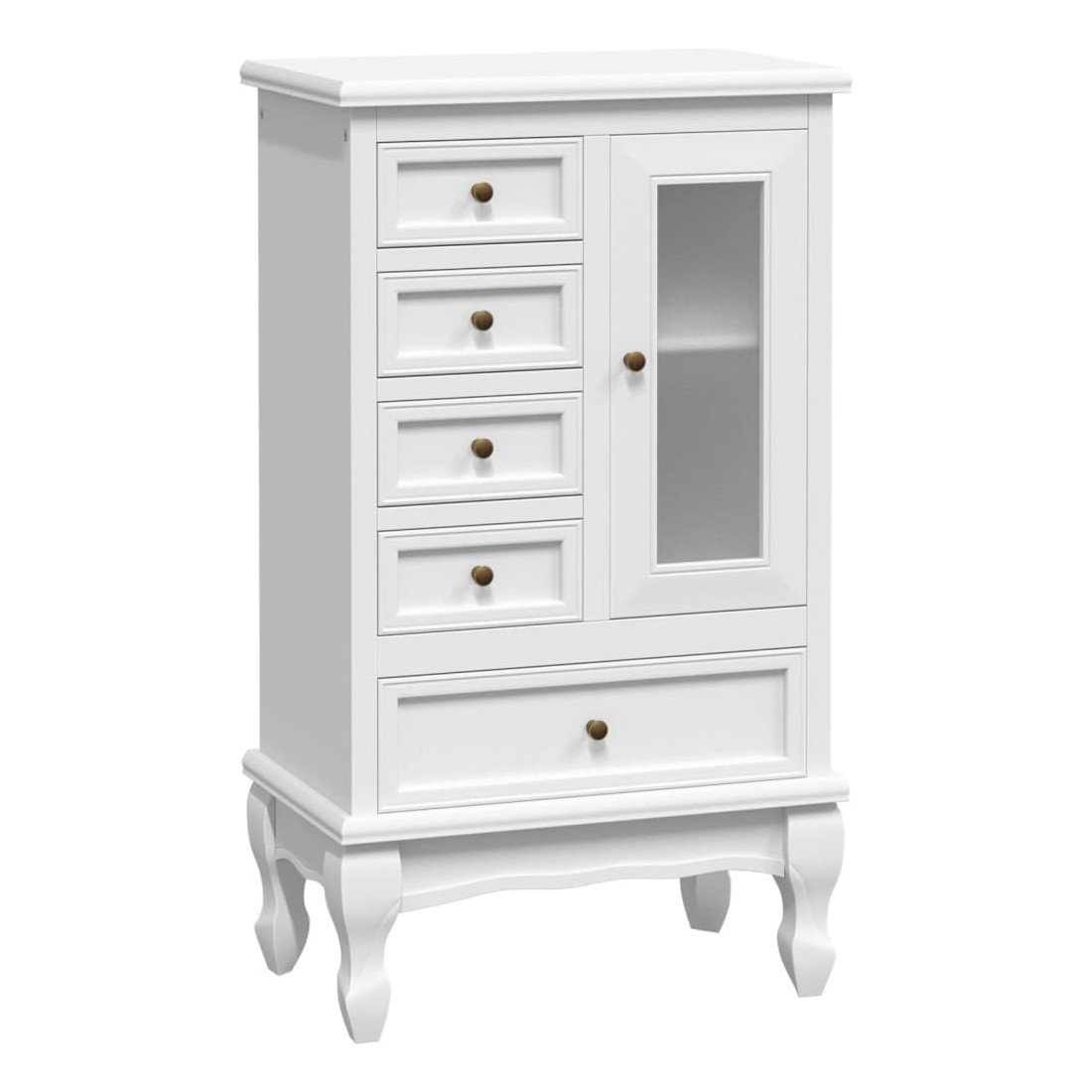 Cette armoire au design ancien est un excellent meuble pour le bureau, le salon, la chambre à coucher, etc. Elle sera certainement un excellent ajout à votre chambre à coucher, bureau ou même couloir. Les cinq tiroirs sont conçus pour ranger vos livres, vêtements et autres articles. Avec deux grandes étagères d'affichage, il y a beaucoup d'espace pour le stockage et les affichages supplémentaires et la porte en acrylique est idéale pour garder la saleté et la poussière à distance. Cette armoire est construite à partir de MDF et de pinède avec une finition peinte en blanc pour plus de durabilité, ce qui vous donne des années de service.