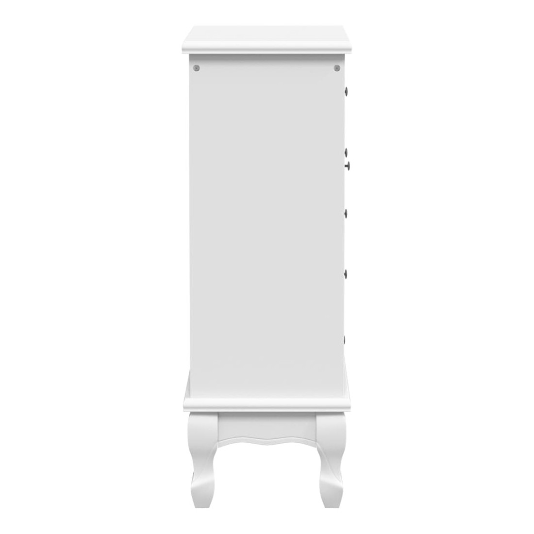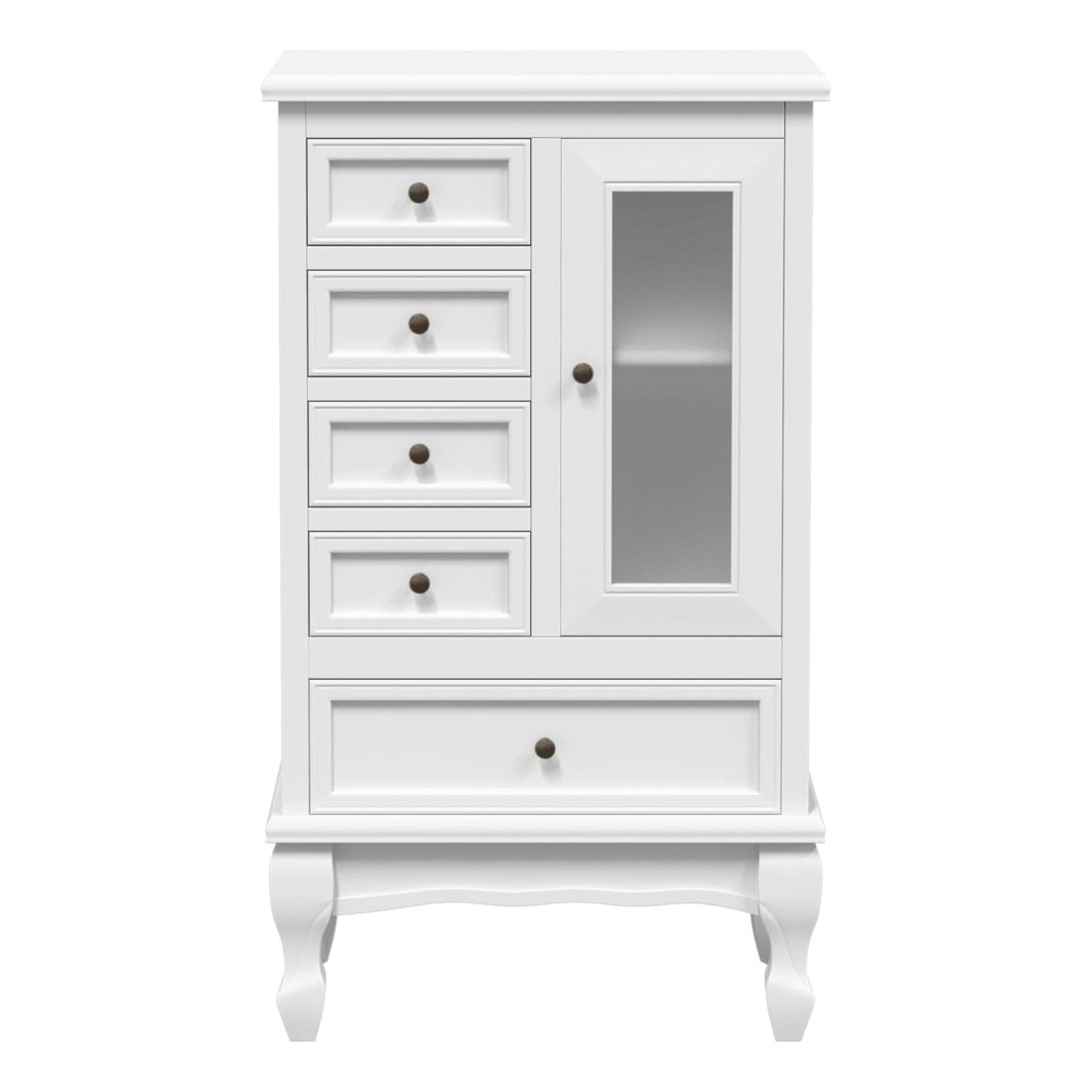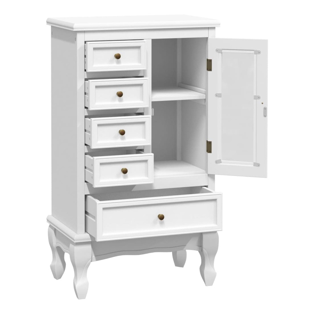 Cette armoire au design ancien est un excellent meuble pour le bureau, le salon, la chambre à coucher, etc. Elle sera certainement un excellent ajout à votre chambre à coucher, bureau ou même couloir. Les cinq tiroirs sont conçus pour ranger vos livres, vêtements et autres articles. Avec deux grandes étagères d'affichage, il y a beaucoup d'espace pour le stockage et les affichages supplémentaires et la porte en acrylique est idéale pour garder la saleté et la poussière à distance. Cette armoire est construite à partir de MDF et de pinède avec une finition peinte en blanc pour plus de durabilité, ce qui vous donne des années de service.