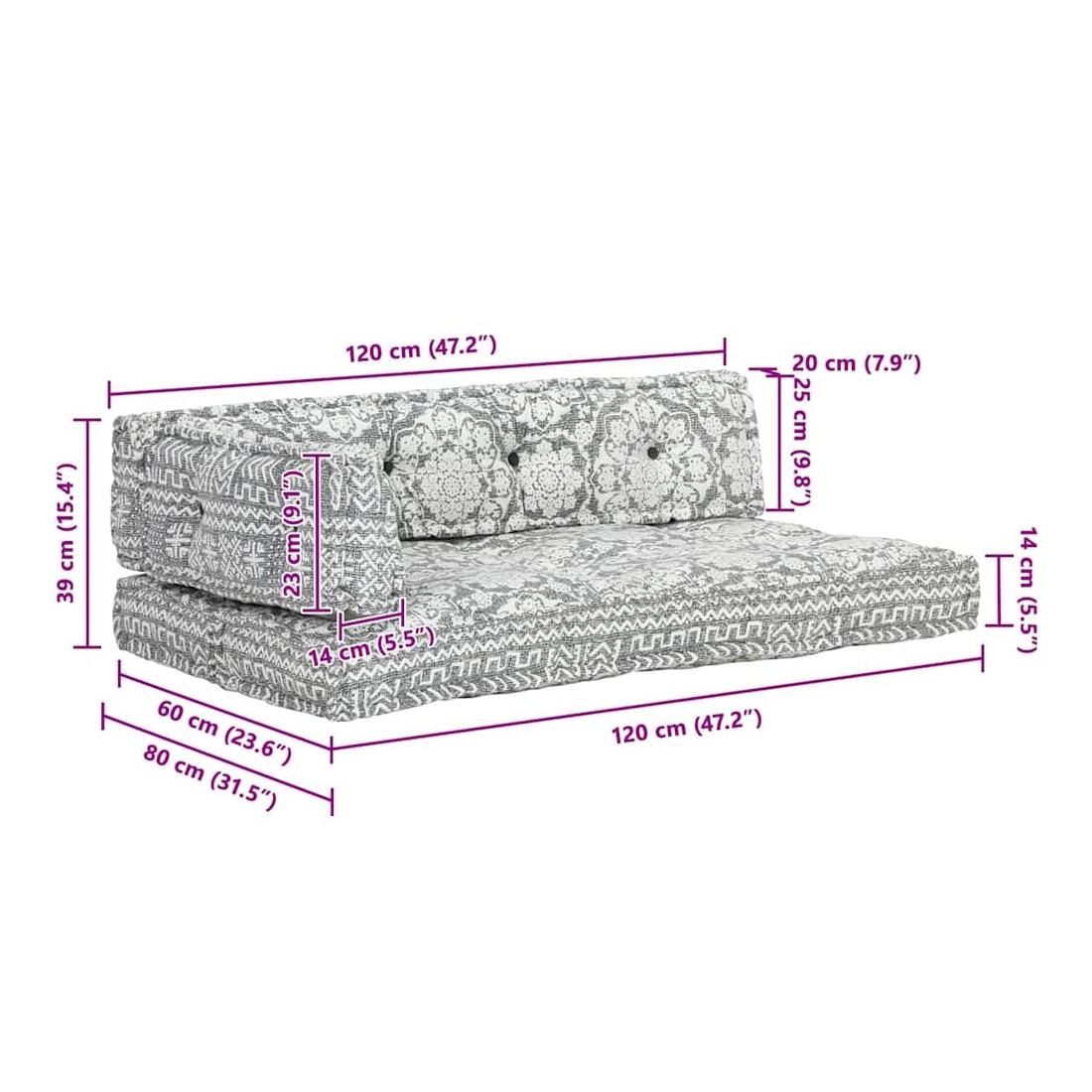 - Dimensions du rembourrage de siège : 120 x 60 x 14 cm (l x P x H)