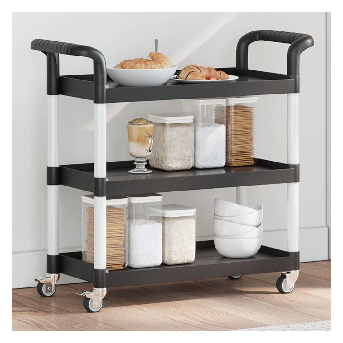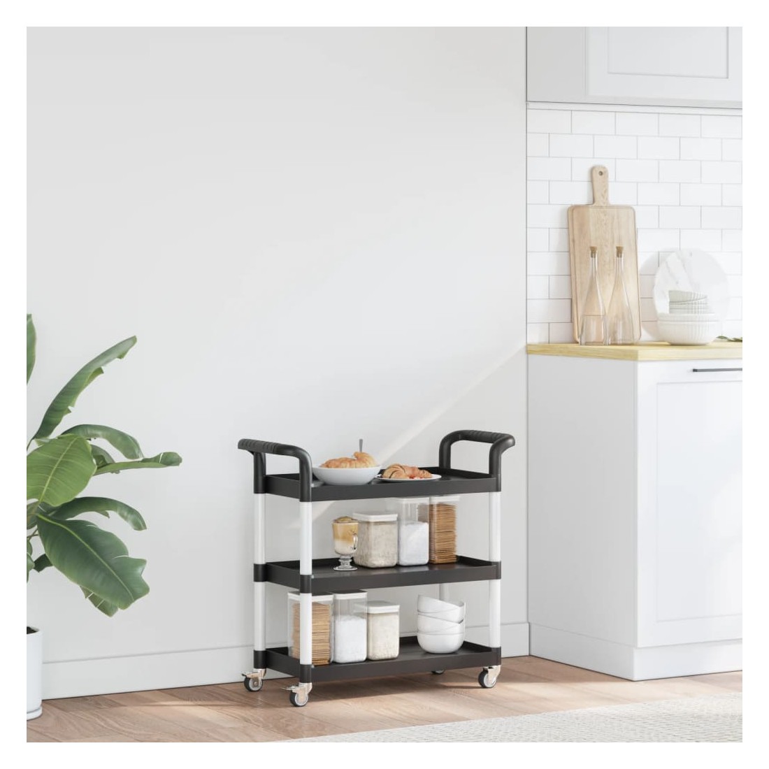 Créez une touche distinctive et ajoutez plus d'espace de rangement avec ce chariot à 3 niveaux. Matériau durable : le polypropylène (PP) est un plastique populaire qui est également l'un des matériaux les plus utilisés dans le mobilier d'extérieur. Il est léger, robuste et résistant aux chocs. De plus, les tubes en aluminium assurent la stabilité et la robustesse du chariot.Grand espace de rangement : le chariot de cuisine, comprenant de 3 étagères, offre suffisamment d'espace pour placer des collations, des boissons, des vases, des bols de fruits ou d'autres objets décoratifs.Déplacement flexible : le chariot à boissons est équipé de 4 roues en caoutchouc et de 2 poignées, ce qui permet de le faire rouler facilement et commodément partout où vous le souhaitez. En outre, 2 roues sont verrouillables pour plus de contrôle et de sécurité.Nombreuses applications : ce chariot de bar peut être utilisé dans différents environnements, tels que la cuisine, la salle à manger, le salon ou le garage, et peut être utilisé comme chariot à boissons, chariot de cuisine ou chariot à outils. Bon à savoir :Le maillet en caoutchouc est nécessaire pour l'installation (non inclus dans la livraison).