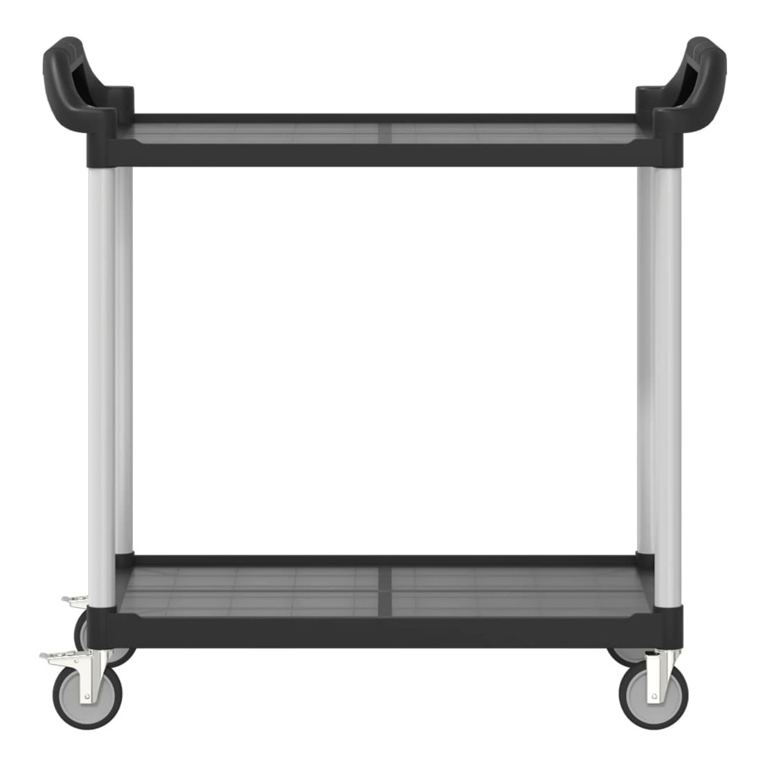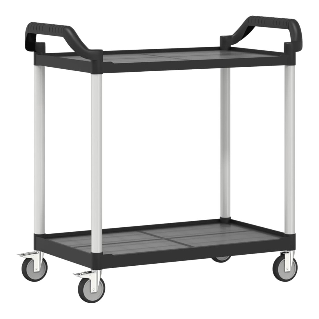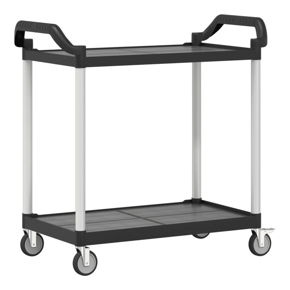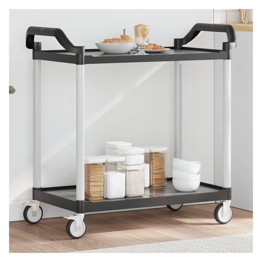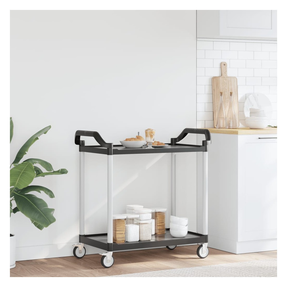 Créez une touche distinctive et ajoutez plus d'espace de rangement avec ce chariot à 2 niveaux. Matériau durable : le polypropylène (PP) est un plastique populaire qui est également l'un des matériaux les plus utilisés dans le mobilier d'extérieur. Il est léger, robuste et résistant aux chocs. De plus, les tubes en aluminium assurent la stabilité et la robustesse du chariot.Grand espace de rangement : le chariot de cuisine, comprenant de 2 étagères, offre suffisamment d'espace pour placer des collations, des boissons, des vases, des bols de fruits ou d'autres objets décoratifs.Déplacement flexible : le chariot à boissons est équipé de 4 roues en caoutchouc et de 2 poignées, ce qui permet de le faire rouler facilement et commodément partout où vous le souhaitez. En outre, 2 roues sont verrouillables pour plus de contrôle et de sécurité.Nombreuses applications : ce chariot de bar peut être utilisé dans différents environnements, tels que la cuisine, la salle à manger, le salon ou le garage, et peut être utilisé comme chariot à boissons, chariot de cuisine ou chariot à outils. Bon à savoir :Le maillet en caoutchouc est nécessaire pour l'installation (non inclus dans la livraison).