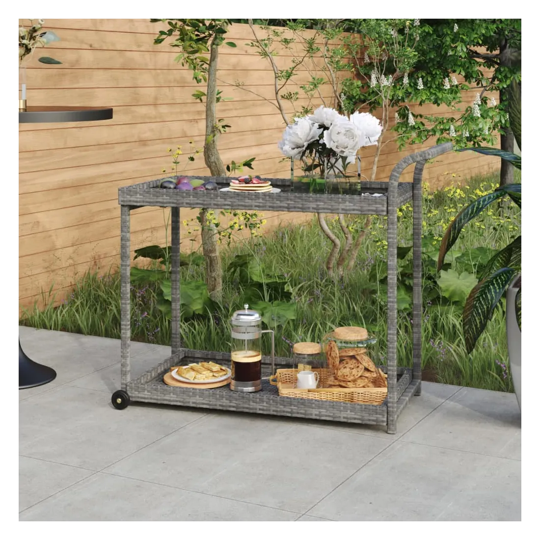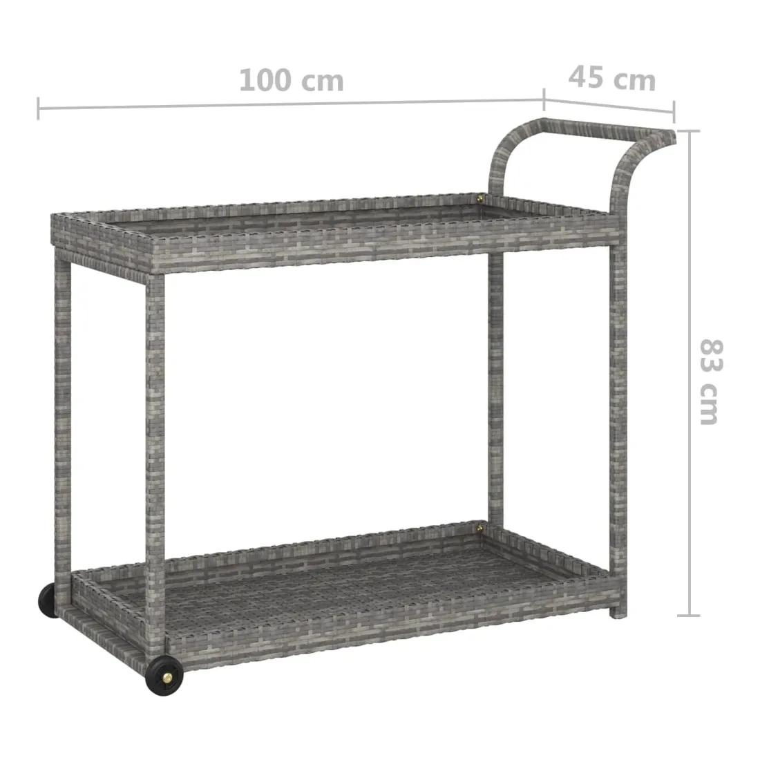 Avec un design polyvalent et spacieux, ce chariot de service est une aide pratique avec des roues dans la cuisine, le salon ou sur votre patio. Ce chariot est fabriqué en résine tressée résistante aux intempéries et nécessite moins d’entretien. Il offre un espace de rangement suffisant pour placer du jus, des plats délicieux, des fruits, etc. Le cadre en acier enduit de poudre maintient le chariot de service stable et robuste. Avec une poignée sur le dessus, il est facile à pousser et à tirer. Grâce aux roulettes, le chariot peut être déplacé sans effort.