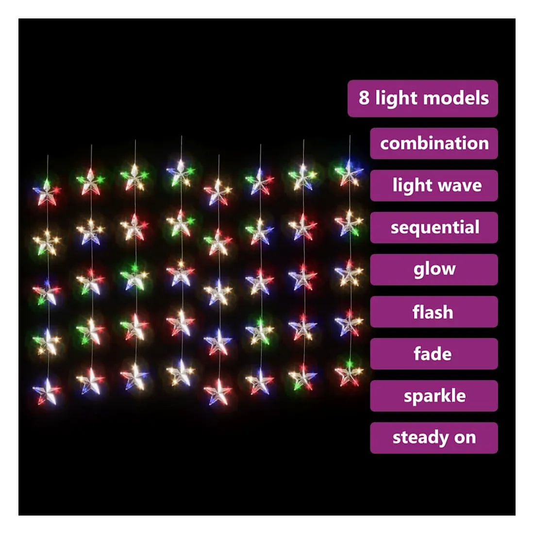 vidaXLCe rideau lumineux à LED à étoiles est excellent pour une utilisation comme un complément d’éclairage à tout projet décoratif. Il est adapté pour Noël, fêtes, mariages et autres jours fériés. La guirlande lumineuse est équipée de 200 LED à économie d’énergie, créant une performance d’éclairage magique. Elle dispose de 8 effets lumineux différents : mode combiné, vagues, mode séquentiel, mode de lueur lente, clignotement, mode d'atténuation lente, scintillement et éclairage continu. C’est un excellent accessoire décoratif pour éclairer les espaces intérieurs et extérieurs. Remarque: l'USB inclus n'est pas étanche, donc cette partie doit éviter l'eau, mais grâce au câble de 3 m, la décoration de Noël peut être utilisée à l’extérieur car le câble et le produit sont étanches. Ce produit est doté d'un connecteur USB, mais la source d'alimentation certifiée de USB 5V n'est pas incluse.