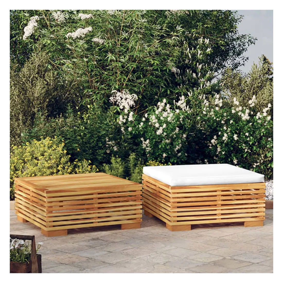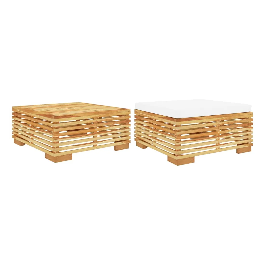 Profitez d'une pause café réconfortante dans votre espace extérieur avec cet ensemble de salon de jardin en bois ! Il est également parfait pour créer votre propre aménagement de salon. Bois de teck massif : le bois de teck massif est un matériau naturel magnifique. Il a été chevronné, séché au four, puis sablé finement pour lui donner une apparence très lisse. Le bois de teck est connu pour sa résistance exceptionnelle et sa résistance aux intempéries.Coussin souple : le coussin d'assise bien rembourré de ce repose-pied de jardin apporte le plus grand confort.Dessus robuste : le dessus de table robuste de cette table basse de jardin vous offre de l'espace pour placer des collations, des paniers de fruits, des objets décoratifs, ainsi que divers autres articles essentiels. Remarque :Chaque produit est livré avec un manuel de montage dans la boîte pour un montage facile.Afin de prolonger la durée de vie de votre mobilier d'extérieur, nous vous recommandons de le protéger avec une housse imperméable.