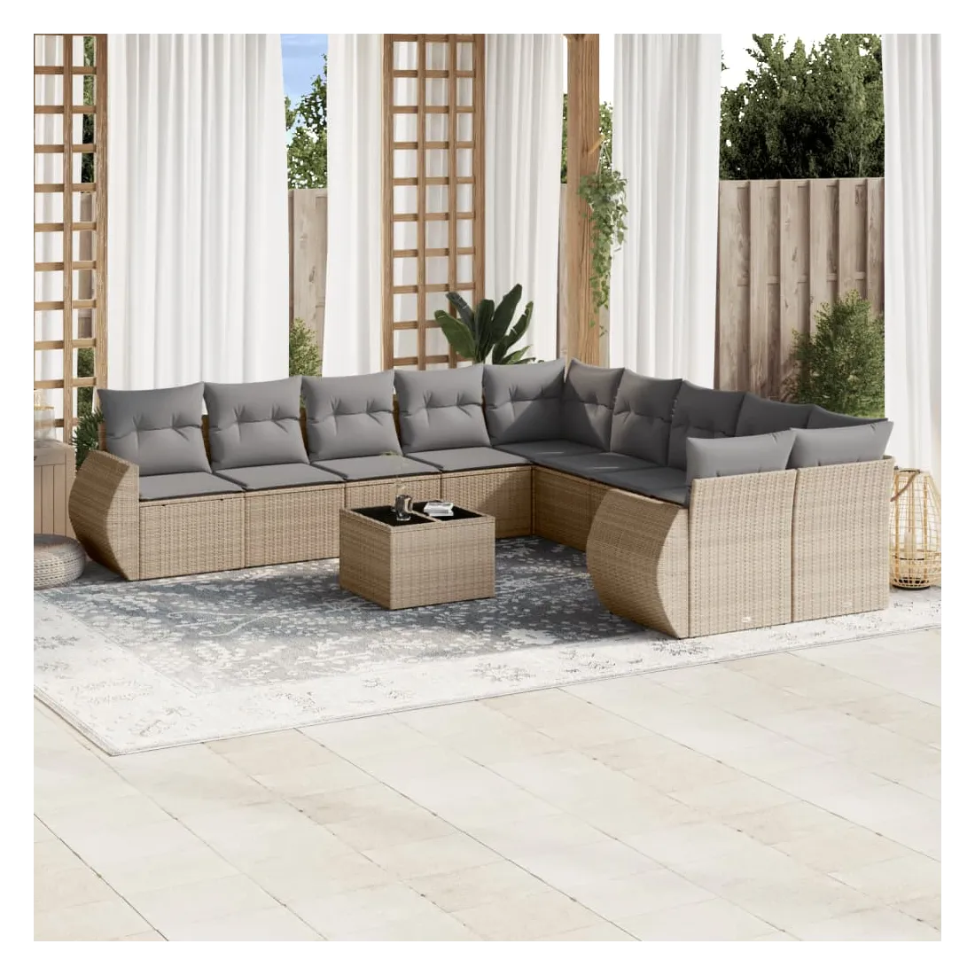 Cet ensemble de canapés de jardin est le complément parfait de votre arrière-cour, terrasse ou patio, offrant un espace confortable et accueillant pour discuter avec la famille et les amis ou simplement se détendre et profiter de l'extérieur. Matériau durable : la résine tressée, également connue sous le nom de poly rotin, est un matériau synthétique solide et nécessitant peu d'entretien qui ressemble au rotin naturel. Il est léger, facile à nettoyer et couramment utilisé pour les meubles d'extérieur en raison de sa durabilité et de ses propriétés de résistance aux intempéries.Dessus en verre : le dessus de la table d'extérieur est fabriqué en verre trempé solide et durable, ce qui le rend facile à nettoyer avec un chiffon humide et ajoute une touche d'élégance à votre espace extérieur.Expérience d'assise confortable : ce mobilier d'extérieur, doté de coussins épais, offre une expérience d'assise confortable.Housse amovible et lavable : ces coussins de siège sont dotés de housses amovibles pour un lavage et un entretien faciles.Conception modulaire : cet ensemble de meubles d'extérieur a une conception modulaire, ce qui le rend complètement flexible et facile à déplacer, afin que vous puissiez créer un agencement de meubles d'extérieur personnalisé. Bon à savoir :Pour que vos meubles d'extérieur restent beaux, nous vous recommandons de les protéger avec une housse imperméable.