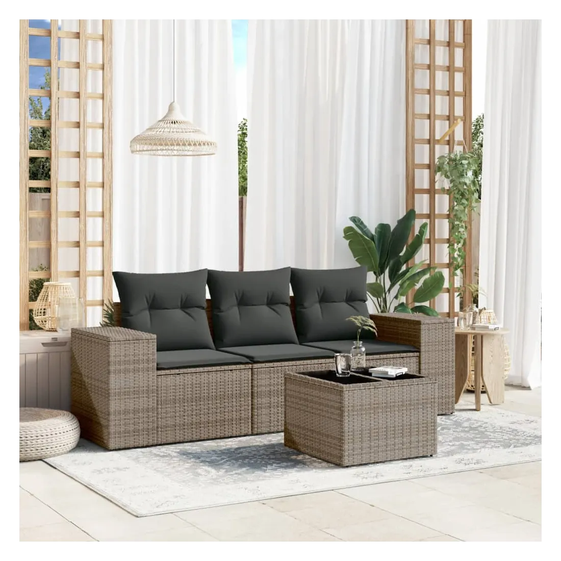 Cet ensemble de canapés de jardin est le complément parfait de votre arrière-cour, terrasse ou patio, offrant un espace confortable et accueillant pour discuter avec la famille et les amis ou simplement se détendre et profiter de l'extérieur. Matériau durable : la résine tressée, également connue sous le nom de poly rotin, est un matériau synthétique solide et nécessitant peu d'entretien qui ressemble au rotin naturel. Il est léger, facile à nettoyer et couramment utilisé pour les meubles d'extérieur en raison de sa durabilité et de ses propriétés de résistance aux intempéries.Dessus en verre : le dessus de la table d'extérieur est fabriqué en verre trempé solide et durable, ce qui le rend facile à nettoyer avec un chiffon humide et ajoute une touche d'élégance à votre espace extérieur.Expérience d'assise confortable : ce mobilier d'extérieur, doté de coussins épais, offre une expérience d'assise confortable.Housse amovible et lavable : ces coussins de siège sont dotés de housses amovibles pour un lavage et un entretien faciles.Conception modulaire : cet ensemble de meubles d'extérieur a une conception modulaire, ce qui le rend complètement flexible et facile à déplacer, afin que vous puissiez créer un agencement de meubles d'extérieur personnalisé. Bon à savoir :Pour que vos meubles d'extérieur restent beaux, nous vous recommandons de les protéger avec une housse imperméable.