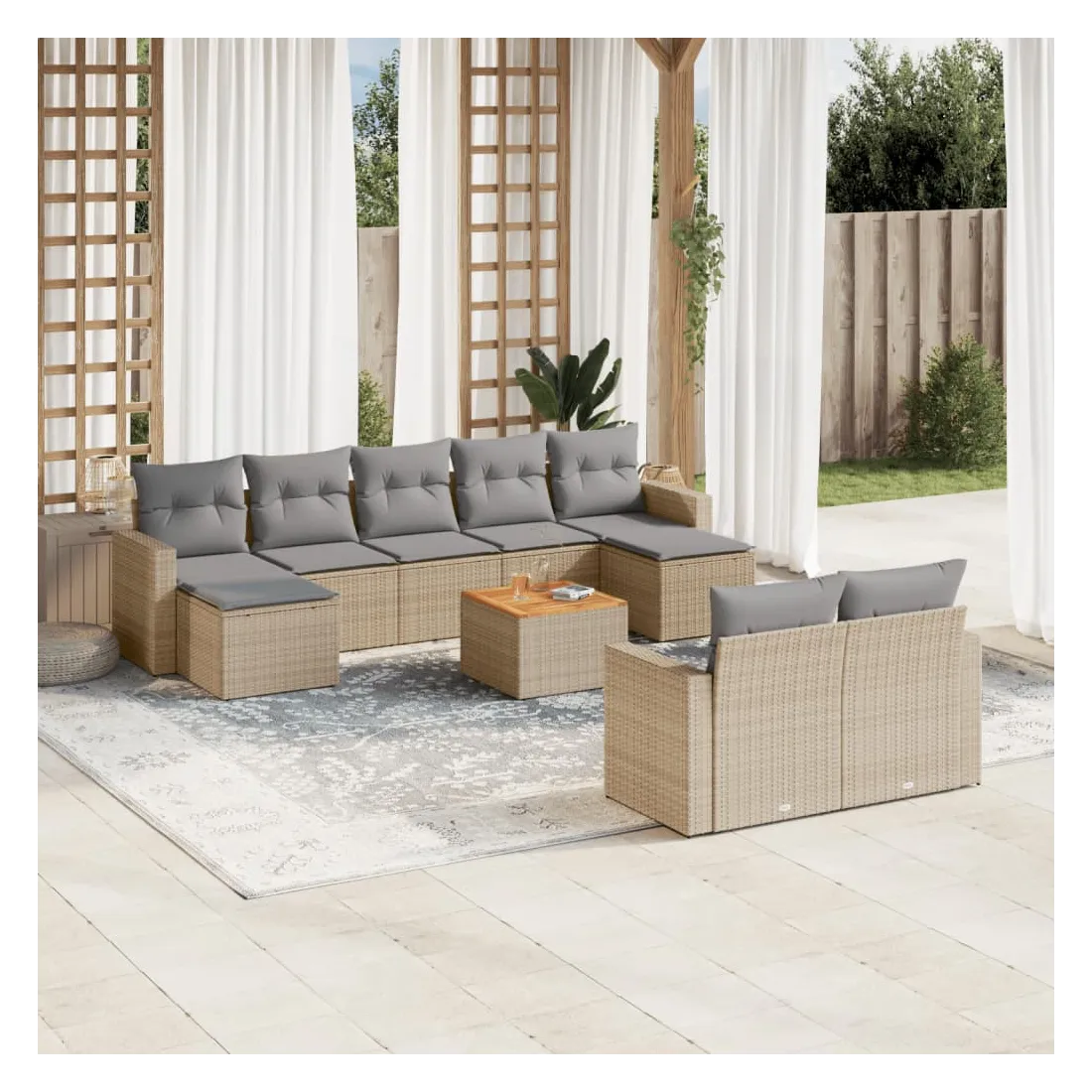 Cet ensemble de canapés de jardin est le complément parfait de votre arrière-cour, terrasse ou patio, offrant un espace confortable et accueillant pour discuter avec la famille et les amis ou simplement se détendre et profiter de l'extérieur. Matériau durable : la résine tressée, également connue sous le nom de poly rotin, est un matériau synthétique solide et nécessitant peu d'entretien qui ressemble au rotin naturel. Il est léger, facile à nettoyer et couramment utilisé pour les meubles d'extérieur en raison de sa durabilité et de ses propriétés de résistance aux intempéries.Dessus stable et facile à nettoyer : cette table de jardin a un dessus en bois d'acacia robuste, durable et facile à nettoyer avec un chiffon humide.Expérience d'assise confortable : ce mobilier d'extérieur, doté de coussins épais, offre une expérience d'assise confortable.Housse amovible et lavable : ces coussins de siège sont dotés de housses amovibles pour un lavage et un entretien faciles.Conception modulaire : cet ensemble de meubles d'extérieur a une conception modulaire, ce qui le rend complètement flexible et facile à déplacer, afin que vous puissiez créer un agencement de meubles d'extérieur personnalisé. Bon à savoir :Pour que vos meubles d'extérieur restent beaux, nous vous recommandons de les protéger avec une housse imperméable.