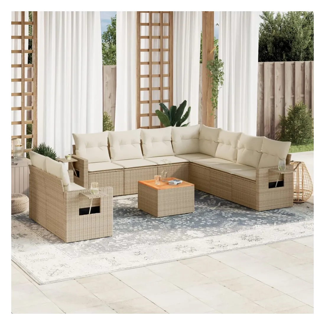 Cet ensemble de canapés de jardin est le complément parfait de votre arrière-cour, terrasse ou patio, offrant un espace confortable et accueillant pour discuter avec la famille et les amis ou simplement se détendre et profiter de l'extérieur. Matériau durable : la résine tressée, également connue sous le nom de poly rotin, est un matériau synthétique solide et nécessitant peu d'entretien qui ressemble au rotin naturel. Il est léger, facile à nettoyer et couramment utilisé pour les meubles d'extérieur en raison de sa durabilité et de ses propriétés de résistance aux intempéries.Table d'appoint pratique : ce mobilier d'extérieur comprend une table d'appoint pliable avec un ressort à gaz sur les accoudoirs, offrant un endroit pratique pour garder vos essentiels à portée de main.Dessus stable et facile à nettoyer : cette table de jardin a un dessus en bois d'acacia robuste, durable et facile à nettoyer avec un chiffon humide.Housse amovible et lavable : ces coussins de siège sont dotés de housses amovibles pour un lavage et un entretien faciles.Conception modulaire : cet ensemble de meubles d'extérieur a une conception modulaire, ce qui le rend complètement flexible et facile à déplacer, afin que vous puissiez créer un agencement de meubles d'extérieur personnalisé. Bon à savoir :Pour que vos meubles d'extérieur restent beaux, nous vous recommandons de les protéger avec une housse imperméable.