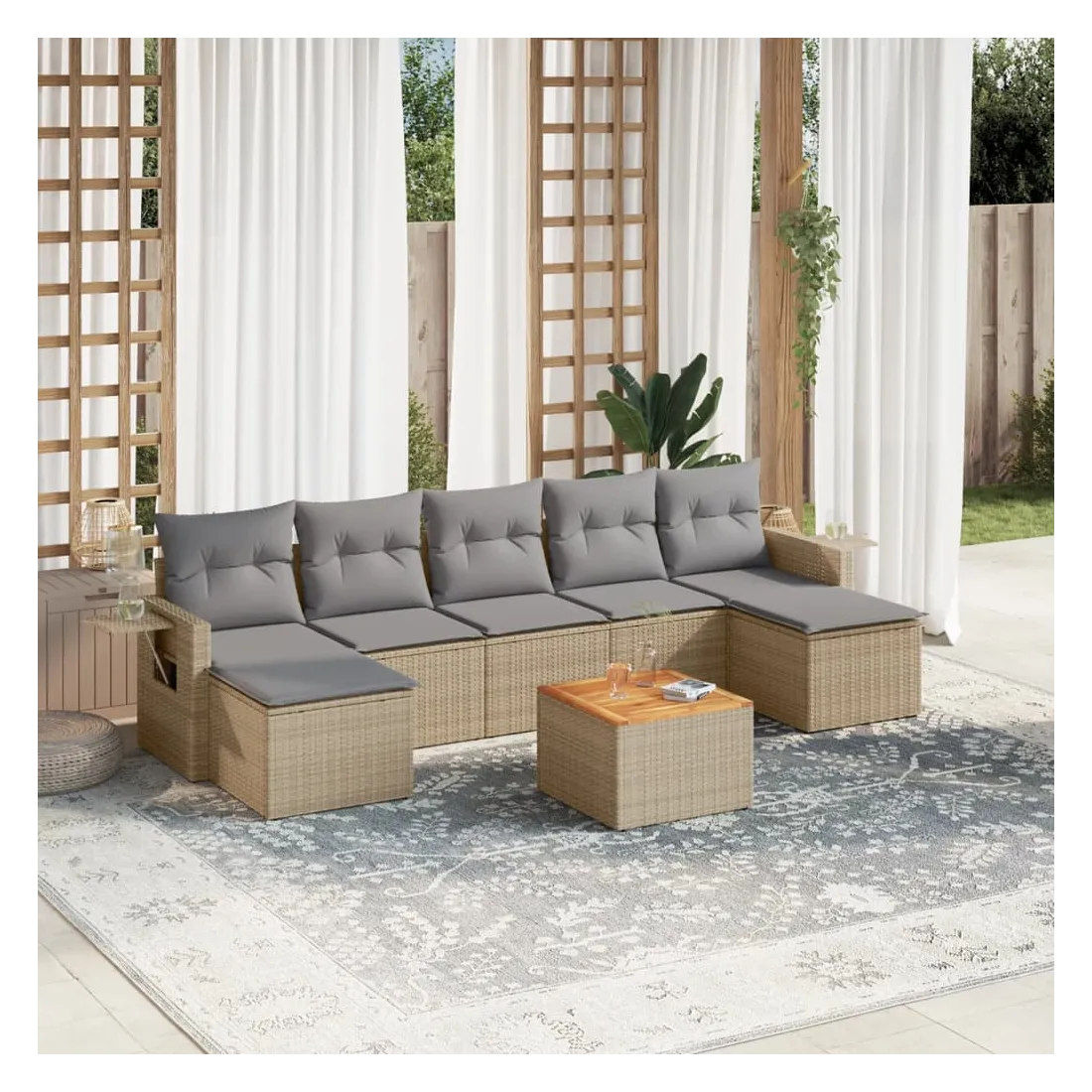 Cet ensemble de canapés de jardin est le complément parfait de votre arrière-cour, terrasse ou patio, offrant un espace confortable et accueillant pour discuter avec la famille et les amis ou simplement se détendre et profiter de l'extérieur. Matériau durable : la résine tressée, également connue sous le nom de poly rotin, est un matériau synthétique solide et nécessitant peu d'entretien qui ressemble au rotin naturel. Il est léger, facile à nettoyer et couramment utilisé pour les meubles d'extérieur en raison de sa durabilité et de ses propriétés de résistance aux intempéries.Table d'appoint pratique : ce mobilier d'extérieur comprend une table d'appoint pliable avec un ressort à gaz sur les accoudoirs, offrant un endroit pratique pour garder vos essentiels à portée de main.Dessus stable et facile à nettoyer : cette table de jardin a un dessus en bois d'acacia robuste, durable et facile à nettoyer avec un chiffon humide.Housse amovible et lavable : ces coussins de siège sont dotés de housses amovibles pour un lavage et un entretien faciles.Conception modulaire : cet ensemble de meubles d'extérieur a une conception modulaire, ce qui le rend complètement flexible et facile à déplacer, afin que vous puissiez créer un agencement de meubles d'extérieur personnalisé. Bon à savoir :Pour que vos meubles d'extérieur restent beaux, nous vous recommandons de les protéger avec une housse imperméable.