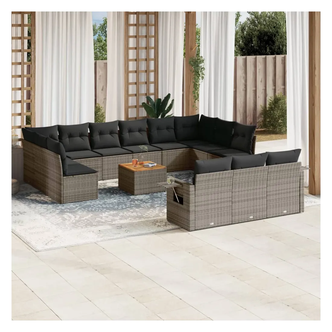 Cet ensemble de canapés de jardin est le complément parfait de votre arrière-cour, terrasse ou patio, offrant un espace confortable et accueillant pour discuter avec la famille et les amis ou simplement se détendre et profiter de l'extérieur. Matériau durable : la résine tressée, également connue sous le nom de poly rotin, est un matériau synthétique solide et nécessitant peu d'entretien qui ressemble au rotin naturel. Il est léger, facile à nettoyer et couramment utilisé pour les meubles d'extérieur en raison de sa durabilité et de ses propriétés de résistance aux intempéries.Table d'appoint pratique : ce mobilier d'extérieur comprend une table d'appoint pliable avec un ressort à gaz sur les accoudoirs, offrant un endroit pratique pour garder vos essentiels à portée de main.Dessus stable et facile à nettoyer : cette table de jardin a un dessus en bois d'acacia robuste, durable et facile à nettoyer avec un chiffon humide.Housse amovible et lavable : ces coussins de siège sont dotés de housses amovibles pour un lavage et un entretien faciles.Conception modulaire : cet ensemble de meubles d'extérieur a une conception modulaire, ce qui le rend complètement flexible et facile à déplacer, afin que vous puissiez créer un agencement de meubles d'extérieur personnalisé. Bon à savoir :Pour que vos meubles d'extérieur restent beaux, nous vous recommandons de les protéger avec une housse imperméable.