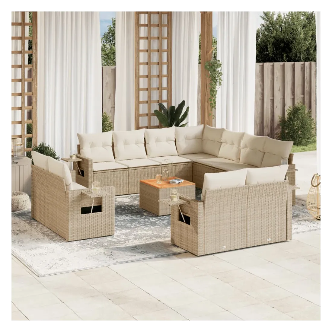 Cet ensemble de canapés de jardin est le complément parfait de votre arrière-cour, terrasse ou patio, offrant un espace confortable et accueillant pour discuter avec la famille et les amis ou simplement se détendre et profiter de l'extérieur. Matériau durable : la résine tressée, également connue sous le nom de poly rotin, est un matériau synthétique solide et nécessitant peu d'entretien qui ressemble au rotin naturel. Il est léger, facile à nettoyer et couramment utilisé pour les meubles d'extérieur en raison de sa durabilité et de ses propriétés de résistance aux intempéries.Table d'appoint pratique : ce mobilier d'extérieur comprend une table d'appoint pliable avec un ressort à gaz sur les accoudoirs, offrant un endroit pratique pour garder vos essentiels à portée de main.Dessus stable et facile à nettoyer : cette table de jardin a un dessus en bois d'acacia robuste, durable et facile à nettoyer avec un chiffon humide.Housse amovible et lavable : ces coussins de siège sont dotés de housses amovibles pour un lavage et un entretien faciles.Conception modulaire : cet ensemble de meubles d'extérieur a une conception modulaire, ce qui le rend complètement flexible et facile à déplacer, afin que vous puissiez créer un agencement de meubles d'extérieur personnalisé. Bon à savoir :Pour que vos meubles d'extérieur restent beaux, nous vous recommandons de les protéger avec une housse imperméable.