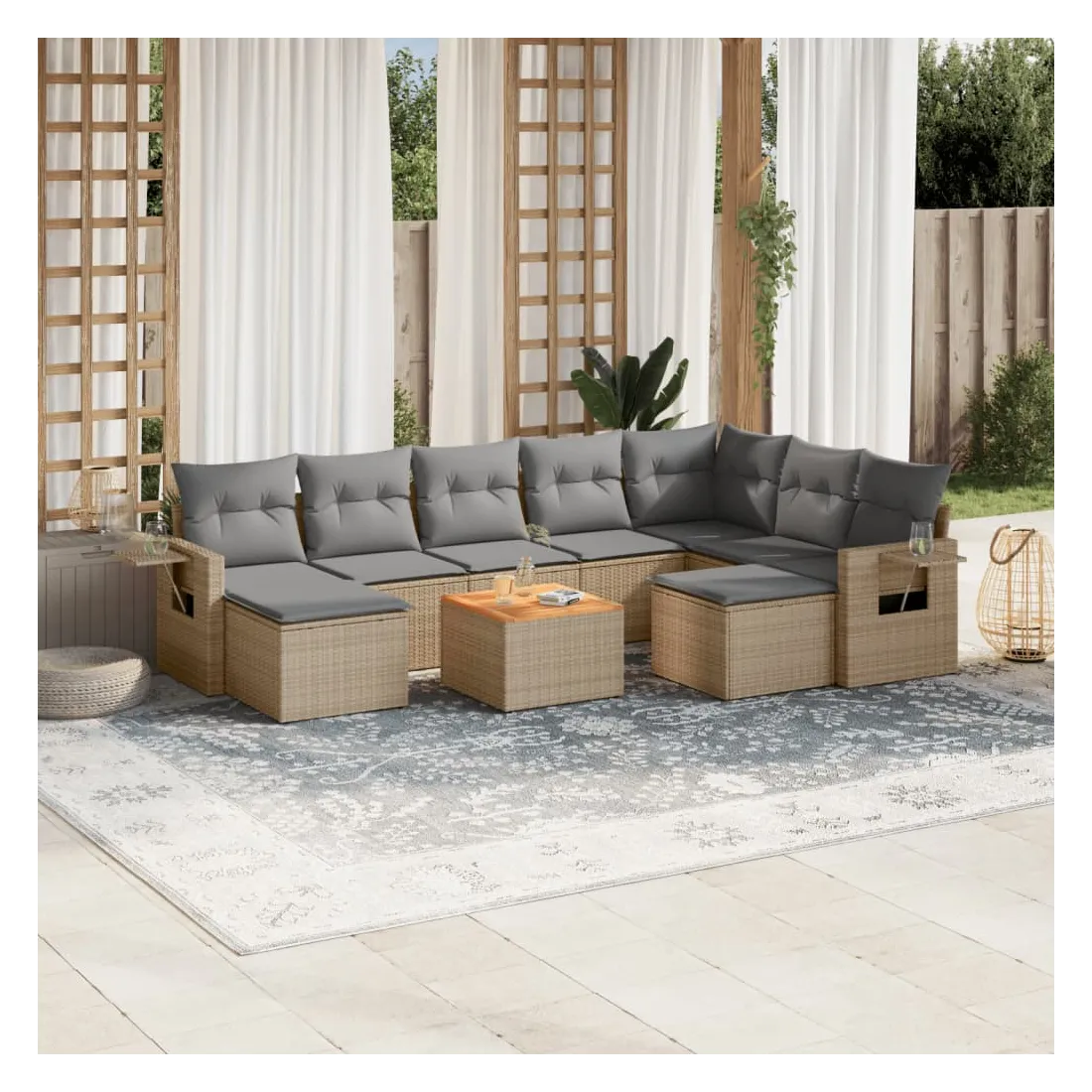 Cet ensemble de canapés de jardin est le complément parfait de votre arrière-cour, terrasse ou patio, offrant un espace confortable et accueillant pour discuter avec la famille et les amis ou simplement se détendre et profiter de l'extérieur. Matériau durable : la résine tressée, également connue sous le nom de poly rotin, est un matériau synthétique solide et nécessitant peu d'entretien qui ressemble au rotin naturel. Il est léger, facile à nettoyer et couramment utilisé pour les meubles d'extérieur en raison de sa durabilité et de ses propriétés de résistance aux intempéries.Table d'appoint pratique : ce mobilier d'extérieur comprend une table d'appoint pliable avec un ressort à gaz sur les accoudoirs, offrant un endroit pratique pour garder vos essentiels à portée de main.Dessus stable et facile à nettoyer : cette table de jardin a un dessus en bois d'acacia robuste, durable et facile à nettoyer avec un chiffon humide.Housse amovible et lavable : ces coussins de siège sont dotés de housses amovibles pour un lavage et un entretien faciles.Conception modulaire : cet ensemble de meubles d'extérieur a une conception modulaire, ce qui le rend complètement flexible et facile à déplacer, afin que vous puissiez créer un agencement de meubles d'extérieur personnalisé. Bon à savoir :Pour que vos meubles d'extérieur restent beaux, nous vous recommandons de les protéger avec une housse imperméable.