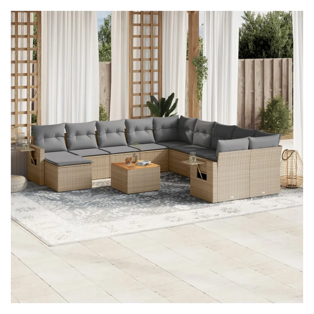 Cet ensemble de canapés de jardin est le complément parfait de votre arrière-cour, terrasse ou patio, offrant un espace confortable et accueillant pour discuter avec la famille et les amis ou simplement se détendre et profiter de l'extérieur. Matériau durable : la résine tressée, également connue sous le nom de poly rotin, est un matériau synthétique solide et nécessitant peu d'entretien qui ressemble au rotin naturel. Il est léger, facile à nettoyer et couramment utilisé pour les meubles d'extérieur en raison de sa durabilité et de ses propriétés de résistance aux intempéries.Table d'appoint pratique : ce mobilier d'extérieur comprend une table d'appoint pliable avec un ressort à gaz sur les accoudoirs, offrant un endroit pratique pour garder vos essentiels à portée de main.Dessus stable et facile à nettoyer : cette table de jardin a un dessus en bois d'acacia robuste, durable et facile à nettoyer avec un chiffon humide.Housse amovible et lavable : ces coussins de siège sont dotés de housses amovibles pour un lavage et un entretien faciles.Conception modulaire : cet ensemble de meubles d'extérieur a une conception modulaire, ce qui le rend complètement flexible et facile à déplacer, afin que vous puissiez créer un agencement de meubles d'extérieur personnalisé. Bon à savoir :Pour que vos meubles d'extérieur restent beaux, nous vous recommandons de les protéger avec une housse imperméable.