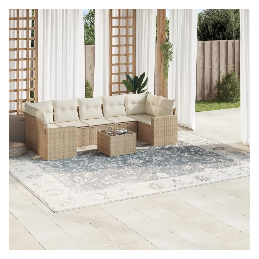 Cet ensemble de canapés de jardin est le complément parfait de votre arrière-cour, terrasse ou patio, offrant un espace confortable et accueillant pour discuter avec la famille et les amis ou simplement se détendre et profiter de l'extérieur. Matériau durable : la résine tressée, également connue sous le nom de poly rotin, est un matériau synthétique solide et nécessitant peu d'entretien qui ressemble au rotin naturel. Il est léger, facile à nettoyer et couramment utilisé pour les meubles d'extérieur en raison de sa durabilité et de ses propriétés de résistance aux intempéries.Fonction de rangement avec sac résistant à l'eau : chaque siège de jardin dispose d'un espace de rangement sous l'assise, complété par un sac résistant à l'eau pour ranger les coussins, les jouets et d'autres objets. Les sacs intérieurs sont dotés d'un couvercle et peuvent être solidement fixés aux sièges à l'aide de bandes auto-agrippantes pour plus de stabilité.Dessus en verre : le dessus de la table d'extérieur est fabriqué en verre trempé solide et durable, ce qui le rend facile à nettoyer avec un chiffon humide et ajoute une touche d'élégance à votre espace extérieur.Housse amovible et lavable : ces coussins de siège sont dotés de housses amovibles pour un lavage et un entretien faciles.Conception modulaire : cet ensemble de meubles d'extérieur a une conception modulaire, ce qui le rend complètement flexible et facile à déplacer, afin que vous puissiez créer un agencement de meubles d'extérieur personnalisé. Bon à savoir :Pour que vos meubles d'extérieur restent beaux, nous vous recommandons de les protéger avec une housse imperméable.