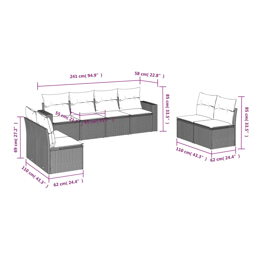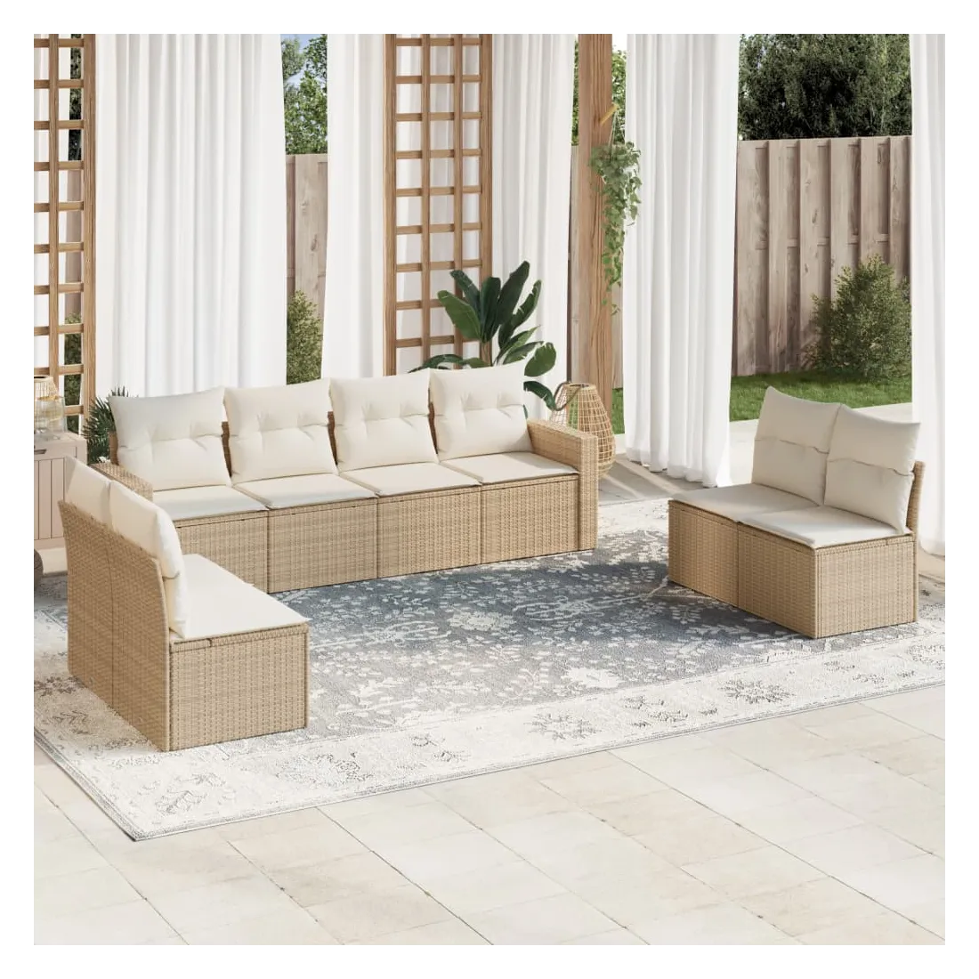 Cet ensemble de canapés de jardin est le complément parfait de votre arrière-cour, terrasse ou patio, offrant un espace confortable et accueillant pour discuter avec la famille et les amis ou simplement se détendre et profiter de l'extérieur. Matériau durable : la résine tressée, également connue sous le nom de poly rotin, est un matériau synthétique solide et nécessitant peu d'entretien qui ressemble au rotin naturel. Il est léger, facile à nettoyer et couramment utilisé pour les meubles d'extérieur en raison de sa durabilité et de ses propriétés de résistance aux intempéries.Fonction de rangement avec sac résistant à l'eau : chaque siège de jardin dispose d'un espace de rangement sous l'assise, complété par un sac résistant à l'eau pour ranger les coussins, les jouets et d'autres objets. Les sacs intérieurs sont dotés d'un couvercle et peuvent être solidement fixés aux sièges à l'aide de bandes auto-agrippantes pour plus de stabilité.Expérience d'assise confortable : ce mobilier d'extérieur, doté de coussins épais, offre une expérience d'assise confortable.Housse amovible et lavable : ces coussins de siège sont dotés de housses amovibles pour un lavage et un entretien faciles.Conception modulaire : cet ensemble de meubles d'extérieur a une conception modulaire, ce qui le rend complètement flexible et facile à déplacer, afin que vous puissiez créer un agencement de meubles d'extérieur personnalisé. Bon à savoir :Pour que vos meubles d'extérieur restent beaux, nous vous recommandons de les protéger avec une housse imperméable.