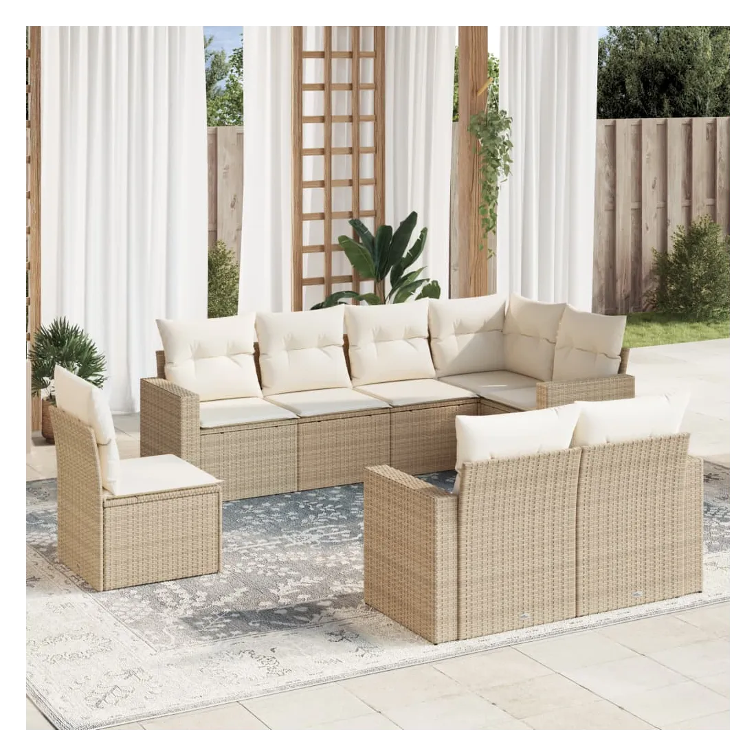 Cet ensemble de canapés de jardin est le complément parfait de votre arrière-cour, terrasse ou patio, offrant un espace confortable et accueillant pour discuter avec la famille et les amis ou simplement se détendre et profiter de l'extérieur. Matériau durable : la résine tressée, également connue sous le nom de poly rotin, est un matériau synthétique solide et nécessitant peu d'entretien qui ressemble au rotin naturel. Il est léger, facile à nettoyer et couramment utilisé pour les meubles d'extérieur en raison de sa durabilité et de ses propriétés de résistance aux intempéries.Fonction de rangement avec sac résistant à l'eau : chaque siège de jardin dispose d'un espace de rangement sous l'assise, complété par un sac résistant à l'eau pour ranger les coussins, les jouets et d'autres objets. Les sacs intérieurs sont dotés d'un couvercle et peuvent être solidement fixés aux sièges à l'aide de bandes auto-agrippantes pour plus de stabilité.Expérience d'assise confortable : ce mobilier d'extérieur, doté de coussins épais, offre une expérience d'assise confortable.Housse amovible et lavable : ces coussins de siège sont dotés de housses amovibles pour un lavage et un entretien faciles.Conception modulaire : cet ensemble de meubles d'extérieur a une conception modulaire, ce qui le rend complètement flexible et facile à déplacer, afin que vous puissiez créer un agencement de meubles d'extérieur personnalisé. Bon à savoir :Pour que vos meubles d'extérieur restent beaux, nous vous recommandons de les protéger avec une housse imperméable.