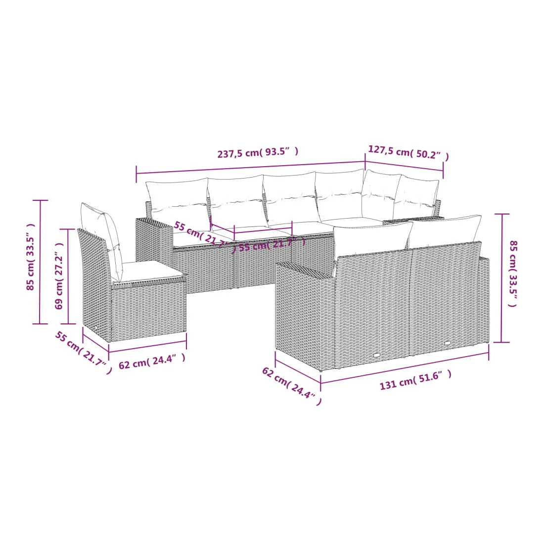 • 8 x coussin d'assise avec housse amovible et lavable