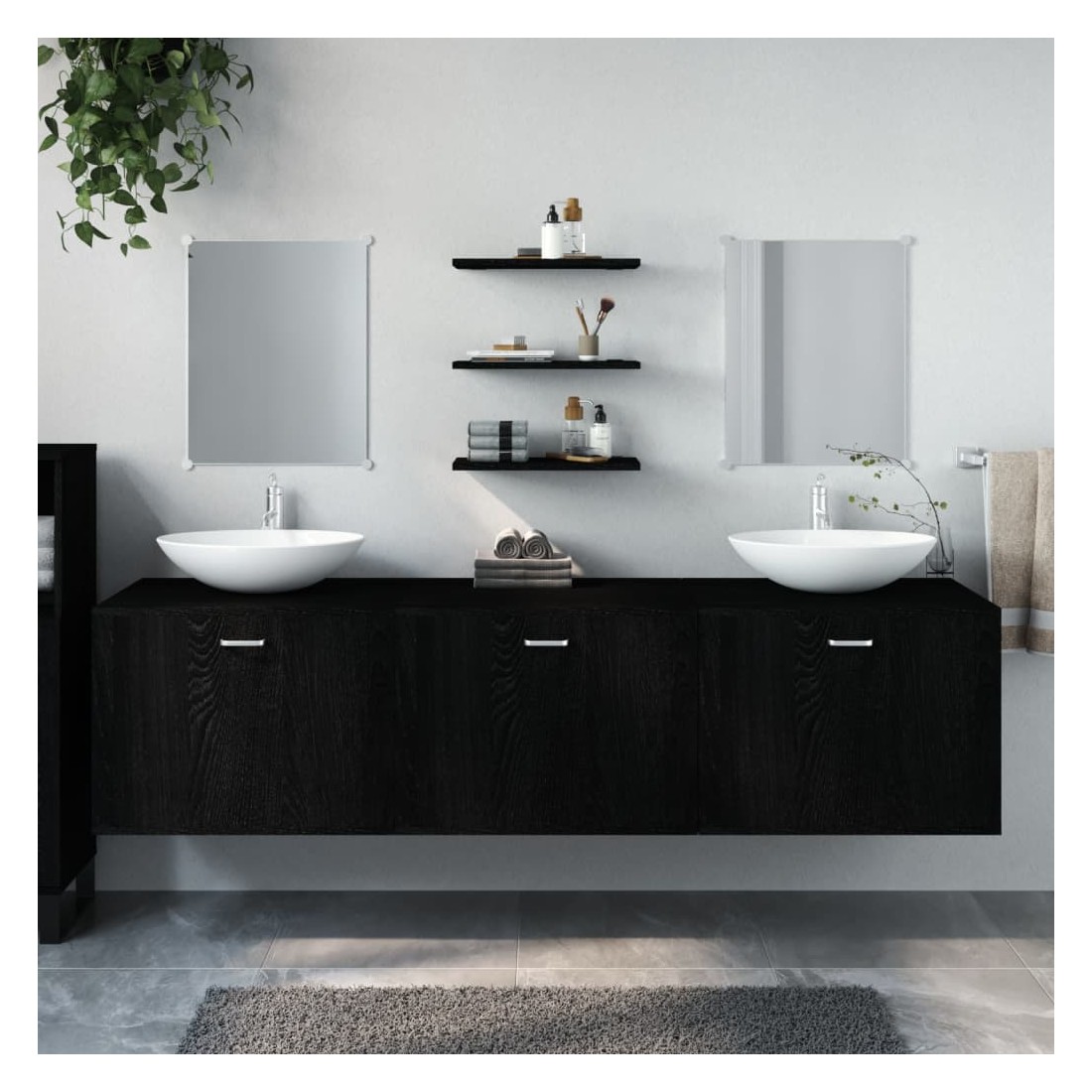Cet ensemble de meubles de salle de bain tendance est un excellent supplément à votre salle de bain, ce qui lui donne une apparence ordonnée et saisissante ! Matériau durable : le bois d'ingénierie est d'une qualité exceptionnelle avec une surface lisse et présente également résistance, stabilité et résistance à l'humidité. Rangement supplémentaire : l'armoire de toilette offre un espace de rangement supplémentaire pour ranger les éléments essentiels de votre salle de bains. Le dessus de l'armoire est idéal pour placer le lavabo. Fonction murale : l'armoire ne prend pas de place au sol. Vous pouvez facilement l'accrocher au mur. Miroir pratique : utilisez le miroir inclus pour soigner votre habillage quotidien. Il ajoute également une excellente apparence à votre décoration intérieure. Bon à savoir :Le lavabo n'est pas inclus dans la livraison. Le drain est inclus dans la livraison.Les vis et les chevilles pour l'intérieur du mur ne sont pas incluses. Nous vous conseillons de trouver et d'utiliser des vis et des chevilles adaptées spécifiquement à vos murs. Si vous n'êtes pas sûr, vous pouvez consulter un professionnel. Veuillez lire et suivre chaque étape des instructions.