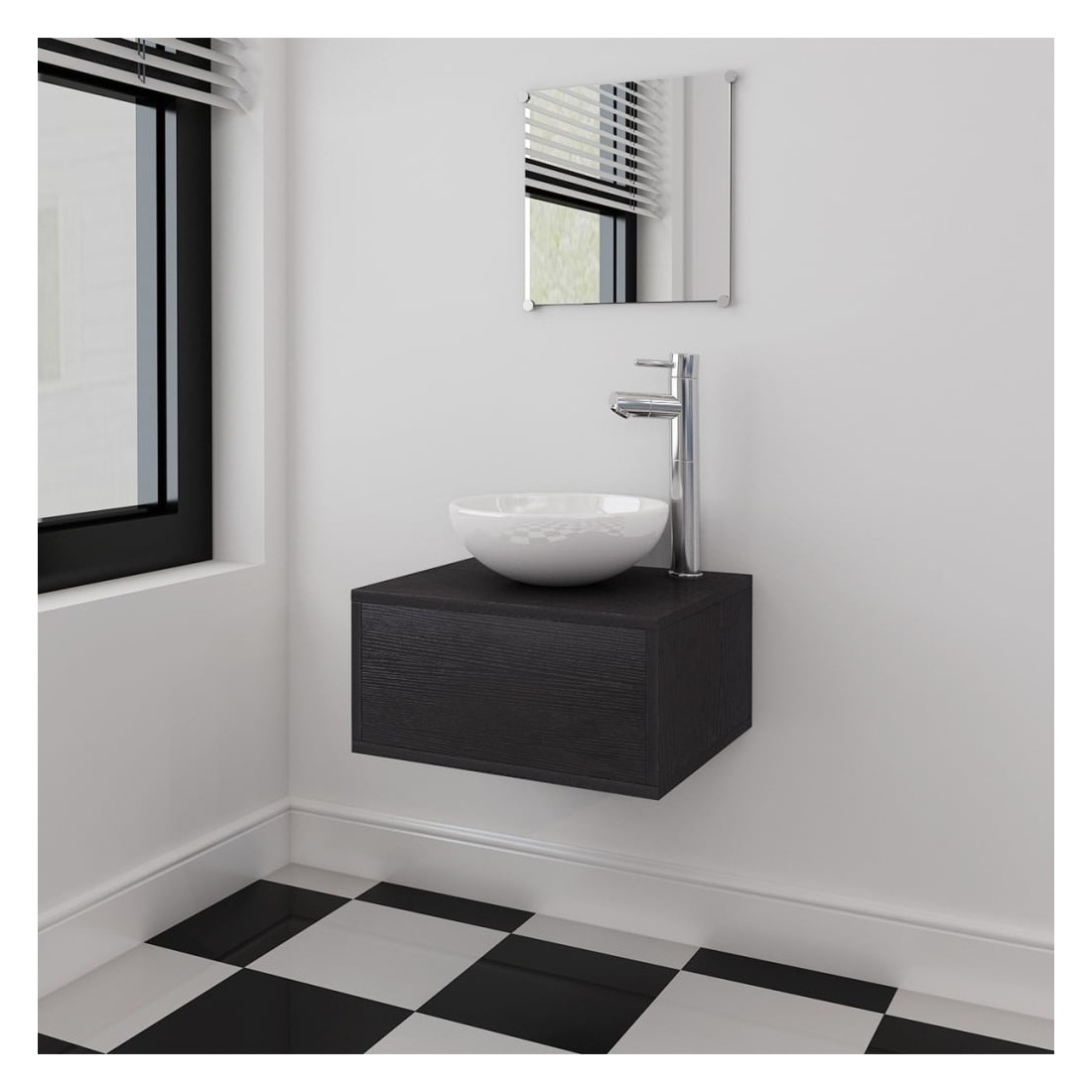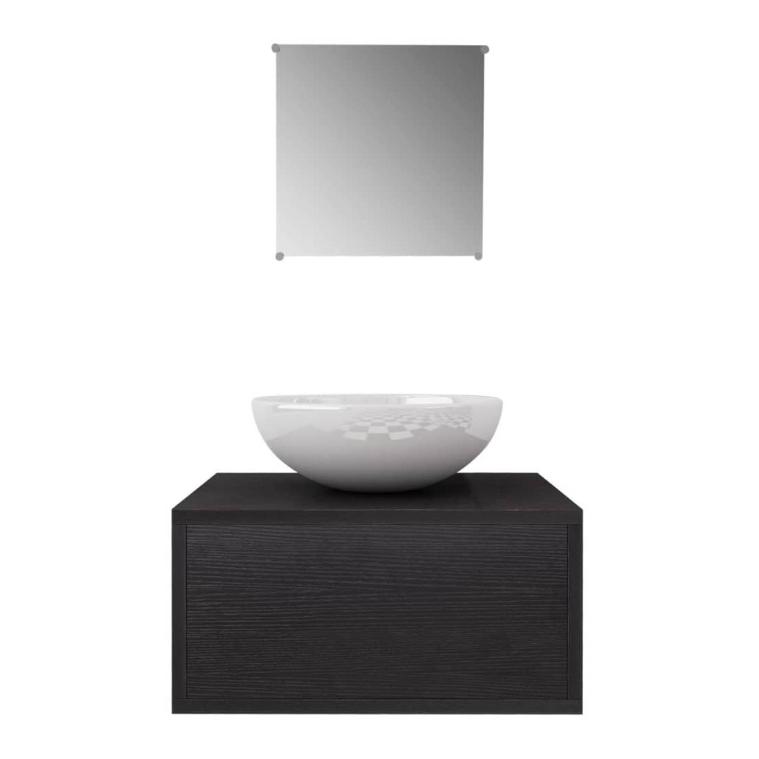 Cet ensemble complet, composé de 1 armoire de lavabo mural, 1 miroir et 1 lavabo, sera un excellent ajout à votre salle de bains, en améliorant votre espace sans compromettre le style. L'ensemble de meubles de salle de bain comprend un miroir et un meuble de vasque. La taille compacte et le design minimaliste en font un excellent supplément à toute salle de bain moderne. Fabriqué en panneaux de particules de haute qualité, ce meuble-lavabo est très robuste et durable. Le lavabo est en céramique de haute qualité, qui est résistant aux rayures, à la corrosion et facile à nettoyer. Il peut être monté au-dessus du comptoir. Le montage est vraiment facile. La livraison comprend également un bouchon de vidange et des accessoires de montage. Veuillez noter: le robinet n'est pas inclus dans la livraison; le trou pour le robinet n'est pas pré-percé.