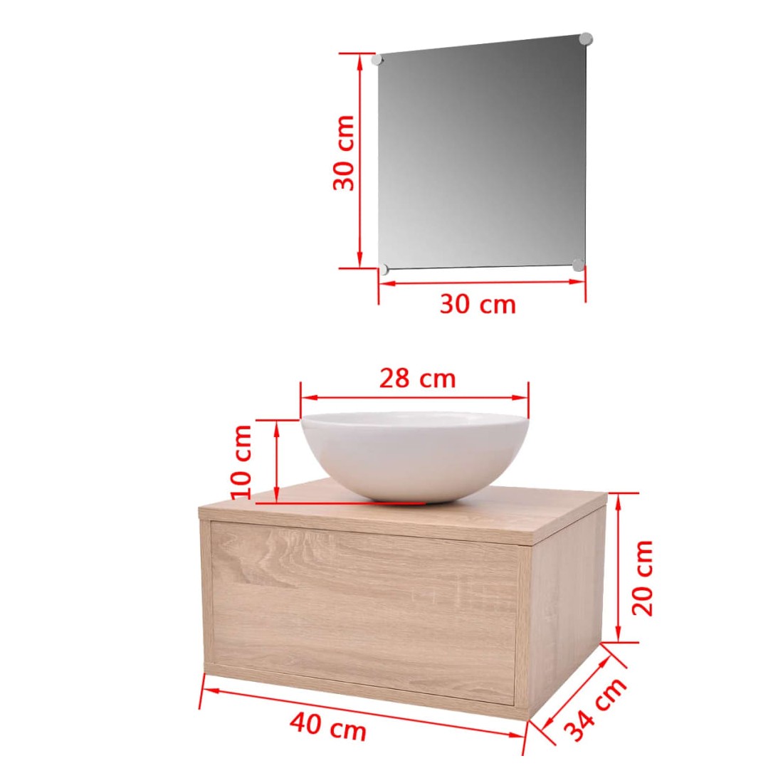 • Dimensions de l'armoire du lavabo : 40 x 34 x 20 cm (L x P x H)