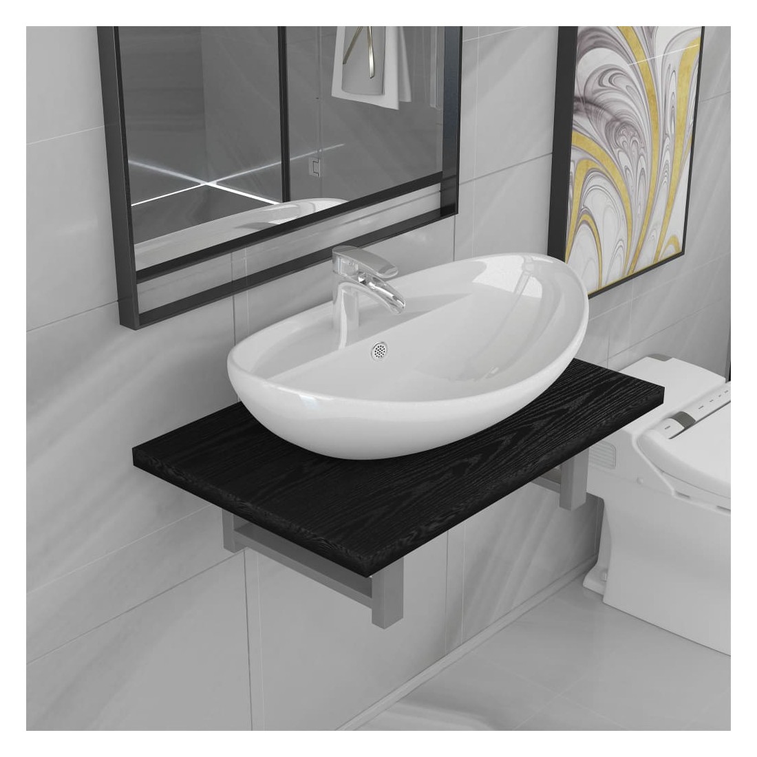 Notre ensemble de meubles de salle de bain pratique et intemporel se compose d'une étagère murale et d'un lavabo de forme ovale. Il fera un ajout élégant à toute salle de bain, salle d'eau ou toilette. Fabriquée dans un matériau solide, l'étagère murale de salle de bain est extrêmement stable et durable, ce qui en fait l'endroit idéal pour placer le lavabo en céramique inclus. Ce lavabo en céramique a une finition brillante et est facile à nettoyer avec un chiffon humide. De plus, les meubles de salle de bain peuvent être facilement installés sur le mur avec nos supports et matériaux de montage inclus. La combinaison parfaite de l'étagère murale et du lavabo sera le point d'attention de votre salle de bain ! Veuillez noter qu'aucun drain n'est inclus dans la livraison.