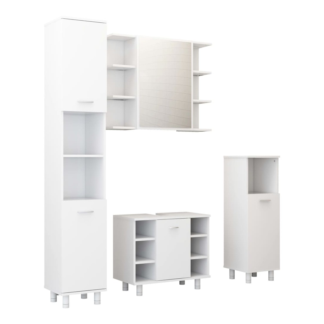 Cet élégant ensemble de meubles de salle de bain comprend 1 armoire haute, 1 armoire de taille moyenne, 1 armoire sous lavabo et 1 armoire à miroir. Il crée un espace de rangement supplémentaire pour votre salle de bain avec un aspect superbe et soigné. Fabriqué en bois d'ingénierie haut de gamme, cet ensemble est durable et stable. L’armoire haute chic a 6 compartiments et 2 portes tandis que l’armoire de taille moyenne a 3 compartiments et 1 porte. Les deux offrent un espace spacieux pour ranger vos articles essentiels dans votre salle de bain. L’armoire de lavabo dispose de 7 compartiments et d'1 porte, offrant suffisamment d'espace pour ranger vos articles de toilette, produits de beauté et divers essentiels. L'armoire à miroir comporte 1 porte et 8 compartiments au total. Les 6 compartiments extérieurs et les 2 compartiments intérieurs offrent un espace supplémentaire pour accueillir facilement vos articles de bain. Le miroir ajoute également une excellente apparence à votre décoration intérieure existante. En outre, cet ensemble de salle de bain est facile à nettoyer avec un chiffon humide.