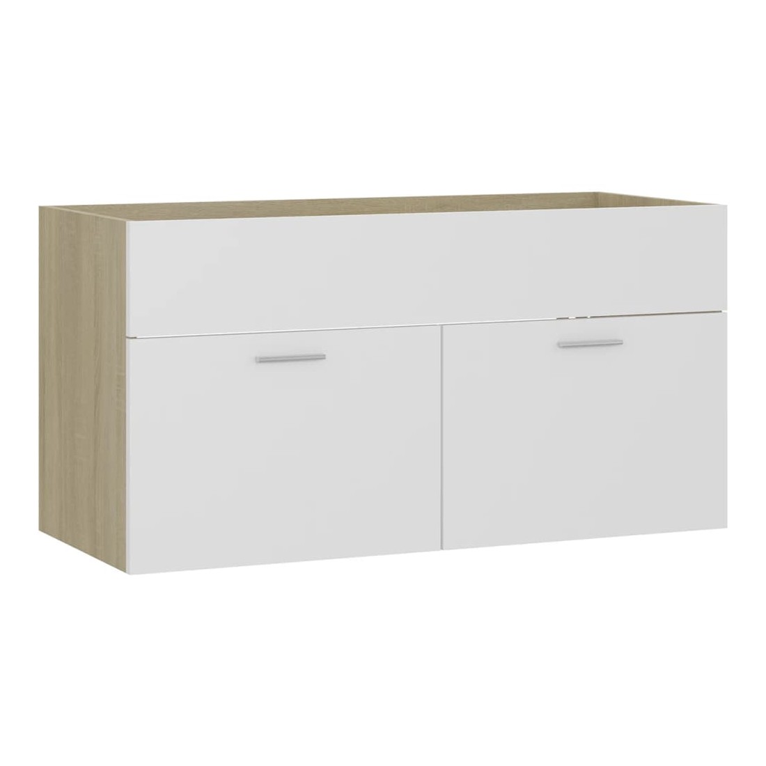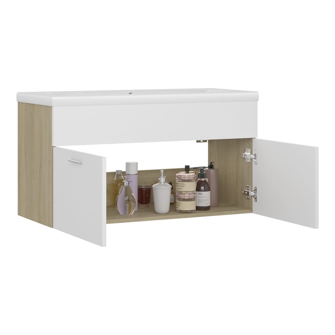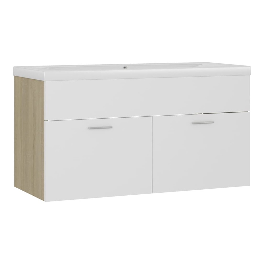 Cette armoire d'évier avec lavabo intégré s'agence parfaitement à votre salle de bain ou toilette avec un aspect saisissant et bien rangé. L'armoire est en bois d'ingénierie, ce qui la rend robuste et stable. L'armoire de rangement a 1 compartiment et 2 portes, offrant amplement d'espace pour ranger des objets. Elle s'intègre parfaitement sous l'évier et rend le rangement de la salle de bain très pratique. Fabriqué en céramique, le lavabo peut non seulement servir de récipient pour un usage quotidien, mais également d'ornement dans votre espace de vie. Grâce à son design avant-gardiste et contemporain, ce lavabo s'adaptera à n'importe quel décor. Un trop-plein est également équipé pour évacuer l'eau lorsqu'il est trop plein. Sa surface vitrée lui confère un design à la fois moderne et élégant. De plus, l'armoire et le lavabo sont faciles à nettoyer avec un chiffon humide. Remarque : le robinet et le vidange ne sont pas inclus dans la livraison.
