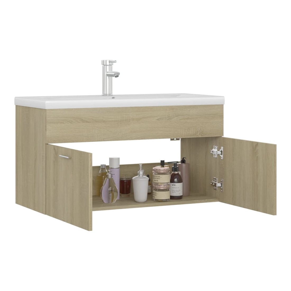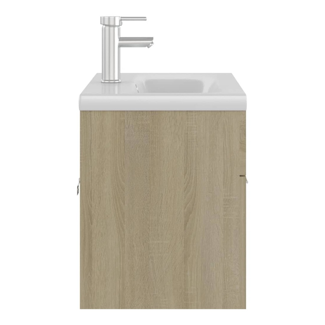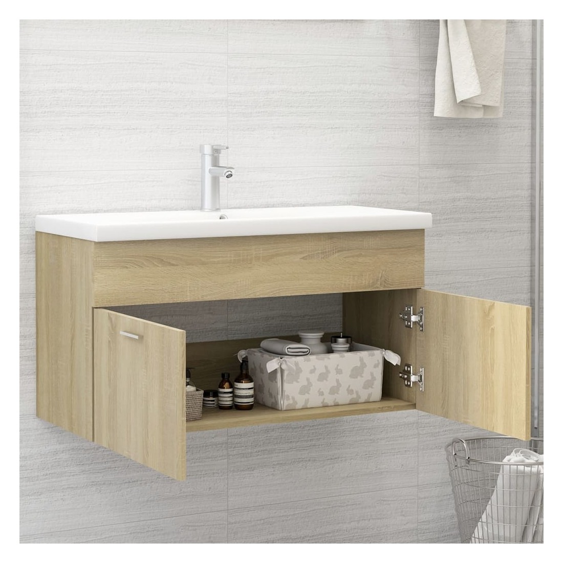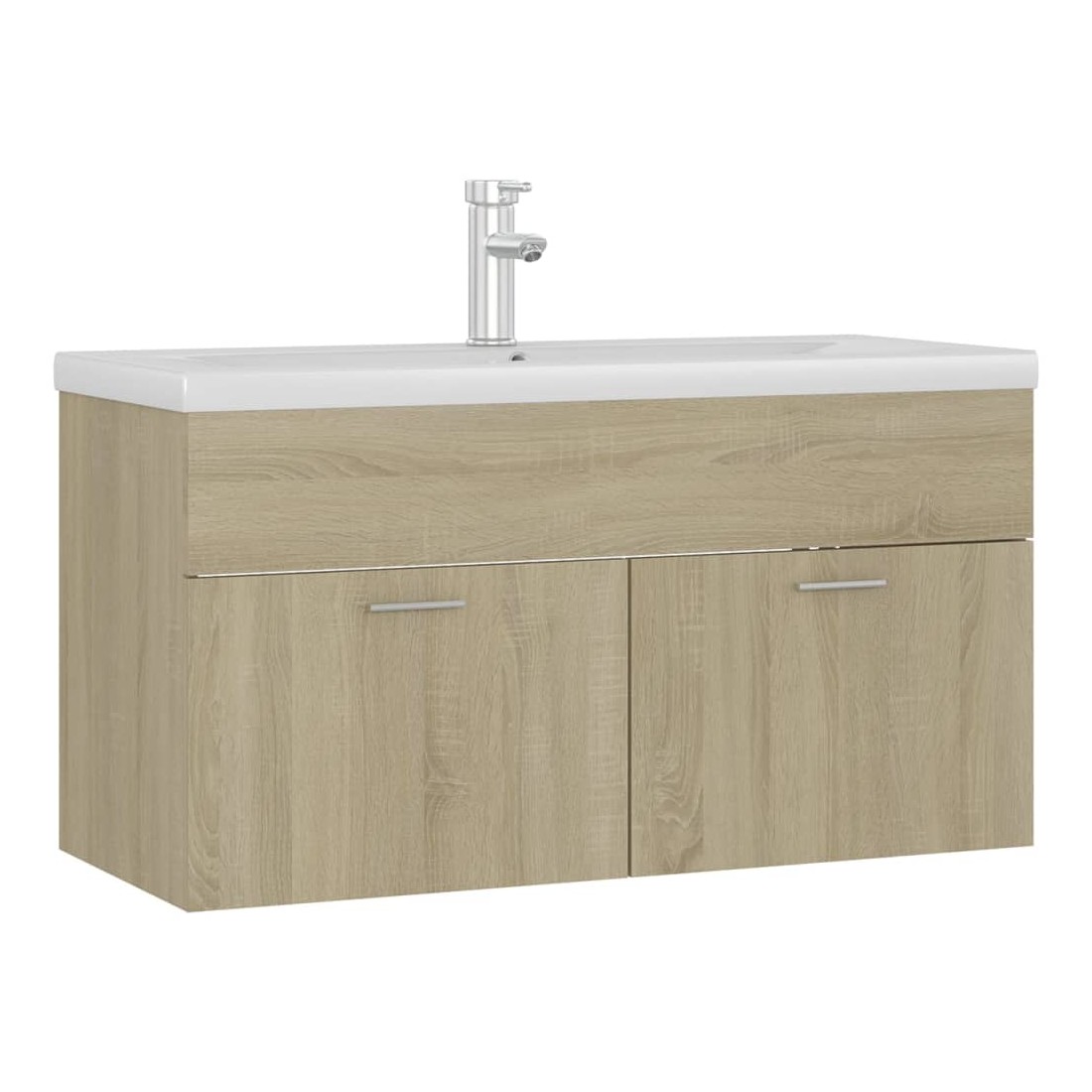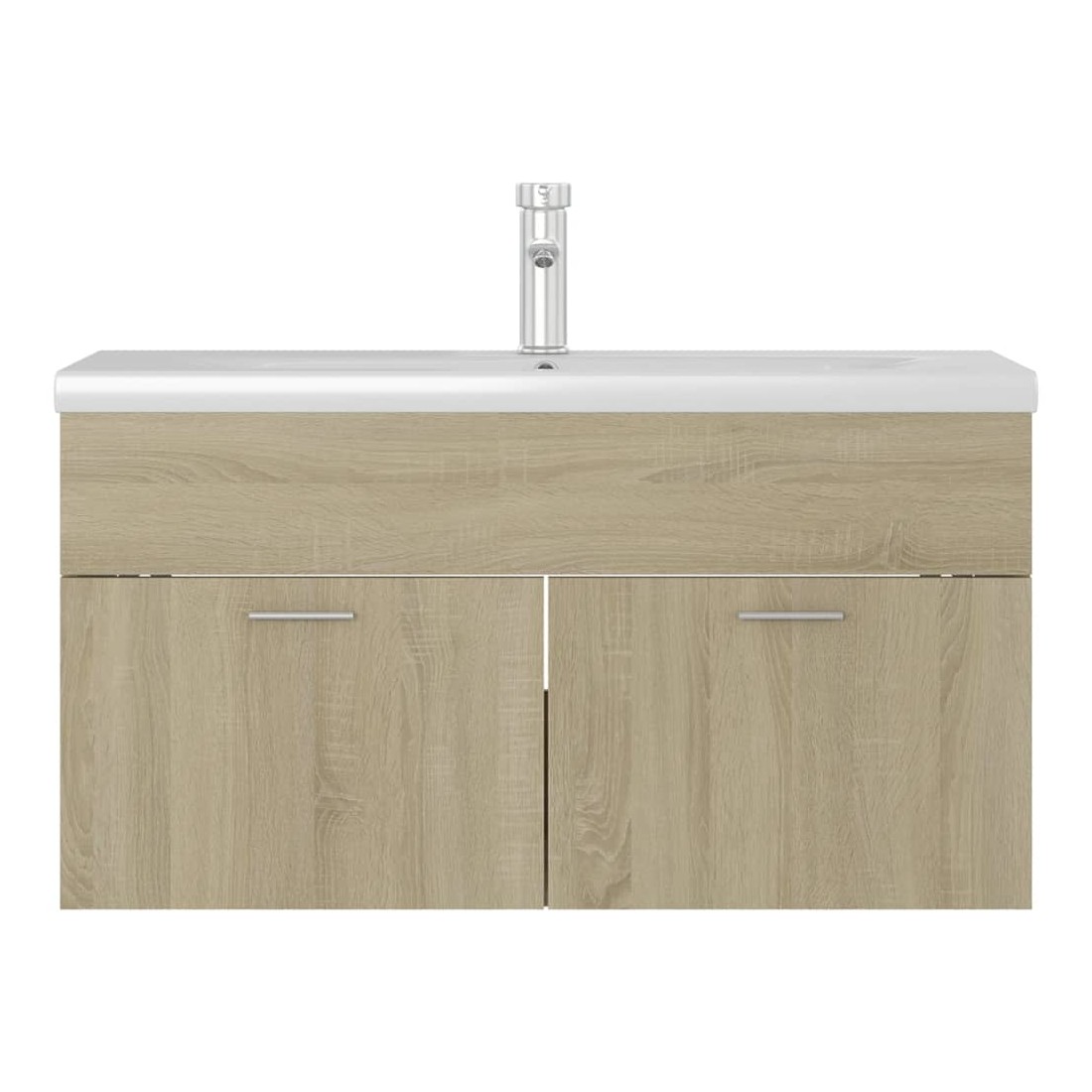 Cette armoire d'évier avec lavabo intégré s'agence parfaitement à votre salle de bain ou toilette avec un aspect saisissant et bien rangé. L'armoire est en aggloméré, ce qui la rend robuste et stable. L'armoire de rangement a 1 compartiment et 2 portes, offrant amplement d'espace pour ranger des objets. Elle s'intègre parfaitement sous l'évier et rend le rangement de la salle de bain très pratique. Fabriqué en céramique, le lavabo peut non seulement servir de récipient pour un usage quotidien, mais également d'ornement dans votre espace de vie. Grâce à son design avant-gardiste et contemporain, ce lavabo s'adaptera à n'importe quel décor. Un trop-plein est également équipé pour vidanger l'eau lorsqu'il est trop plein. Sa surface vitrée lui confère un design à la fois moderne et élégant. De plus, l'armoire et le lavabo sont faciles à nettoyer avec un chiffon humide. Remarque : le robinet et l'égouttoir à poussoir avec fonction de trop-plein sont inclus dans la livraison.