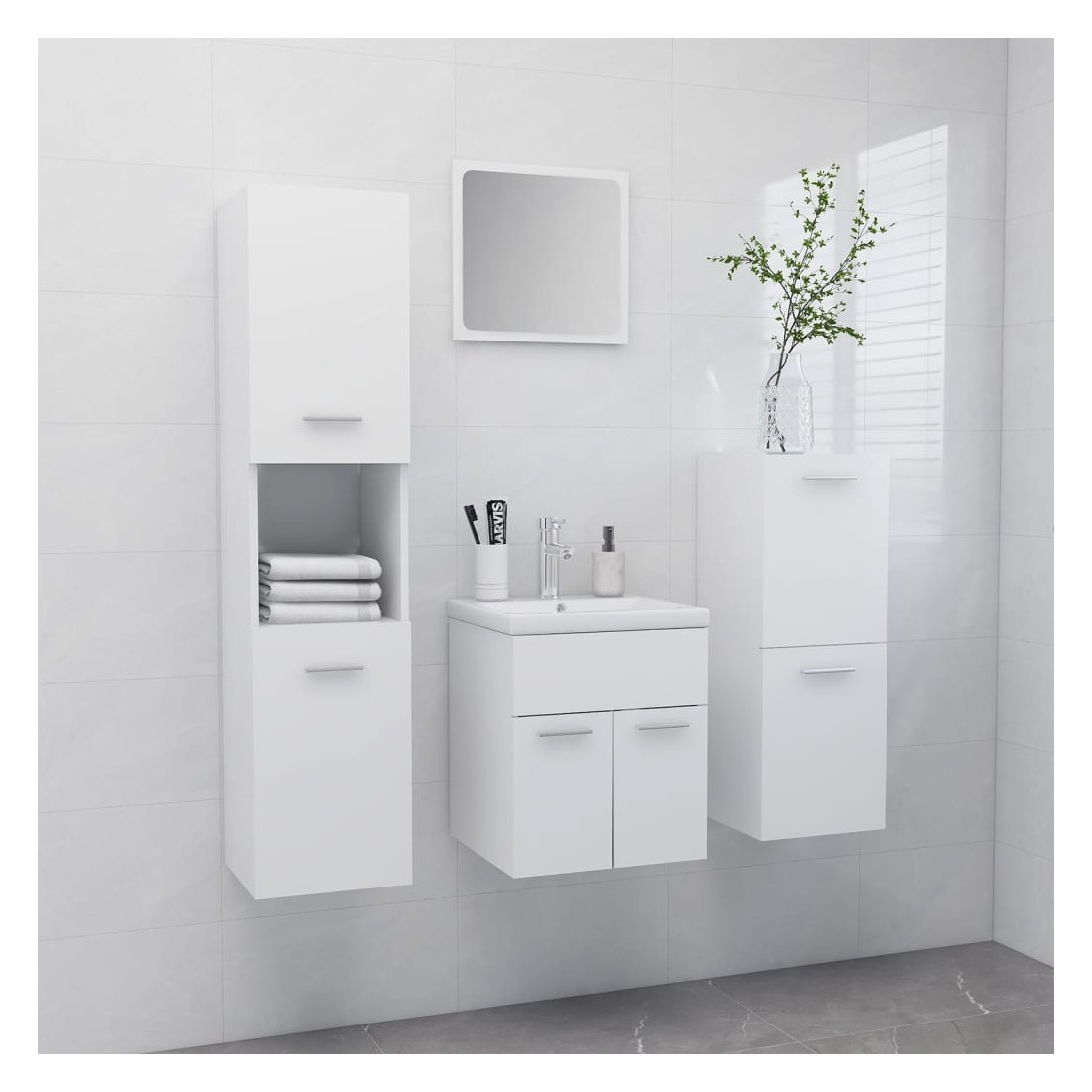 Avec cet élégant ensemble de meubles de salle de bain, vous pouvez créer un espace de rangement supplémentaire pour votre salle de bain avec un aspect remarquable et bien rangé. Les lignes épurées et le design élégant s'intègrent parfaitement à votre salle de bain. L’ensemble de meubles se compose d’une armoire de lavabo, d’une armoire basse, d’une armoire haute, d’un lavabo encastré et d’un miroir. L’armoire de lavabo chic a 1 compartiment et le dessus de celle-ci est idéal pour placer l’évier. L’armoire haute dispose d’un total de 5 compartiments et de 2 portes tandis que l’armoire basse dispose de 2 compartiments. Ces 2 armoires offrent diverses options de rangement et un espace supplémentaire pour ranger des articles dans votre salle de bain. Fabriqué en céramique, ce lavabo peut non seulement servir de récipient pour une utilisation quotidienne, mais aussi comme ornement dans votre espace de vie. Grâce à son design tendance et contemporain, ce lavabo conviendra à tout décor. Un trop-plein est équipé pour vidanger l’eau quand il est trop plein. Le miroir ajoute également une excellente apparence à votre décoration intérieure. De plus, cet ensemble de salle de bain est facile à nettoyer avec un chiffon humide. Remarque : le robinet et l'égouttoir à poussoir avec fonction de trop-plein sont inclus dans la livraison.