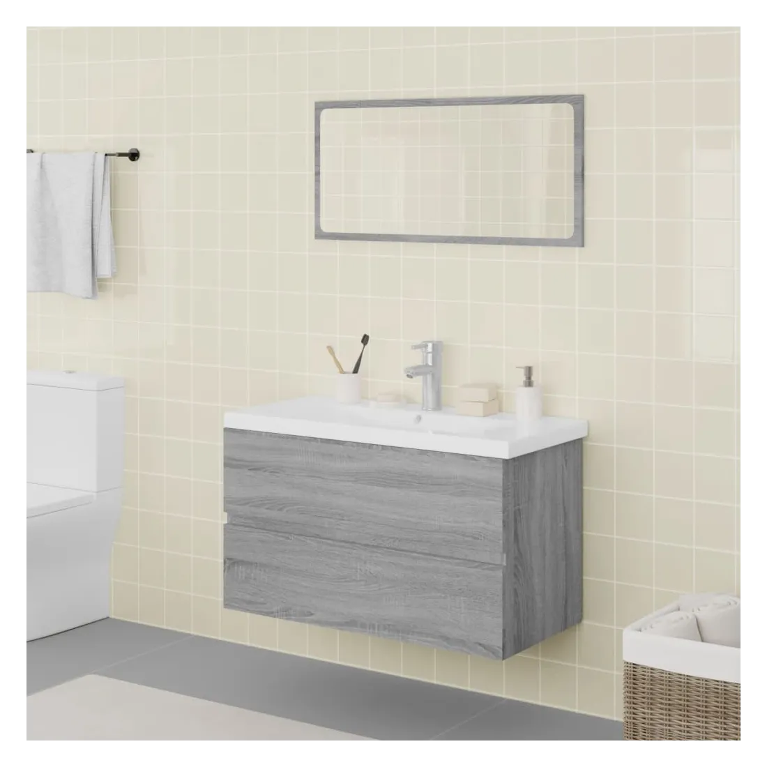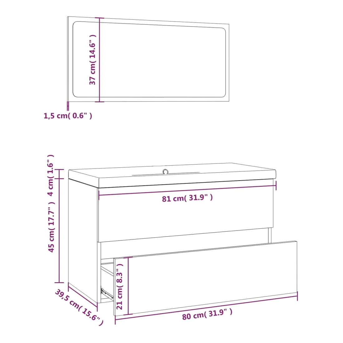 Cet ensemble de meubles de salle de bain, avec un espace de rangement spacieux, est un excellent supplément à votre salle de bain, ce qui lui donne une apparence ordonnée et saisissante ! Matériau robuste : le meuble sous évier est fabriqué en bois d'ingénierie, qui est d'une qualité exceptionnelle avec une surface lisse et se caractérise également par sa solidité, stabilité et résistance à l'humidité.Grand espace de rangement : le meuble lavabo de salle de bain dispose d'un tiroir, offrant un grand espace de rangement pour ranger des articles dans votre salle de bain.Design pratique : le dessus de ce meuble de salle de bain est idéal pour placer le lavabo.Fonction murale : l'armoire de salle de bain et le miroir de maquillage peuvent être fixés au mur pour plus d'espace de rangement. De cette façon, vous pouvez maximiser votre espace au sol et garder la zone propre.Fonction de trop-plein : un trop-plein est également équipé pour vidanger l'eau lorsqu'il est trop plein. Remarque :Les vis et les chevilles pour l'intérieur du mur ne sont pas incluses. Recherchez et utilisez des vis et des chevilles adaptées à vos murs. Si vous n'êtes pas sûr, demandez conseil à un professionnel. Lisez et suivez attentivement chaque étape des instructions.Le robinet et le vidange ne sont pas inclus dans la livraison.Chaque produit est livré avec un manuel de montage dans la boîte pour un montage facile.