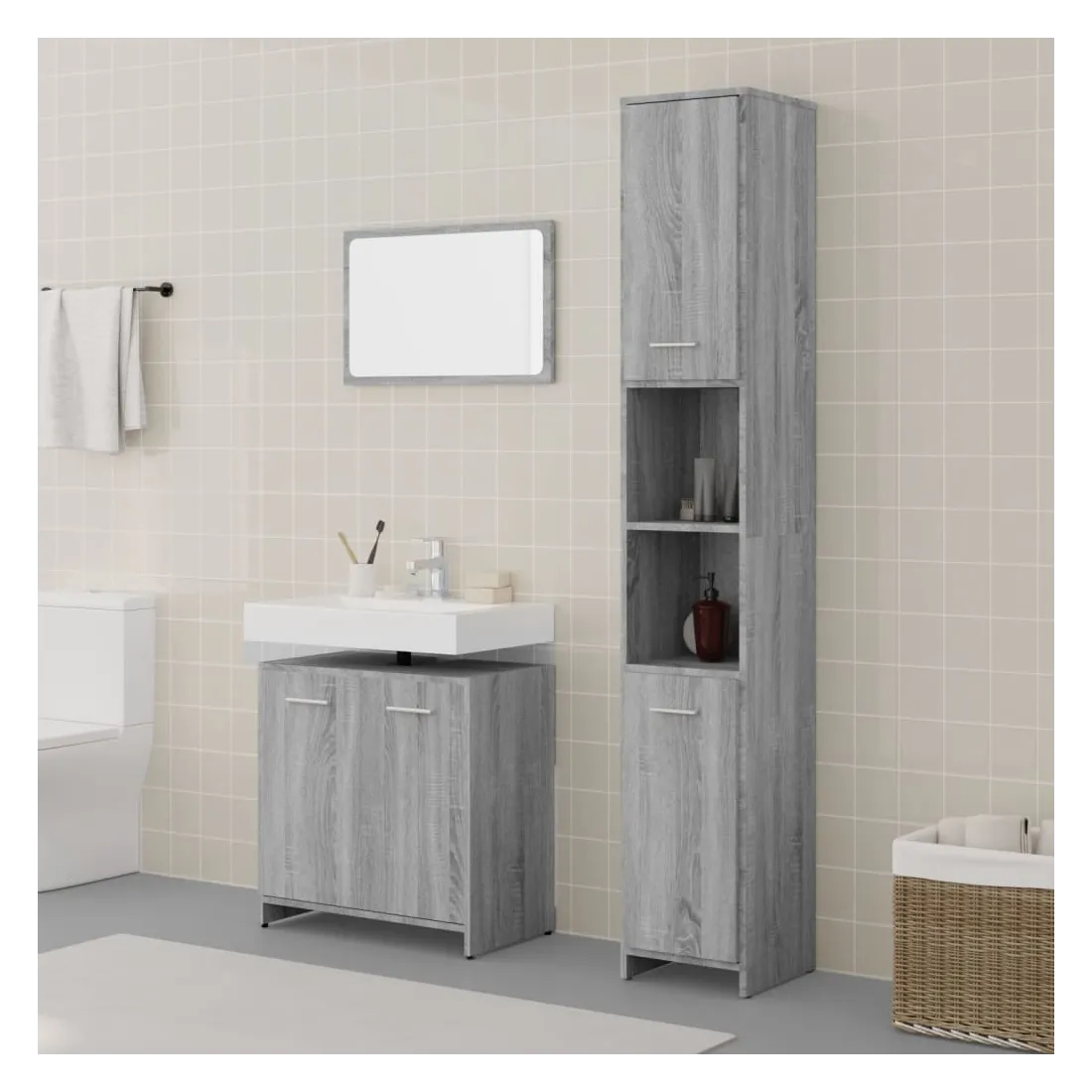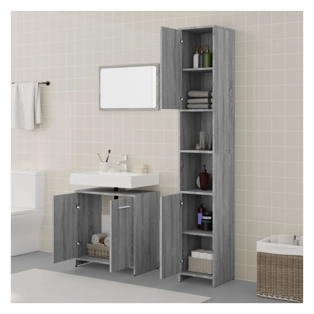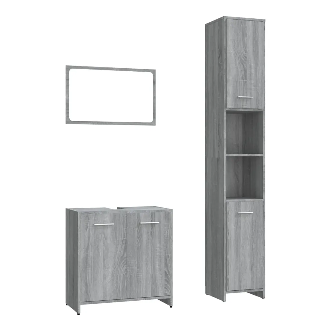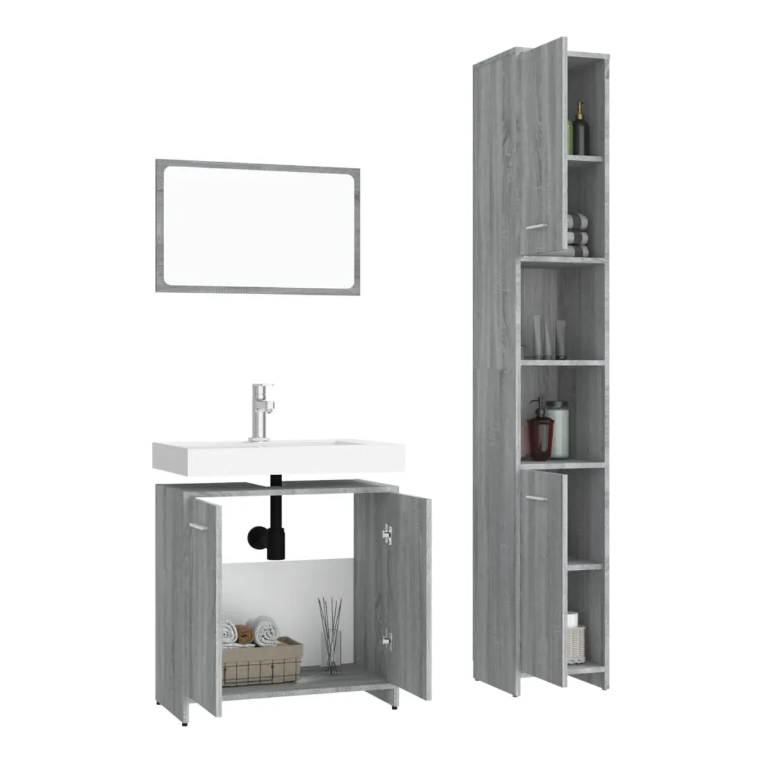 Cet ensemble de meubles de salle de bain élégant de 3 pièces, avec un espace de rangement spacieux, est un excellent supplément à votre salle de bain, ce qui lui donne un aspect soigné et impressionnant ! Matériau pratique : le bois d'ingénierie est d'une qualité exceptionnelle avec une surface lisse et présente également résistance, stabilité et résistance à l'humidité.Grand espace de rangement : cette armoire à miroir de salle de bain offre un grand espace de rangement pour garder vos articles de buanderie, articles de toilette et autres articles bien organisés et à portée de main. Vous pouvez créer et utiliser de manière optimale un espace de rangement supplémentaire dans votre salle de bain.Miroir utilitaire : l'armoire de salle de bain avec miroir est parfaite pour votre routine beauté quotidienne. Le miroir vous permet de prendre soin de la peau de votre visage et de vous maquiller aussi !Design élégant : les lignes épurées et le design élégant font que cette armoire de lavabo de salle de bain s'intègre parfaitement dans votre salle de bain. Attention :Afin d'éviter qu'il ne bascule, ce produit doit être utilisé avec le dispositif de fixation murale fourni. Remarque :Les vis et les chevilles pour l'intérieur du mur ne sont pas incluses. Recherchez et utilisez des vis et des chevilles adaptées à vos murs. Si vous n'êtes pas sûr, demandez conseil à un professionnel. Lisez et suivez attentivement chaque étape des instructions.Chaque produit est livré avec un manuel de montage dans la boîte pour un montage facile.