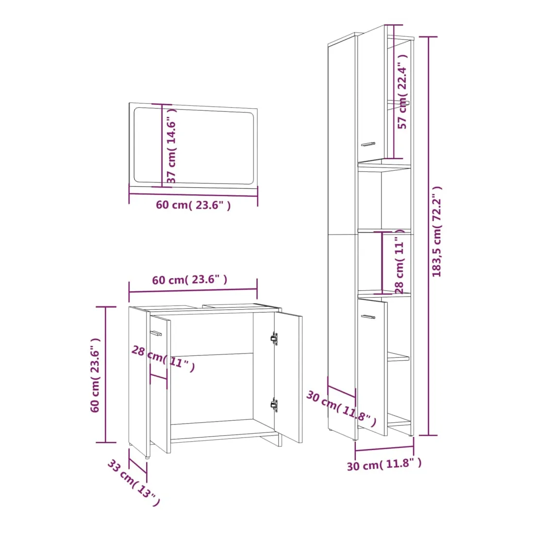 - Dimensions de l'armoire sous lavabo : 60 x 33 x 60 cm (l x P x H)