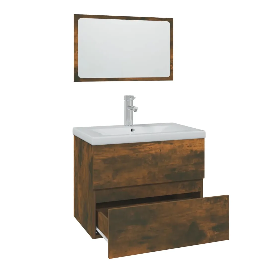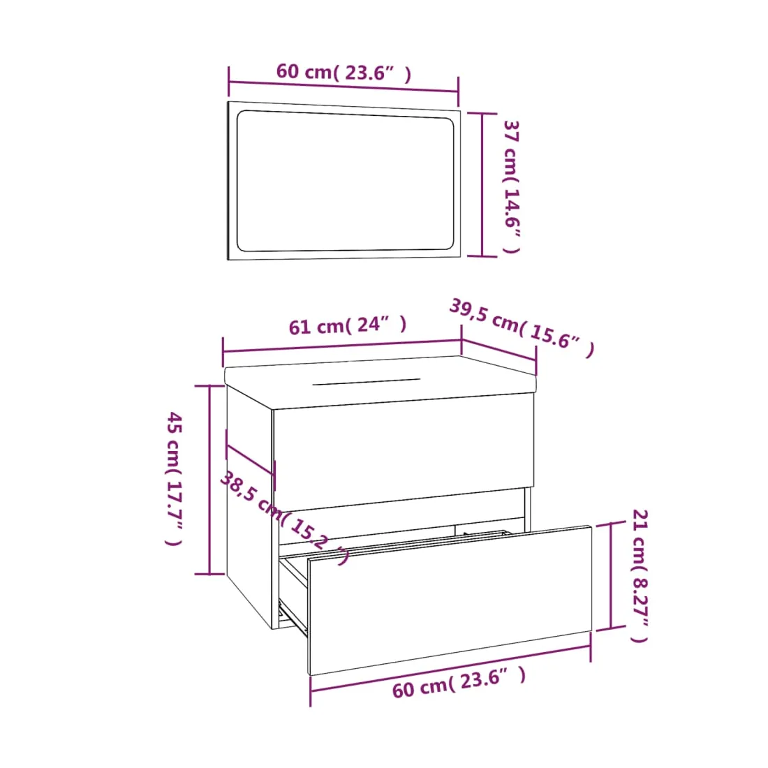 Cet ensemble de meubles de salle de bain, avec un espace de rangement spacieux, est un excellent supplément à votre salle de bain, ce qui lui donne une apparence ordonnée et saisissante ! Matériau robuste : le meuble sous évier est fabriqué en bois d'ingénierie, qui est d'une qualité exceptionnelle avec une surface lisse et se caractérise également par sa solidité, stabilité et résistance à l'humidité.Grand espace de rangement : le meuble lavabo de salle de bain dispose d'un tiroir, offrant un grand espace de rangement pour ranger des articles dans votre salle de bain.Design pratique : le dessus de ce meuble de salle de bain est idéal pour placer le lavabo.Fonction murale : l'armoire de salle de bain et le miroir de maquillage peuvent être fixés au mur pour plus d'espace de rangement. De cette façon, vous pouvez maximiser votre espace au sol et garder la zone propre.Fonction de trop-plein : un trop-plein est également équipé pour vidanger l'eau lorsqu'il est trop plein. Remarque :Les vis et les chevilles pour l'intérieur du mur ne sont pas incluses. Recherchez et utilisez des vis et des chevilles adaptées à vos murs. Si vous n'êtes pas sûr, demandez conseil à un professionnel. Lisez et suivez attentivement chaque étape des instructions.Le robinet et le vidange ne sont pas inclus dans la livraison.Chaque produit est livré avec un manuel de montage dans la boîte pour un montage facile.