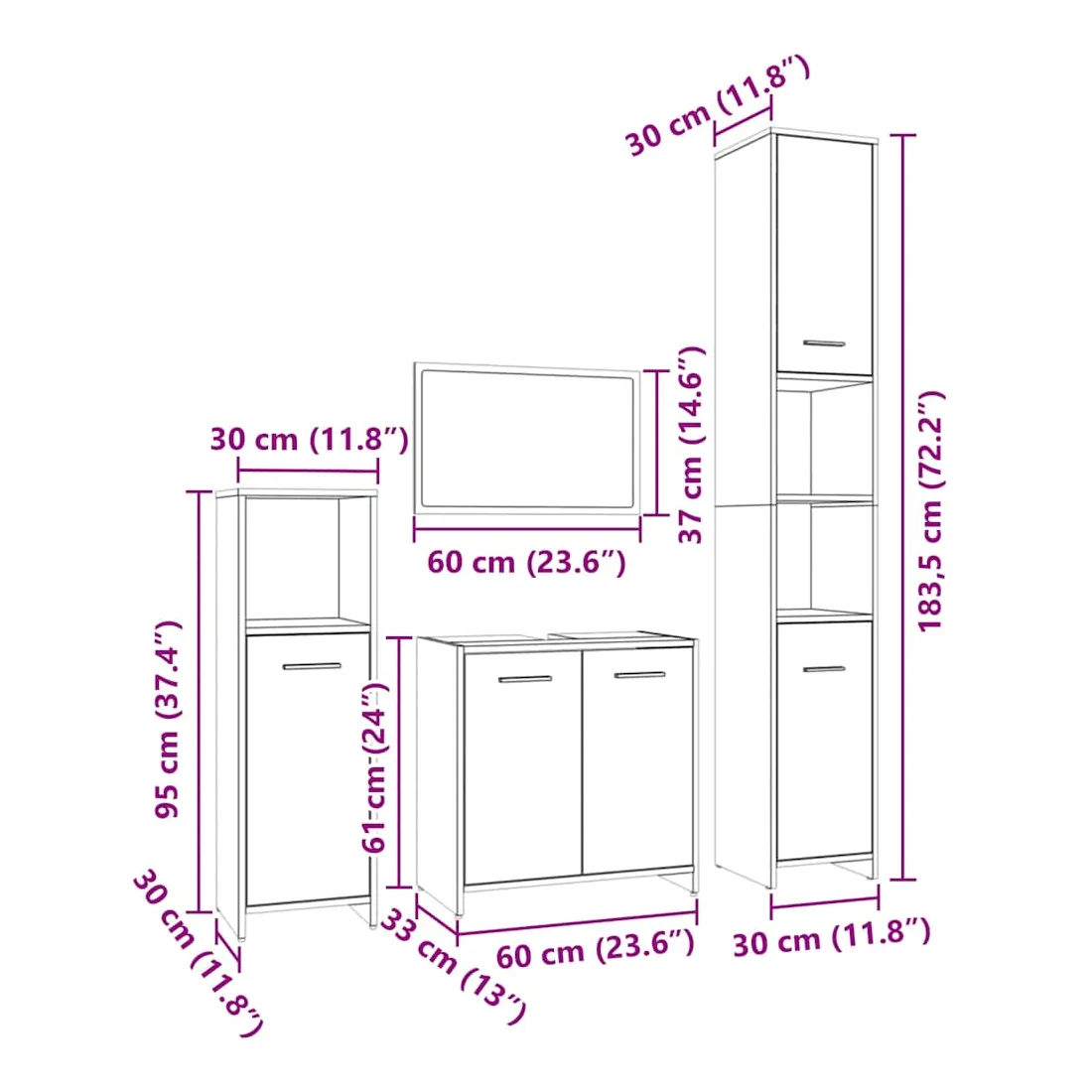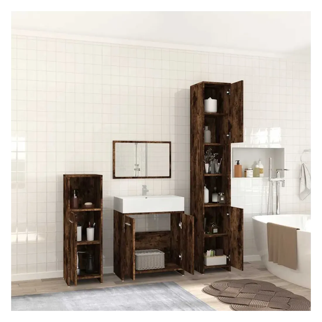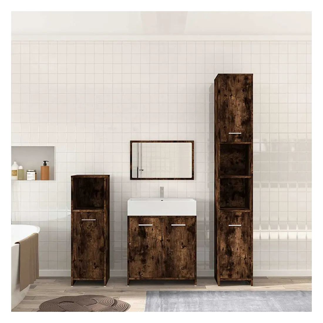 Cet ensemble de meubles de salle de bain de 4 pièces, doté d'un espace de rangement spacieux, est un supplément chic et intemporel à toute salle de bain ou toilettes. Matériau durable : le bois d'ingénierie est d'une qualité exceptionnelle avec une surface lisse et présente également résistance, stabilité et résistance à l'humidité.Grand espace de rangement : ces armoires de salle de bains offrent diverses options de rangement et un espace supplémentaire pour ranger les objets dans votre salle de bains. Design élégant : les lignes épurées et le design élégant font que ce meuble de salle de bain s'intègre parfaitement dans votre salle de bain. Le miroir ajoute également une excellente apparence à votre décor intérieur. Poignées pratiques : il y a une poignée sur chaque porte pour une meilleure ouverture et fermeture. Surface facile à nettoyer : l'unité d'évier de salle de bain est facile à nettoyer avec un chiffon humide. Attention :Afin d'éviter qu'il ne bascule, ce produit doit être utilisé avec le dispositif de fixation murale fourni. Remarque :Chaque produit est livré avec un manuel de montage dans la boîte pour un montage facile.Les vis et les chevilles pour l'intérieur du mur ne sont pas incluses. Recherchez et utilisez des vis et des chevilles adaptées à vos murs. Si vous n'êtes pas sûr, demandez conseil à un professionnel. Lisez et suivez attentivement chaque étape des instructions.Le panneau latéral de l'armoire haute se compose de deux parties connectées.