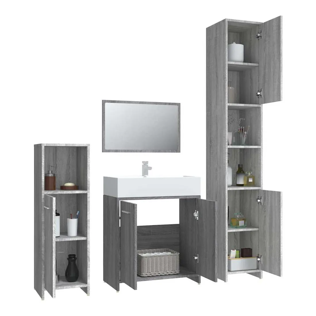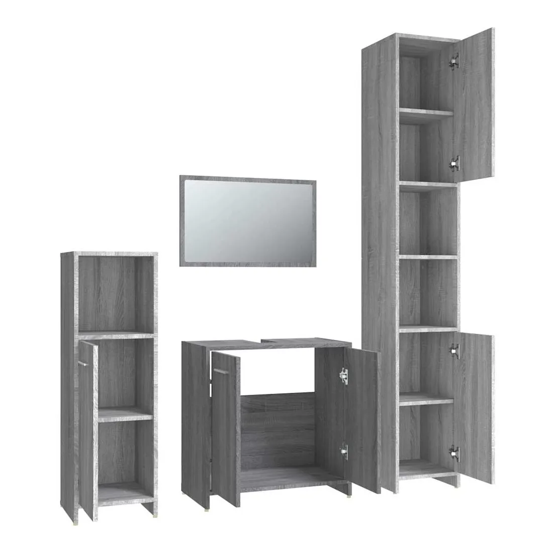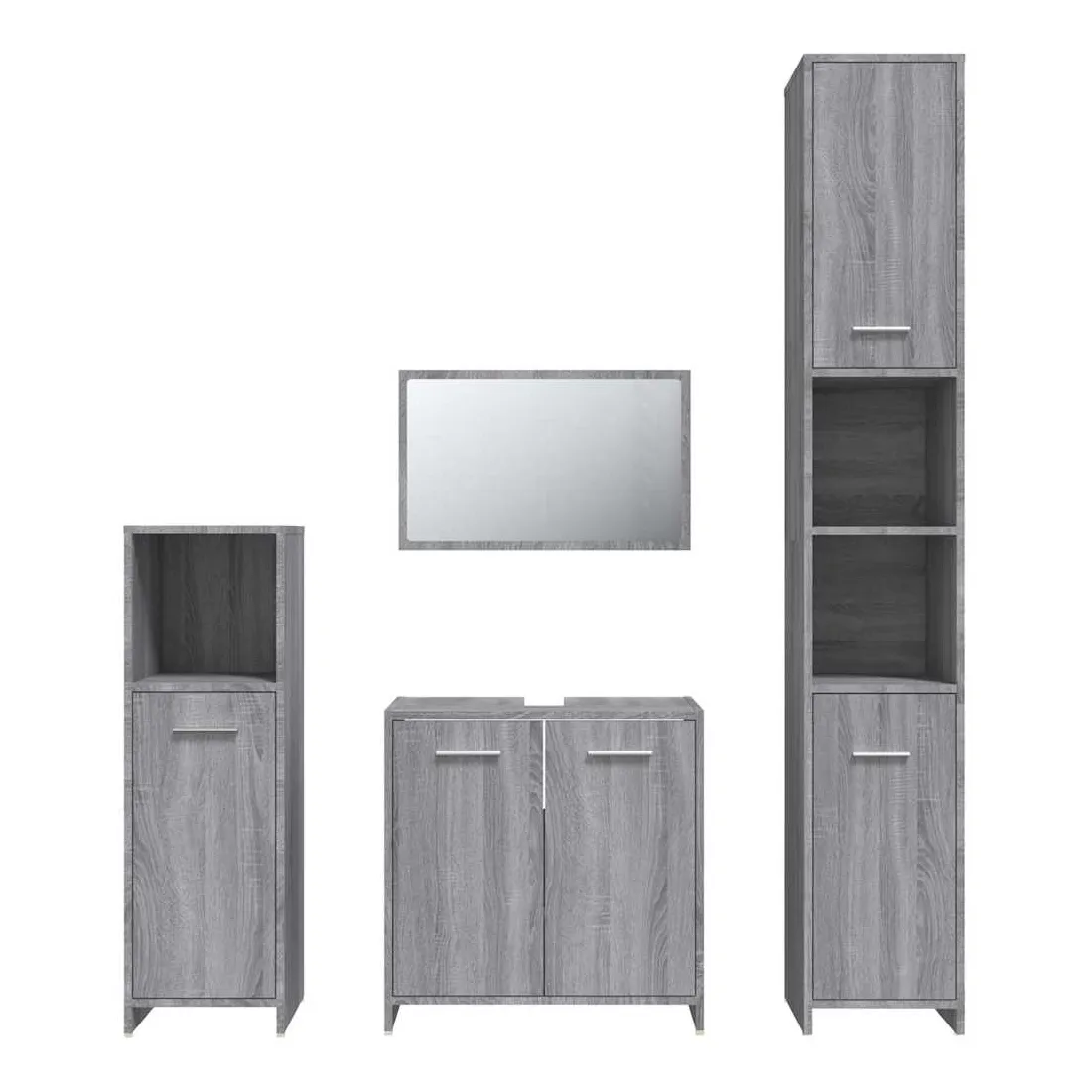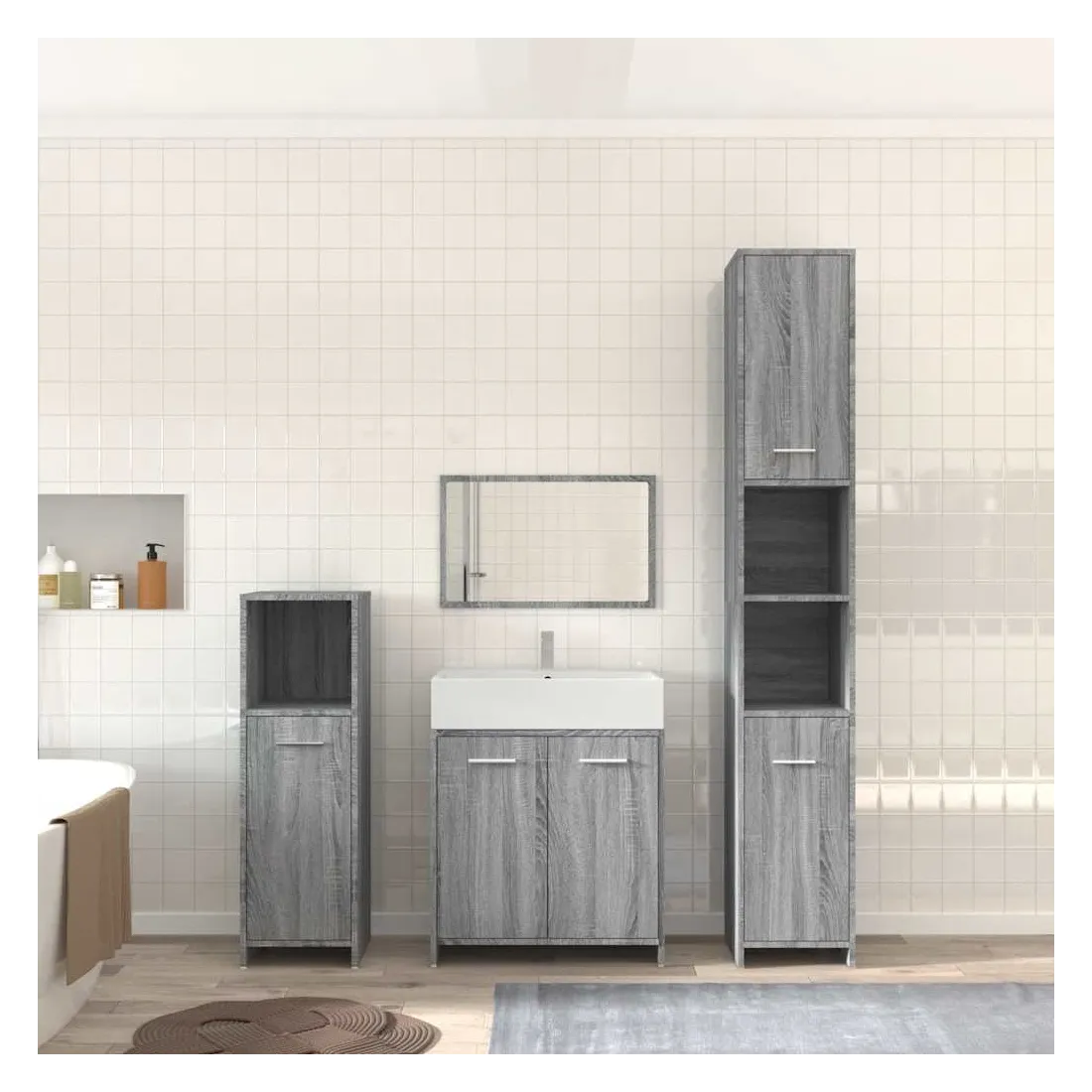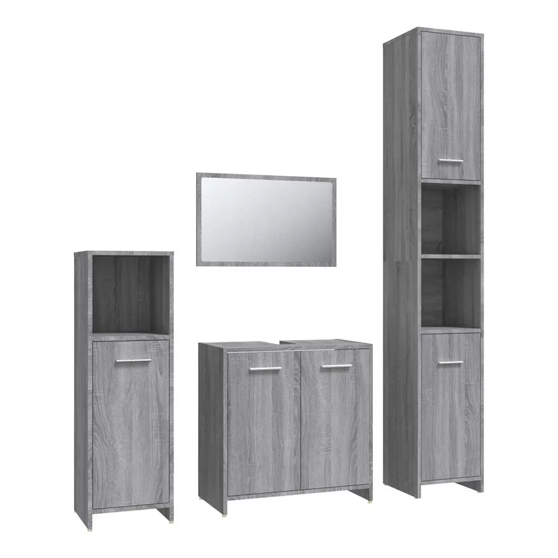 Cet ensemble de meubles de salle de bain de 4 pièces, doté d'un espace de rangement spacieux, est un supplément chic et intemporel à toute salle de bain ou toilettes. Matériau durable : le bois d'ingénierie est d'une qualité exceptionnelle avec une surface lisse et présente également résistance, stabilité et résistance à l'humidité.Grand espace de rangement : ces armoires de salle de bains offrent diverses options de rangement et un espace supplémentaire pour ranger les objets dans votre salle de bains. Design élégant : les lignes épurées et le design élégant font que ce meuble de salle de bain s'intègre parfaitement dans votre salle de bain. Le miroir ajoute également une excellente apparence à votre décor intérieur. Poignées pratiques : il y a une poignée sur chaque porte pour une meilleure ouverture et fermeture. Surface facile à nettoyer : l'unité d'évier de salle de bain est facile à nettoyer avec un chiffon humide. Attention :Afin d'éviter qu'il ne bascule, ce produit doit être utilisé avec le dispositif de fixation murale fourni. Remarque :Chaque produit est livré avec un manuel de montage dans la boîte pour un montage facile.Les vis et les chevilles pour l'intérieur du mur ne sont pas incluses. Recherchez et utilisez des vis et des chevilles adaptées à vos murs. Si vous n'êtes pas sûr, demandez conseil à un professionnel. Lisez et suivez attentivement chaque étape des instructions.Le panneau latéral de l'armoire haute se compose de deux parties connectées.