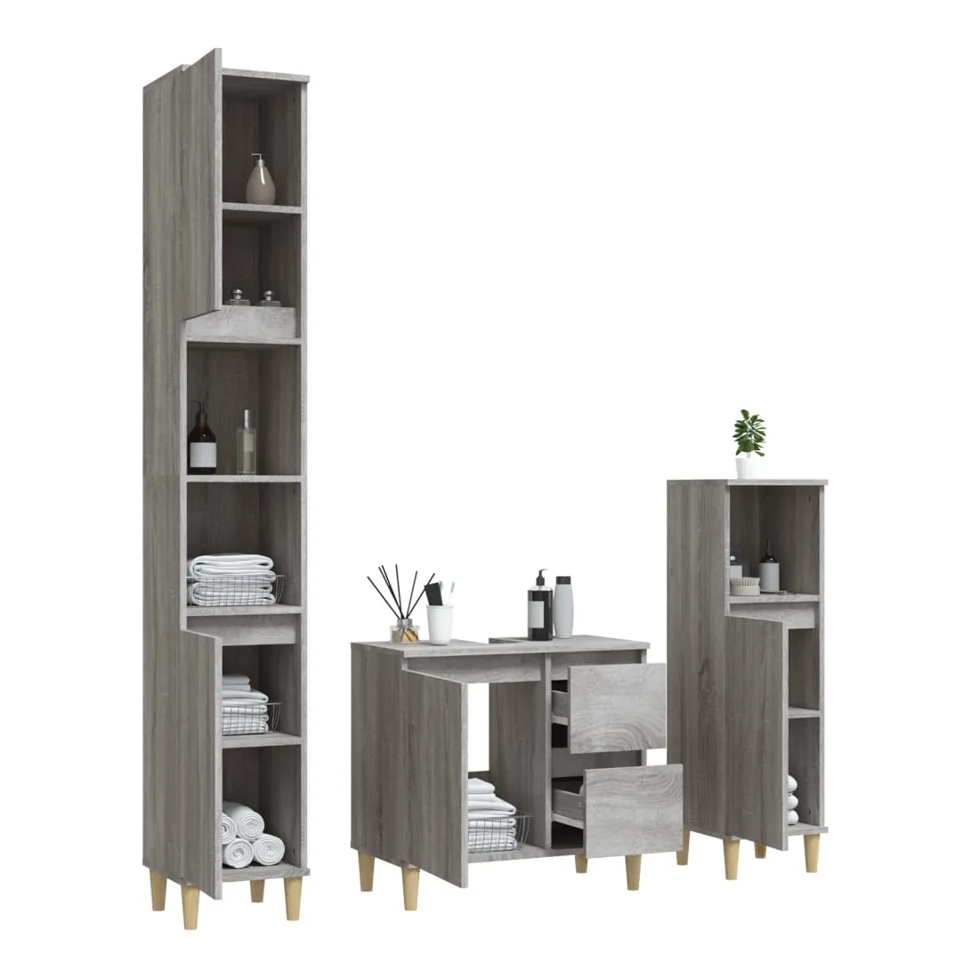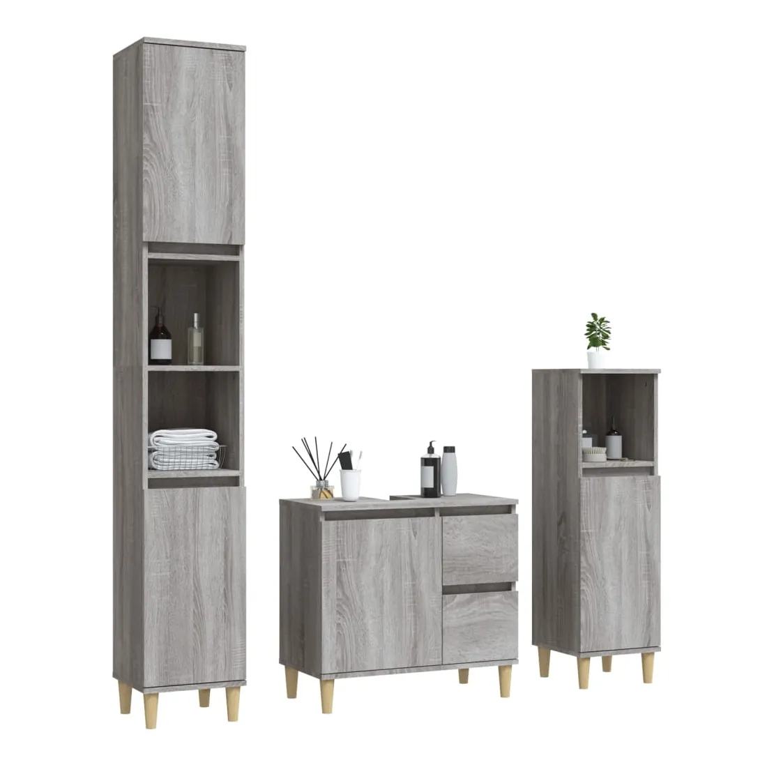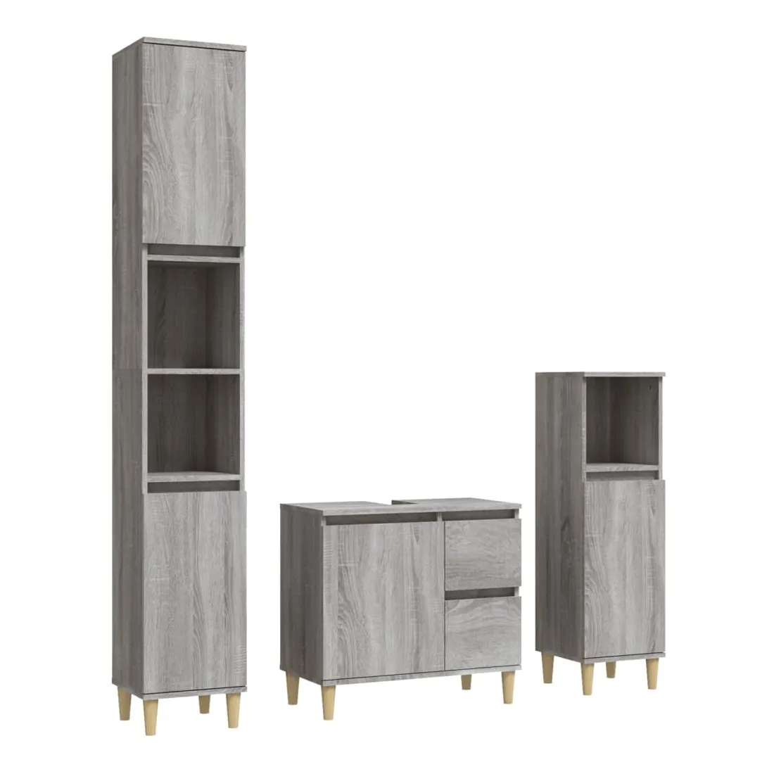 Cet ensemble d'armoires de salle de bain attrayant, avec un grand espace de rangement, présente un design élégant mais pratique. Matériau durable : le bois d'ingénierie est d'une qualité exceptionnelle avec une surface lisse et présente également résistance, stabilité et résistance à l'humidité. Grand espace de rangement : l'espace de rangement facilite l'organisation des articles dans ces meubles de salle de bain. Pieds en bois : les pieds en bois d'eucalyptus massif confèrent au meuble de salle de bain un aspect naturel et agréable tout en assurant la stabilité.Surface facile à nettoyer : l'ensemble de salle de bain est facile à nettoyer avec un chiffon humide.Design élégant : les lignes épurées et le design élégant se fondent parfaitement dans votre salle de bain. Attention :Pour éviter qu'il ne soit renversé, ce produit doit être utilisé avec le dispositif de fixation au mur fourni. Bon à savoir :Les vis et les chevilles pour l'intérieur du mur ne sont pas incluses. Nous vous conseillons de trouver et d'utiliser des vis et des chevilles adaptées spécifiquement à vos murs. Si vous n'êtes pas sûr, vous pouvez consulter un professionnel. Veuillez lire et suivre chaque étape des instructions.