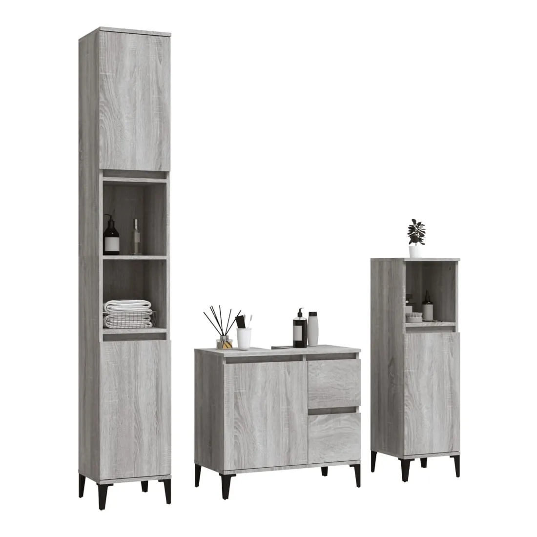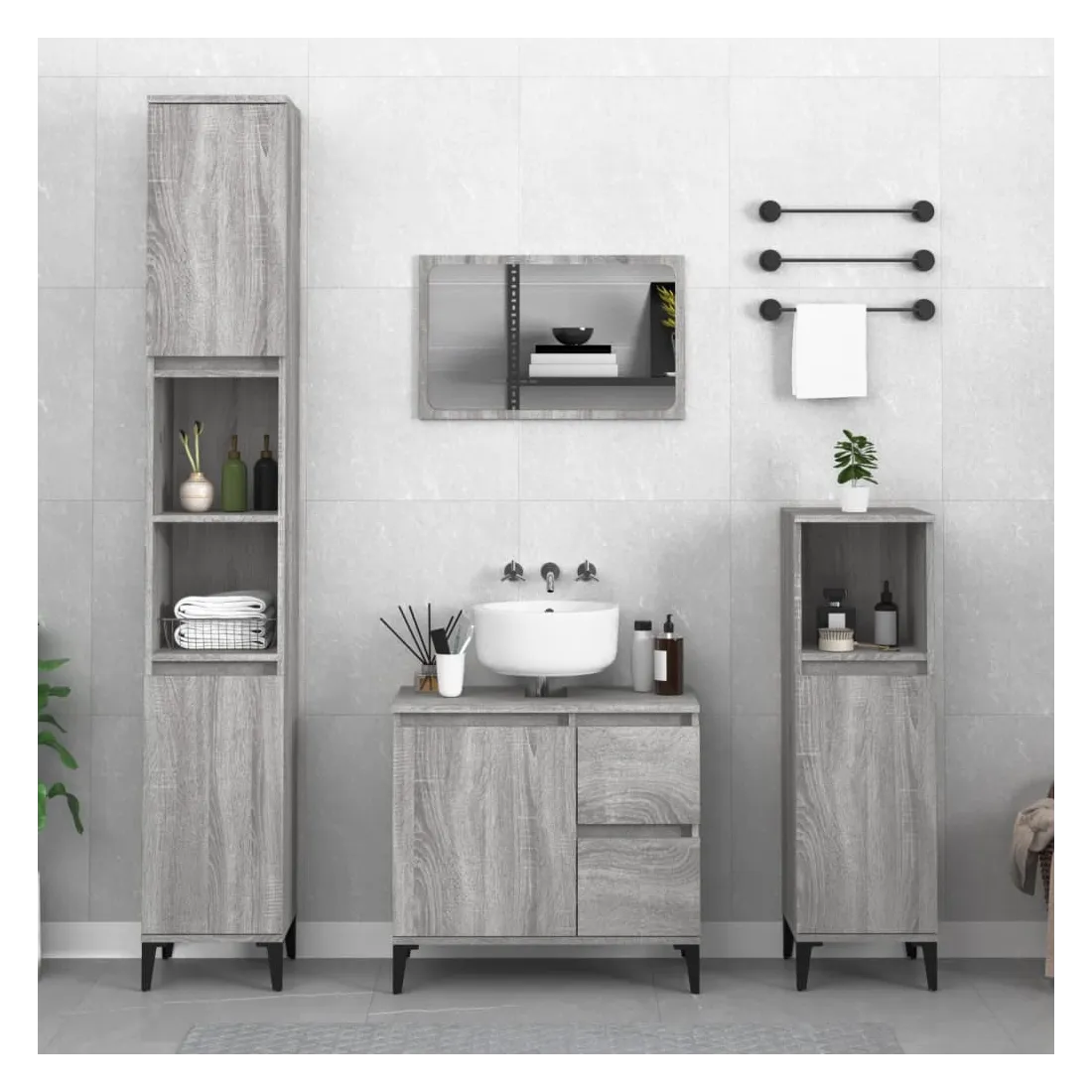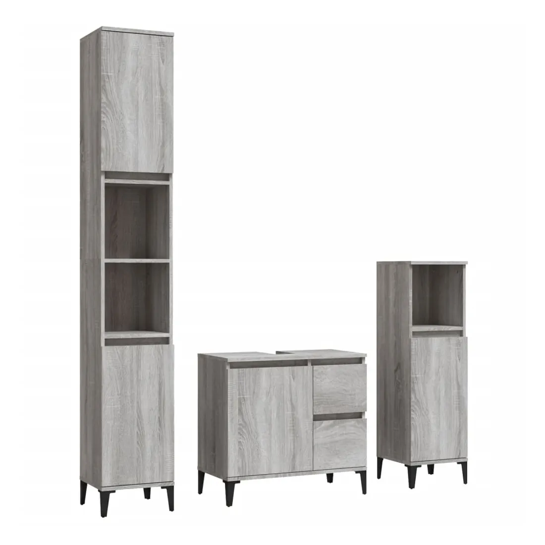 Cet ensemble d'armoires de salle de bain attrayant, avec un grand espace de rangement, présente un design élégant mais pratique. Matériau durable : le bois d'ingénierie est d'une qualité exceptionnelle avec une surface lisse et présente également résistance, stabilité et résistance à l'humidité. Grand espace de rangement : l'espace de rangement facilite l'organisation des articles dans ces meubles de salle de bain. Pieds en métal : les pieds en métal ajoutent un style moderne et calme à votre intérieur tout en assurant la stabilité.Surface facile à nettoyer : l'ensemble de salle de bain est facile à nettoyer avec un chiffon humide.Design élégant : les lignes épurées et le design élégant se fondent parfaitement dans votre salle de bain. Attention :Pour éviter qu'il ne soit renversé, ce produit doit être utilisé avec le dispositif de fixation au mur fourni. Bon à savoir :Les vis et les chevilles pour l'intérieur du mur ne sont pas incluses. Nous vous conseillons de trouver et d'utiliser des vis et des chevilles adaptées spécifiquement à vos murs. Si vous n'êtes pas sûr, vous pouvez consulter un professionnel. Veuillez lire et suivre chaque étape des instructions.