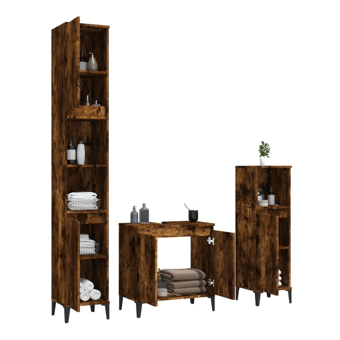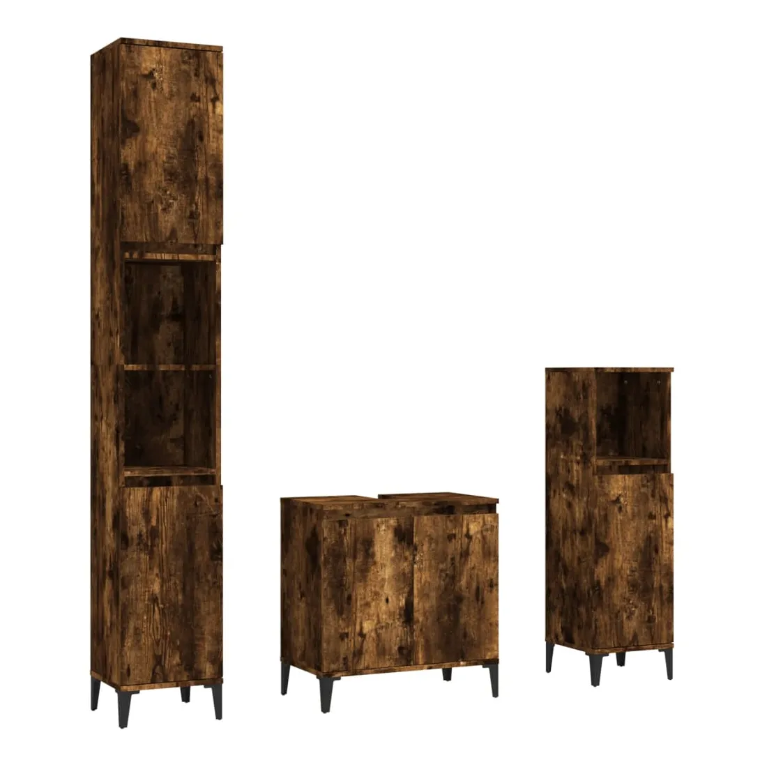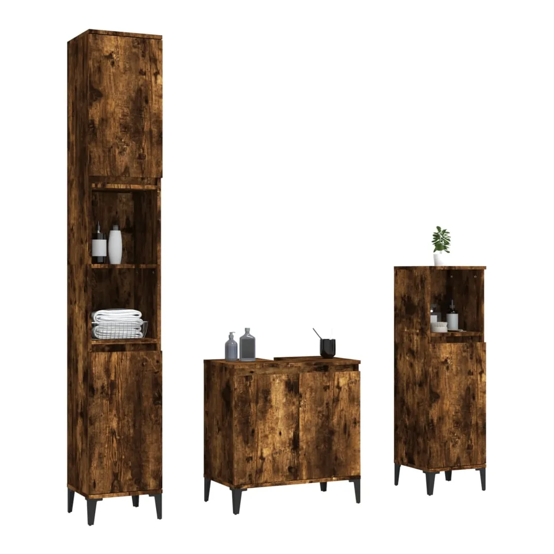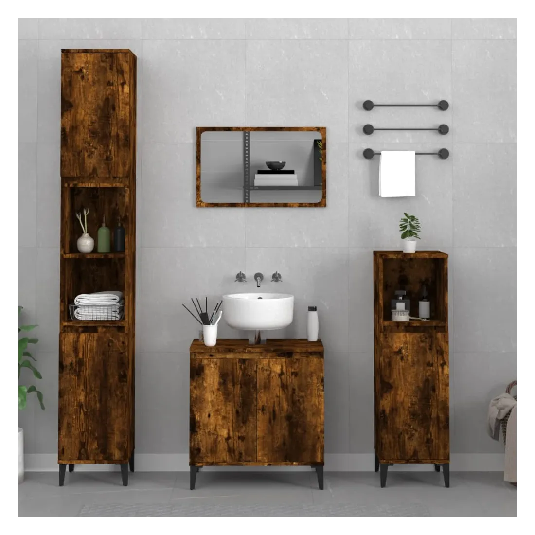 Cet ensemble de meubles de salle de bain, avec un espace de rangement spacieux, est un excellent supplément à votre salle de bain, ce qui lui donne une apparence ordonnée et saisissante ! Matériau durable : le bois d'ingénierie est d'une qualité exceptionnelle avec une surface lisse et présente également résistance, stabilité et résistance à l'humidité.Grand espace de rangement : ces armoires de salle de bain offrent un grand espace de rangement pour garder vos fournitures de salle de bain bien organisées.Pieds en métal : les pieds en métal ajoutent un style moderne et calme à votre intérieur tout en assurant la stabilité.Surface facile à nettoyer : l'ensemble de salle de bain est facile à nettoyer avec un chiffon humide.Design élégant : les lignes épurées et le design élégant se fondent parfaitement dans votre salle de bain. Attention :Pour éviter qu'il ne soit renversé, ce produit doit être utilisé avec le dispositif de fixation au mur fourni. Bon à savoir :Les vis et les chevilles pour l'intérieur du mur ne sont pas incluses. Nous vous conseillons de trouver et d'utiliser des vis et des chevilles adaptées spécifiquement à vos murs. Si vous n'êtes pas sûr, vous pouvez consulter un professionnel. Veuillez lire et suivre chaque étape des instructions.