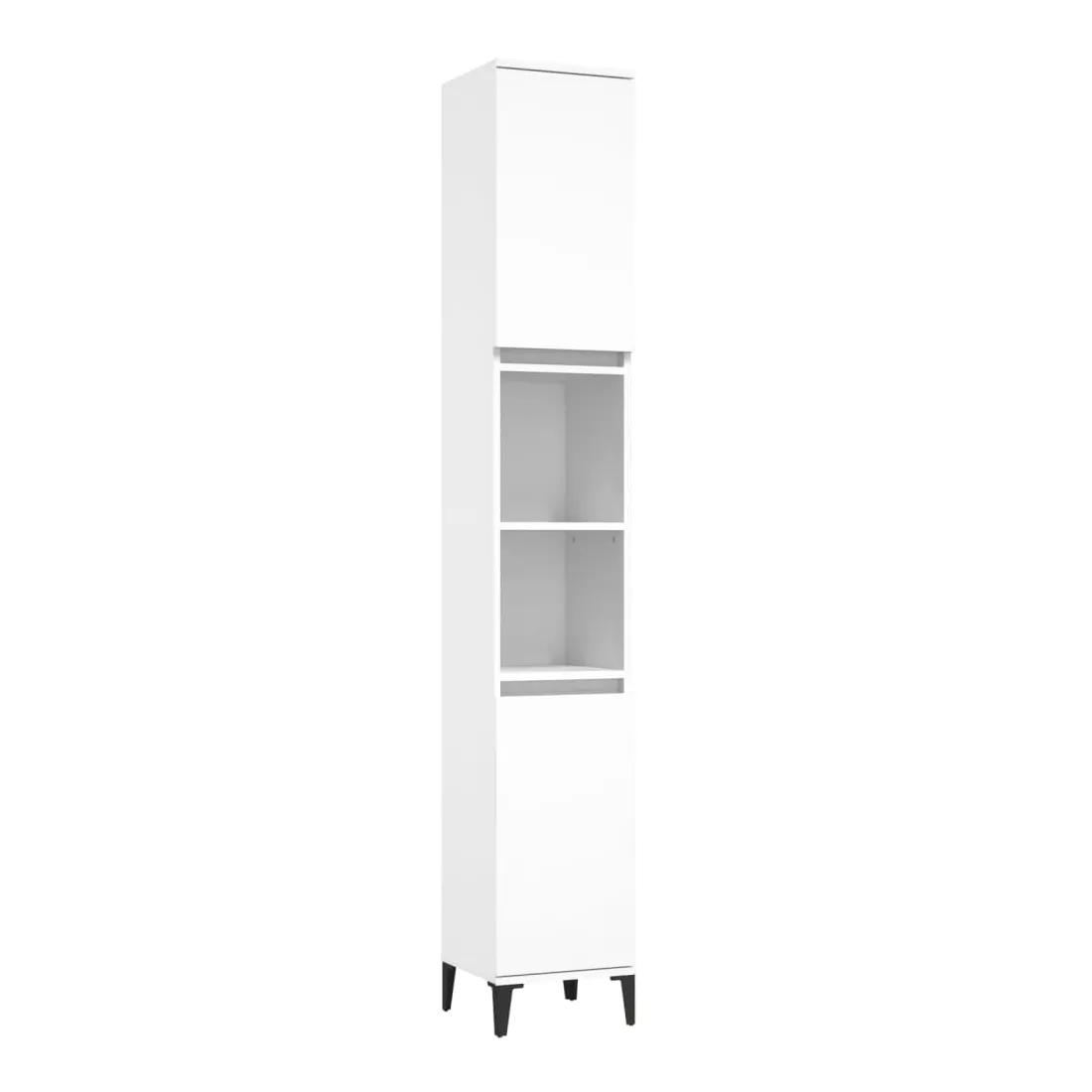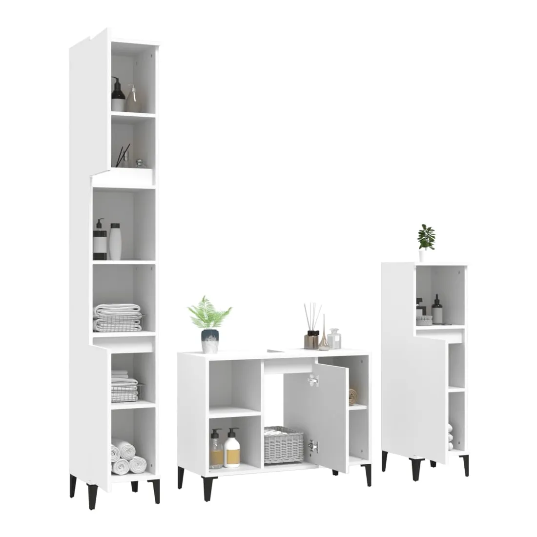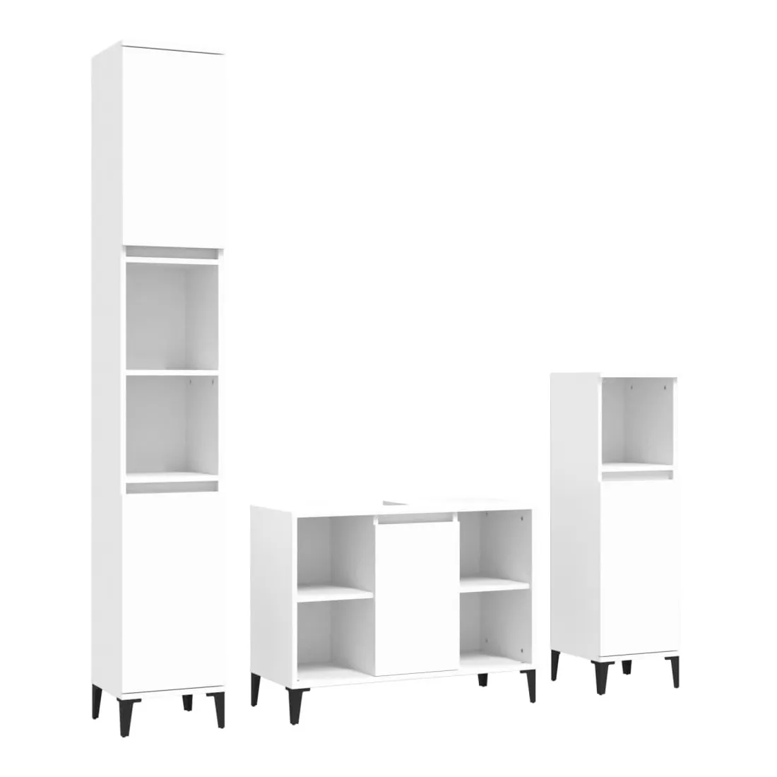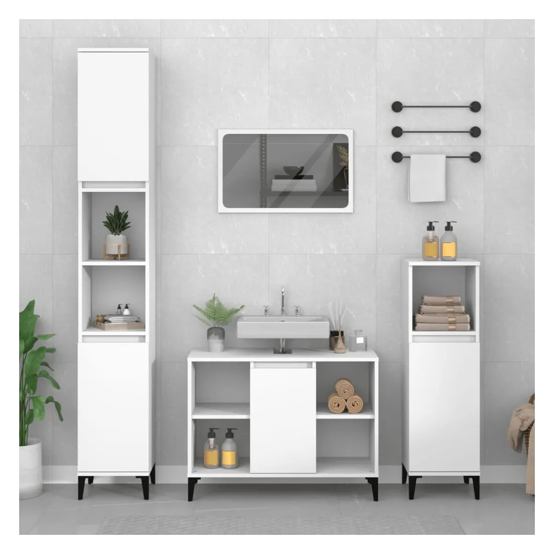 Cet ensemble de meubles de salle de bain, avec un espace de rangement spacieux, est un excellent supplément à votre salle de bain, ce qui lui donne une apparence ordonnée et saisissante ! Matériau durable : le bois d'ingénierie est d'une qualité exceptionnelle avec une surface lisse et présente également résistance, stabilité et résistance à l'humidité.Grand espace de rangement : ces armoires de salle de bain offrent un grand espace de rangement pour garder vos fournitures de salle de bain bien organisées.Pieds en métal : les pieds en métal ajoutent un style moderne et calme à votre intérieur tout en assurant la stabilité.Surface facile à nettoyer : l'ensemble de salle de bain est facile à nettoyer avec un chiffon humide.Design élégant : les lignes épurées et le design élégant se fondent parfaitement dans votre salle de bain. Attention :Pour éviter qu'il ne soit renversé, ce produit doit être utilisé avec le dispositif de fixation au mur fourni. Bon à savoir :Les vis et les chevilles pour l'intérieur du mur ne sont pas incluses. Nous vous conseillons de trouver et d'utiliser des vis et des chevilles adaptées spécifiquement à vos murs. Si vous n'êtes pas sûr, vous pouvez consulter un professionnel. Veuillez lire et suivre chaque étape des instructions.